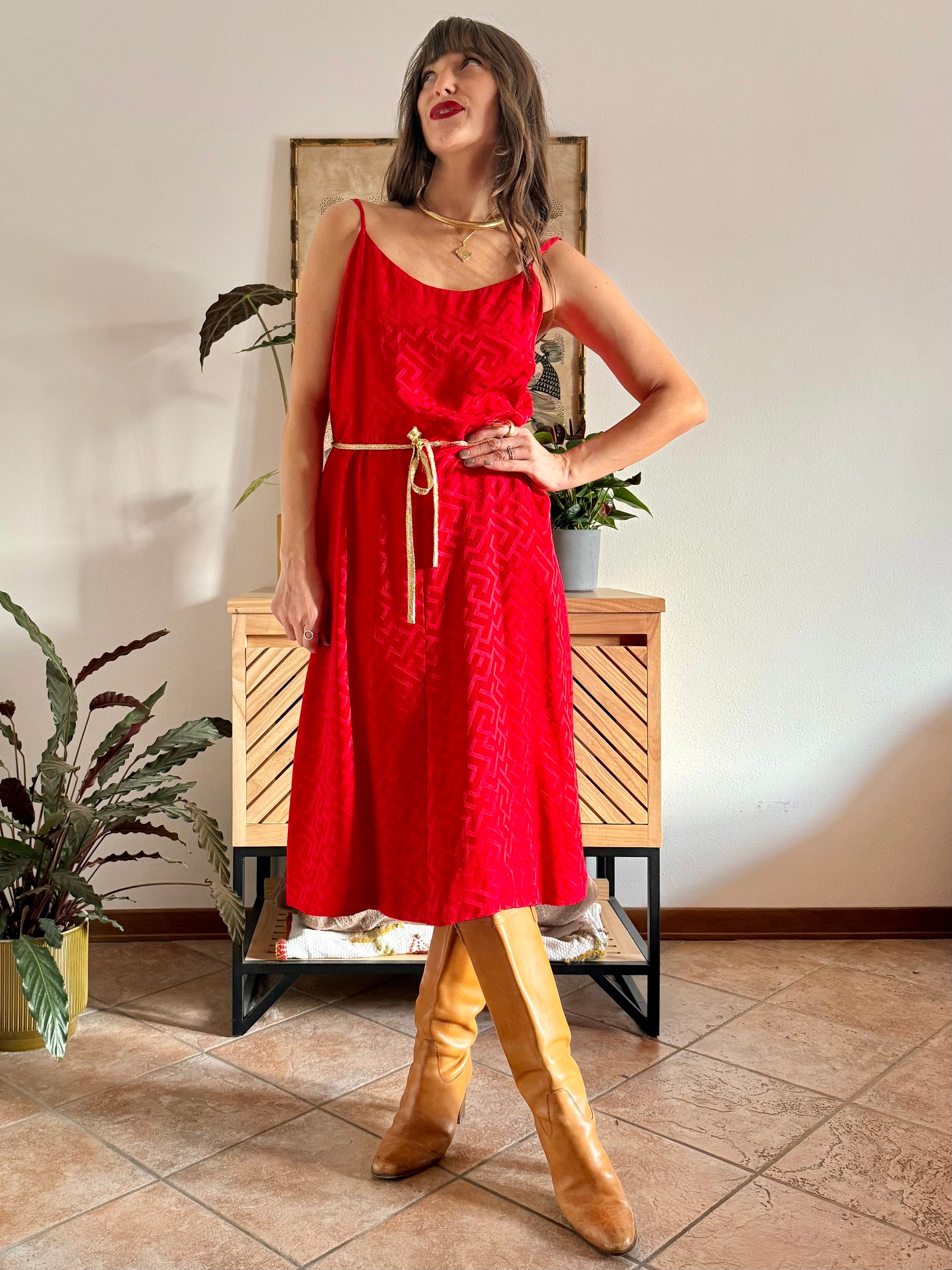 100% silk. Chery red woven geometric pattern with metallic gold trimming and details. Midi dress and jackets set. Custom made in Siena Italy. Size M (Dress: bust 47cm, waist 38cm, hips 56cm, total length 111cm Jacket: shoulders 42cm, bust 54cm, total length 64cm) all measurements taken flat from seam to seam