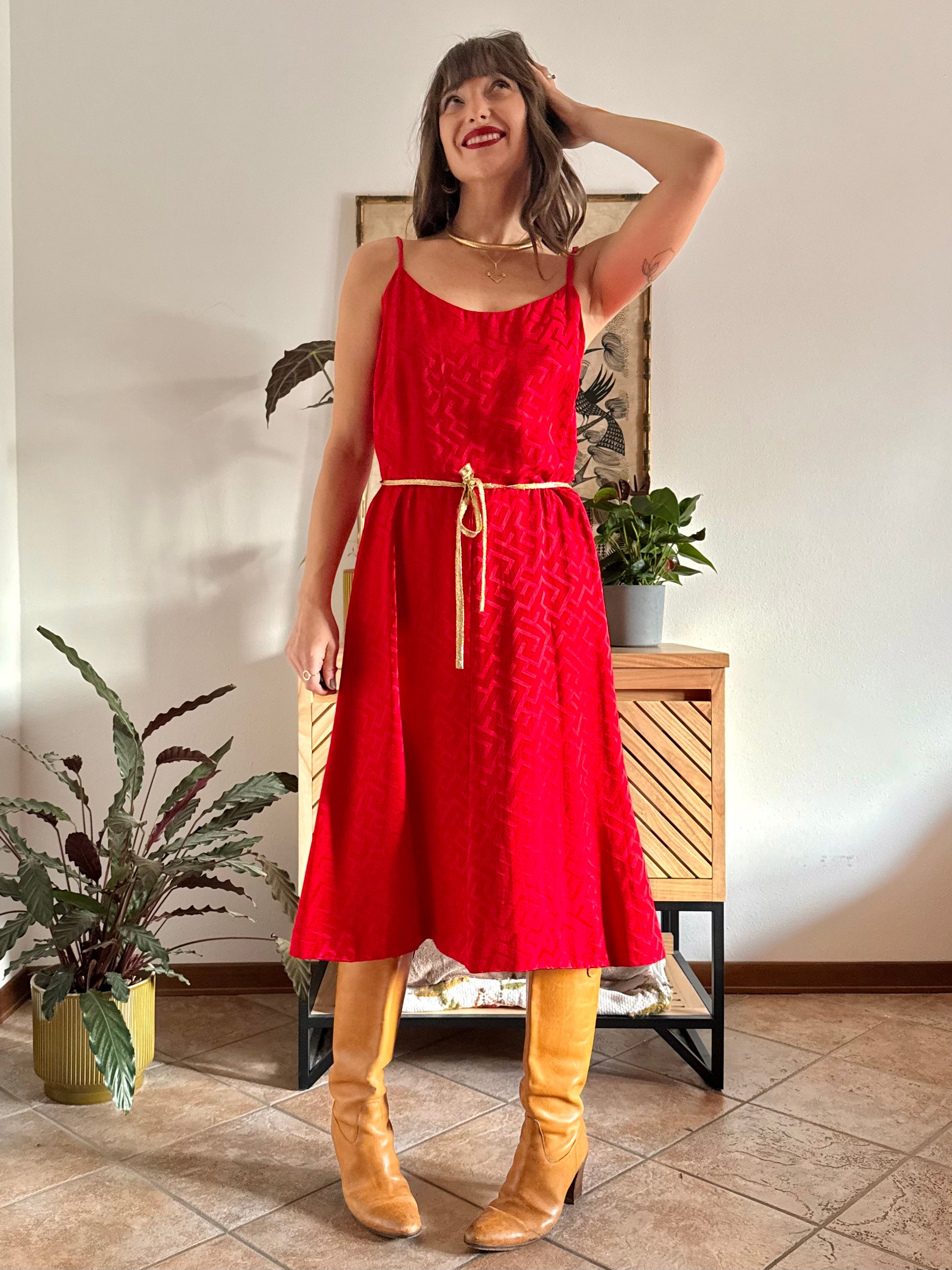 1960's vintage cherry red woven silk dress and jacket set with gold metallic trimming details