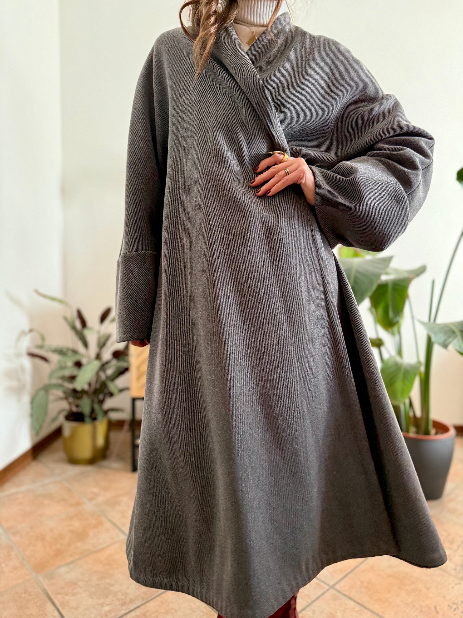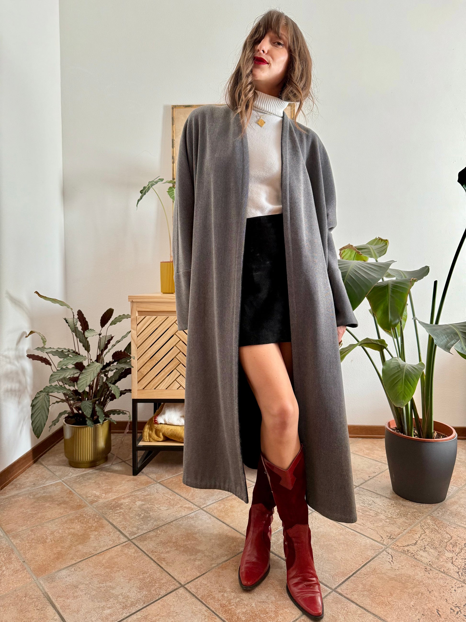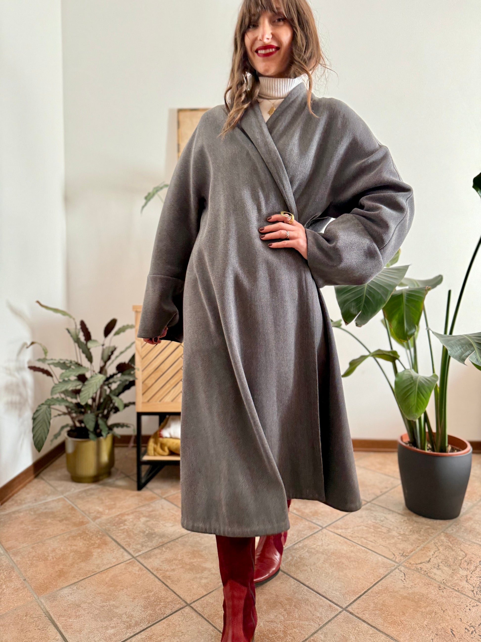 100% wool. Grey tweed woven wool. Black felted wool lining. Flowy cut. No closure. Custom tailored in Siena Italy. One size (shoulders 44cm, total length 122cm) all measurements taken flat from seam to seam