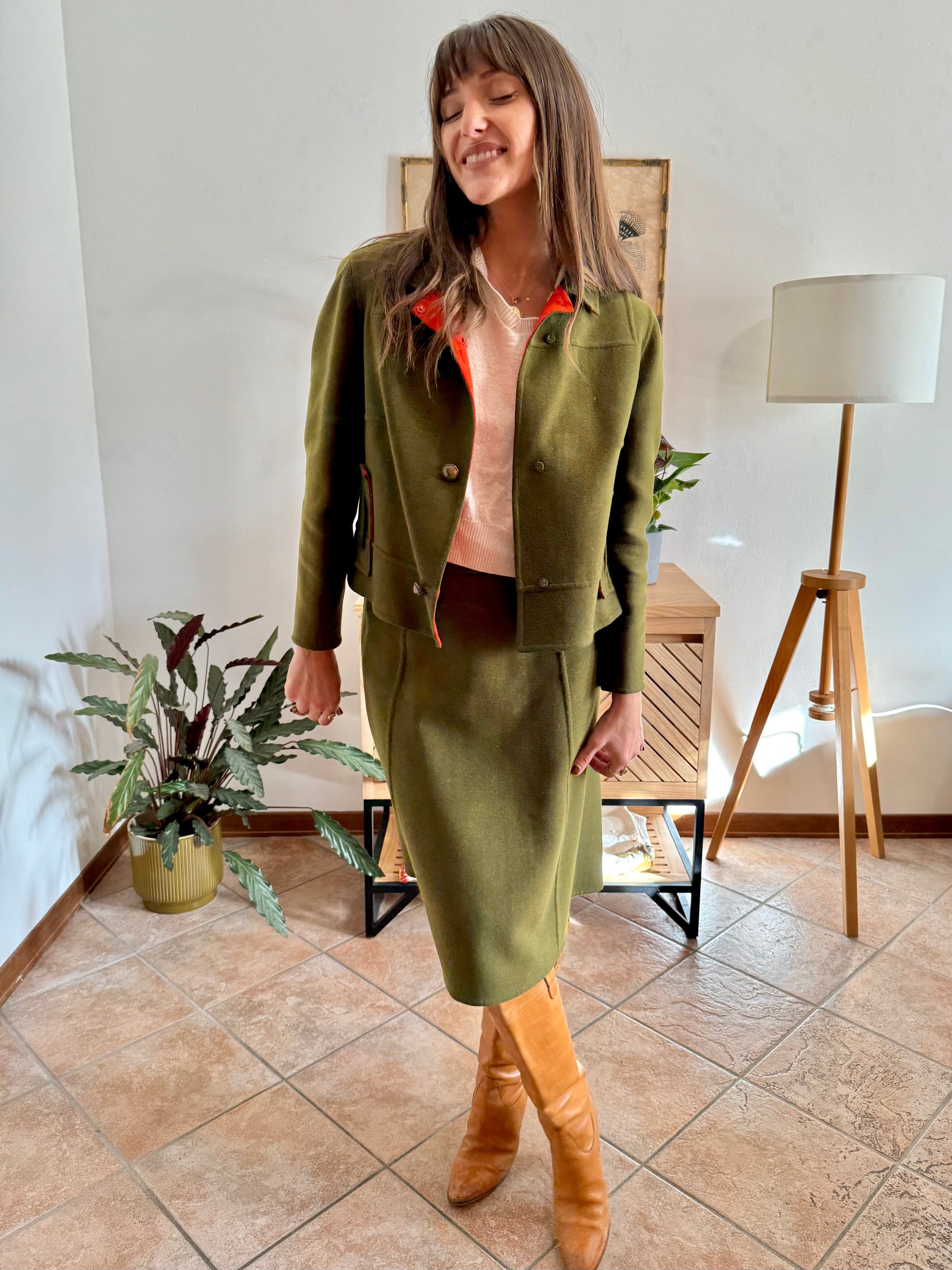 1960's vintage military green tweed wool blazer and skirt set with red lining