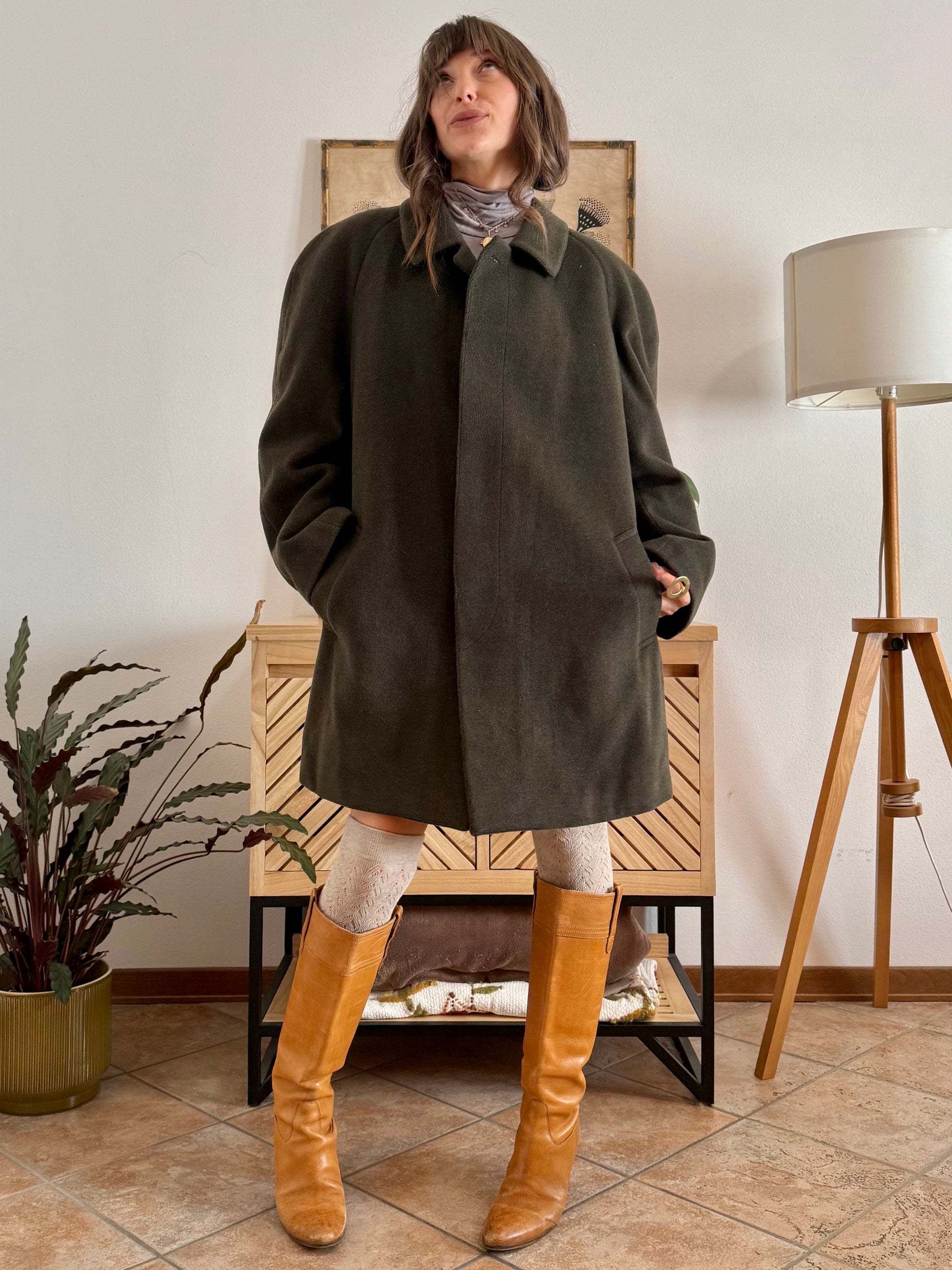 100% wool. Military green wool exterior with chocolate brown quilted lining. Military green buttons. Made in Italy. Size L (shoulders 48cm, bust 64cm, total length 94cm) all measurements taken flat from seam to seam