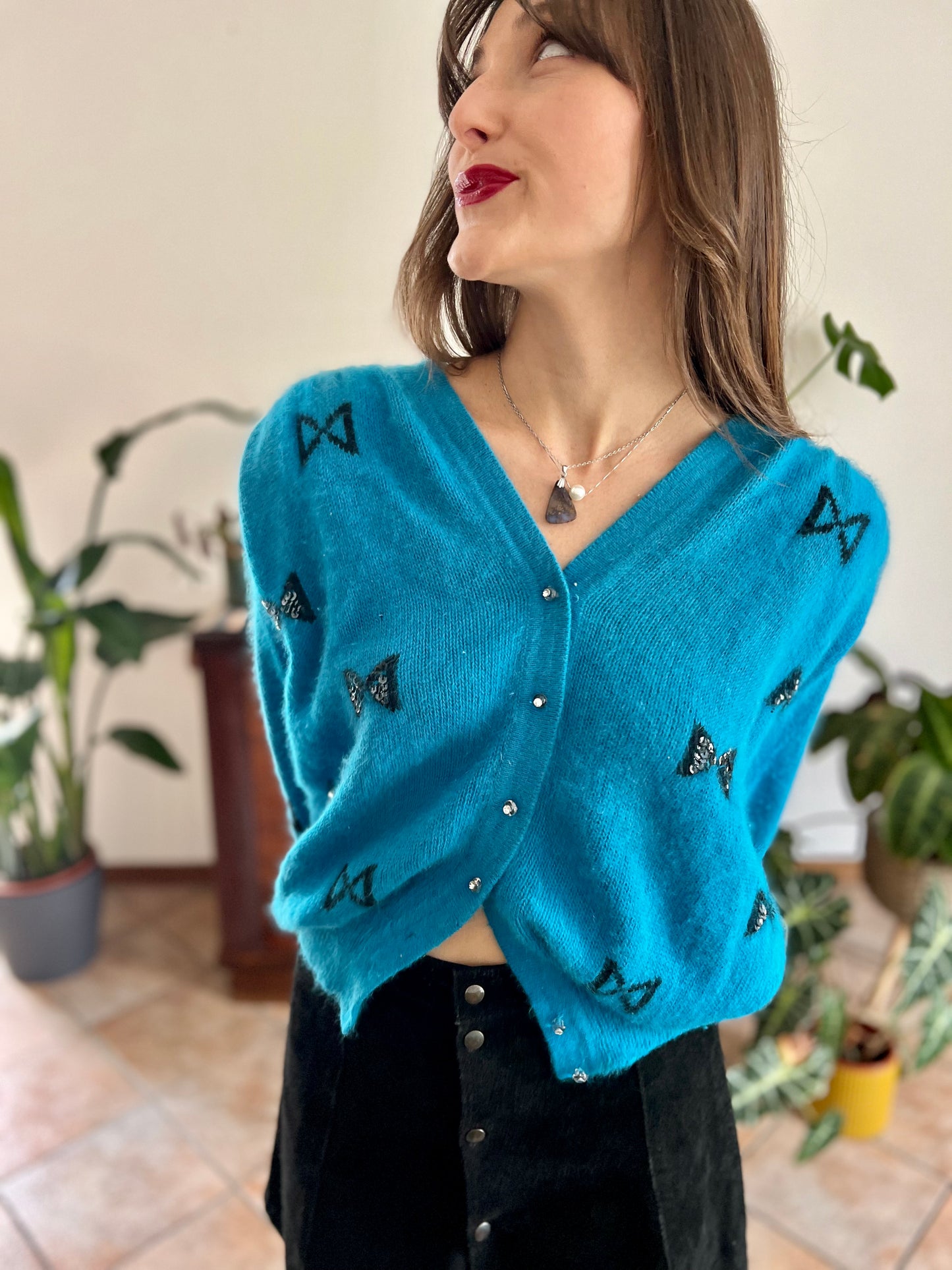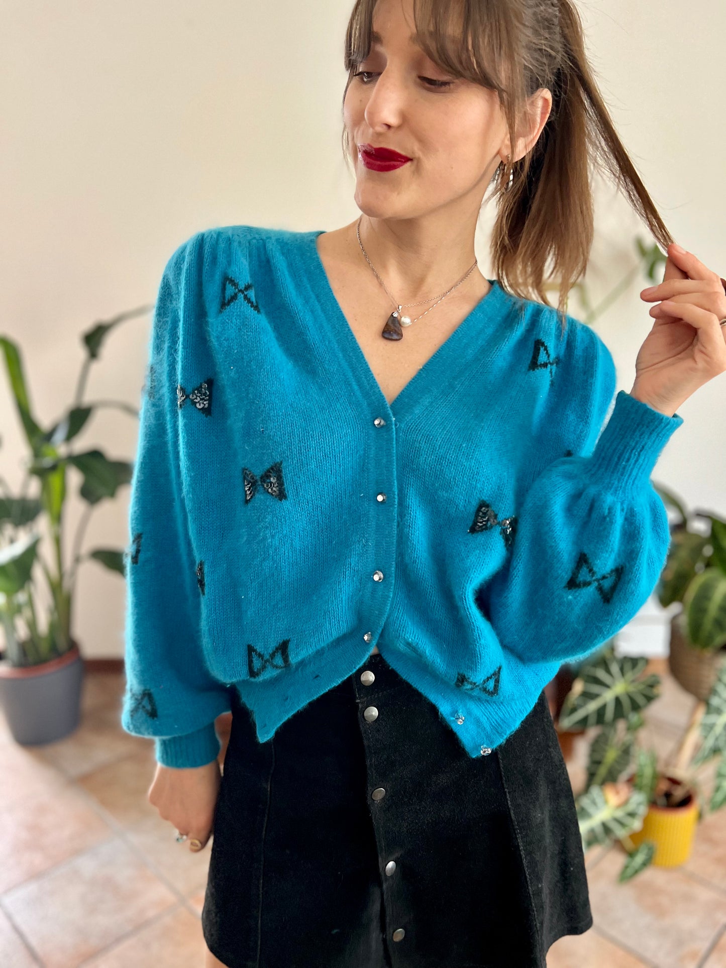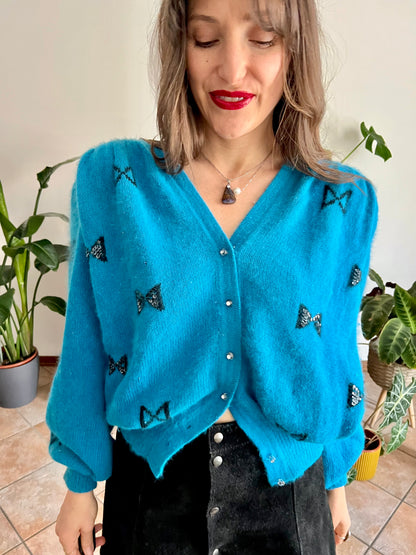 1960's vintage turquoise angora cardigan with black bow details