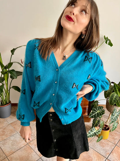 70% angor 30% wool. Turquoise texture knit with black bow knit pattern. Sequin details. Rhinestone buttons. Ballon sleeves with ruffle details on shoulder. Made in Italy. Size L (shoulders44cm, bust 63cm, total length 60cm) all measurements are taken from seam to seam