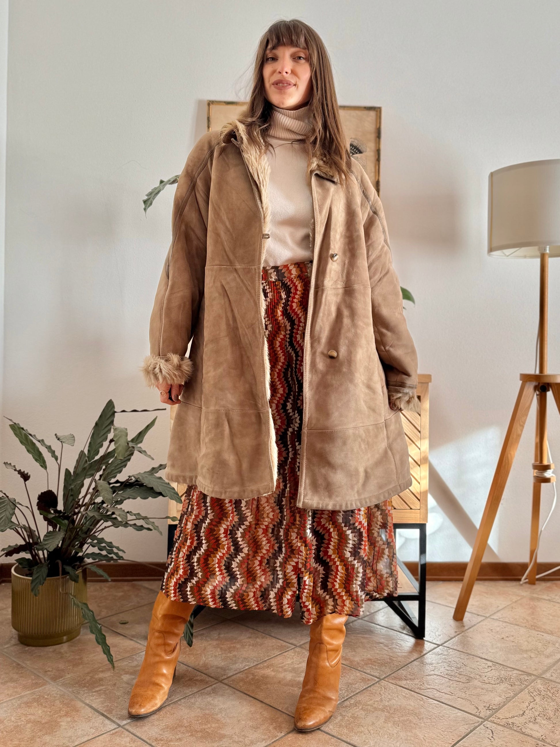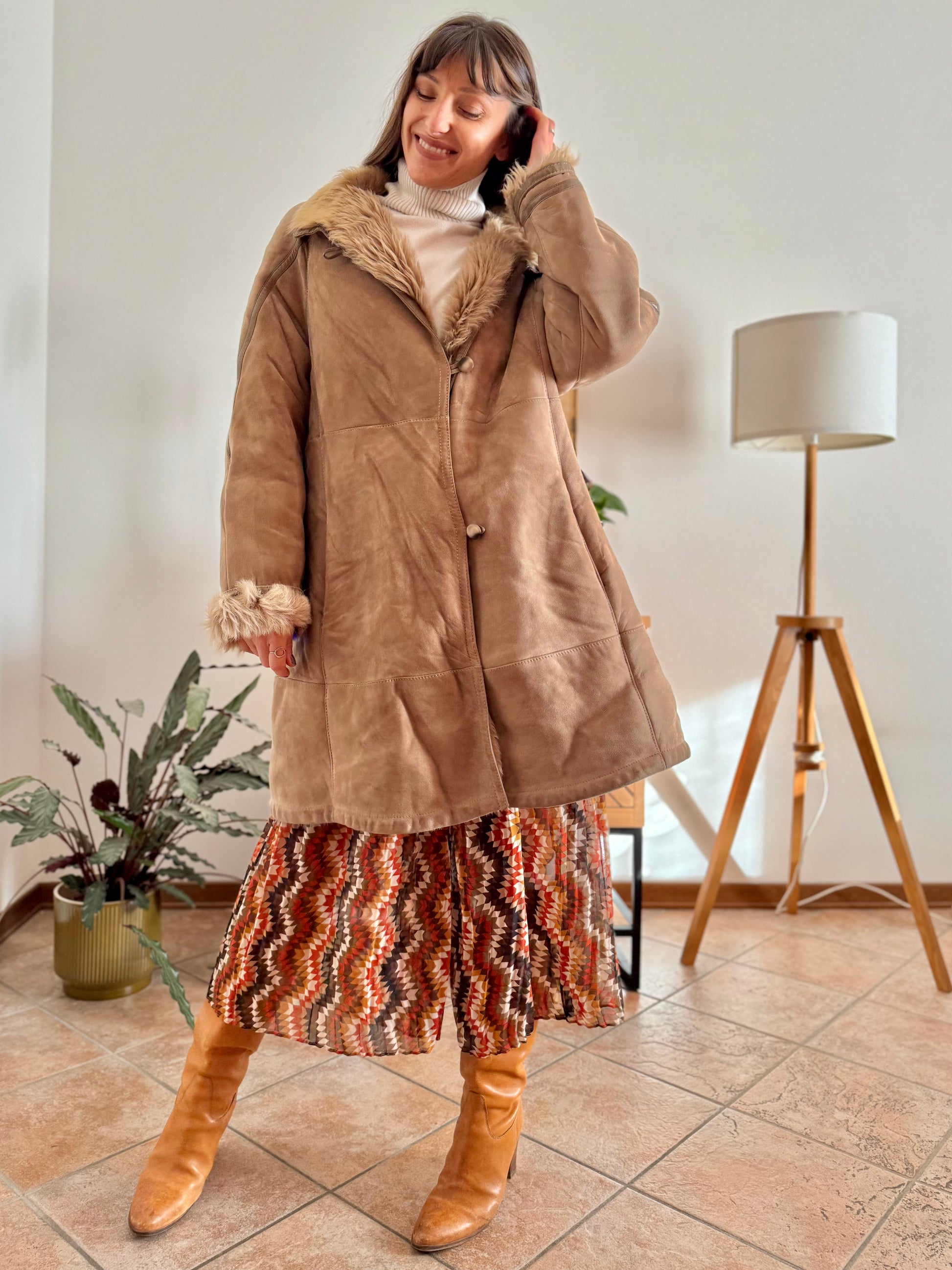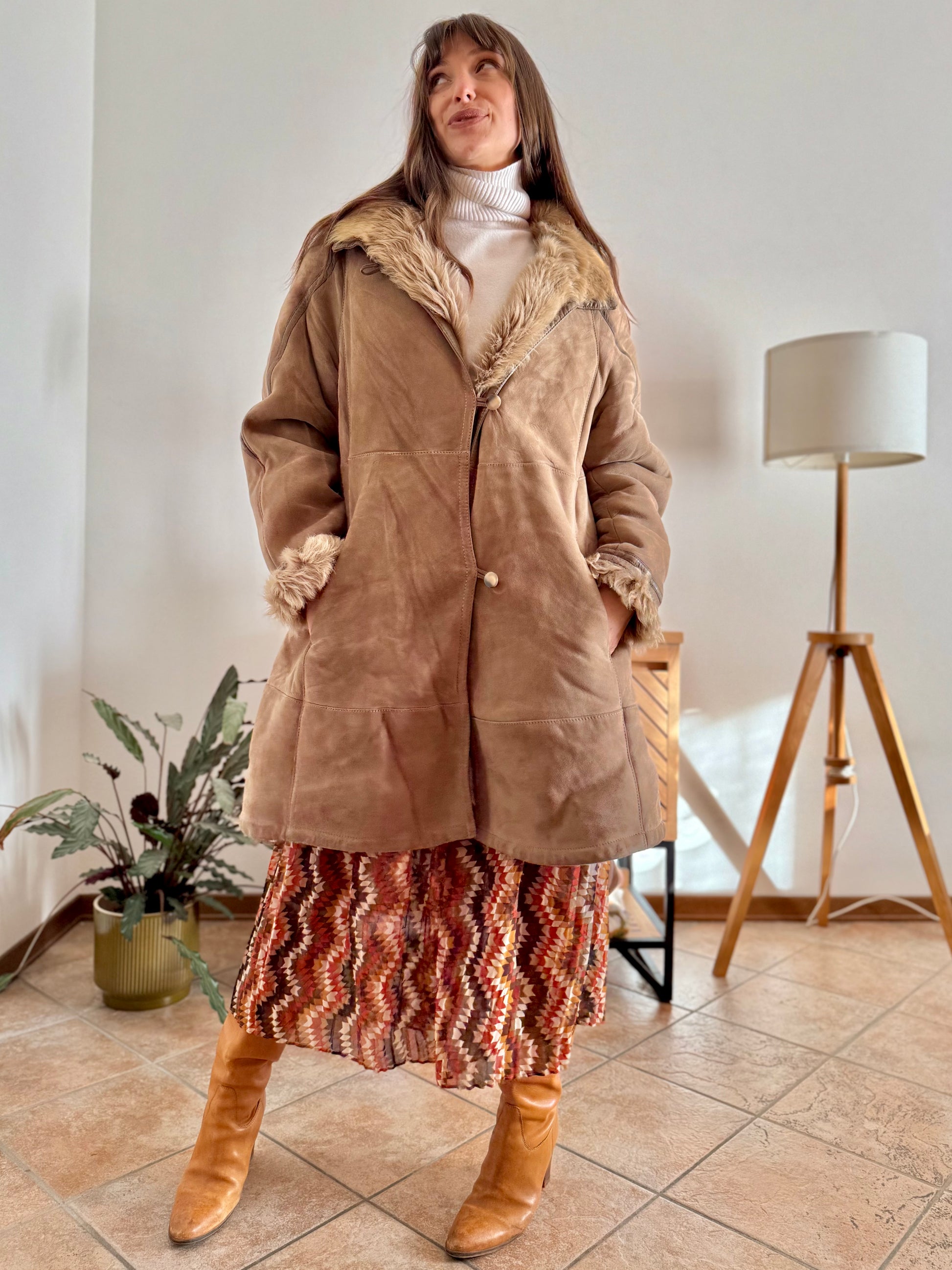 100% genuine shearling leather. Beige suede exterior with leather detailing beige wool lining. Multicolor buttons. Made in Italy. Size L (shoulders 46cm, bust 55cm, total length 95cm) all measurements taken flat from seam to seam