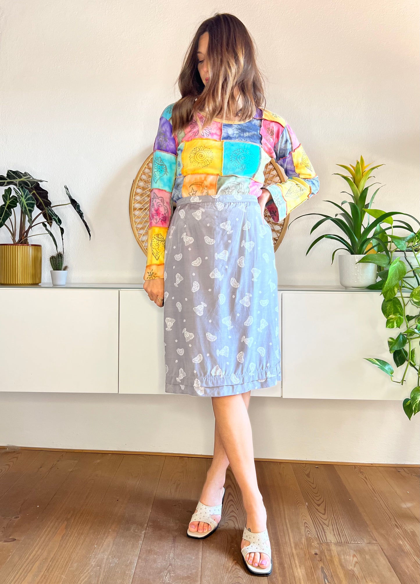 Gonna midi grigia vintage anni '70 con stampa indiana bianca