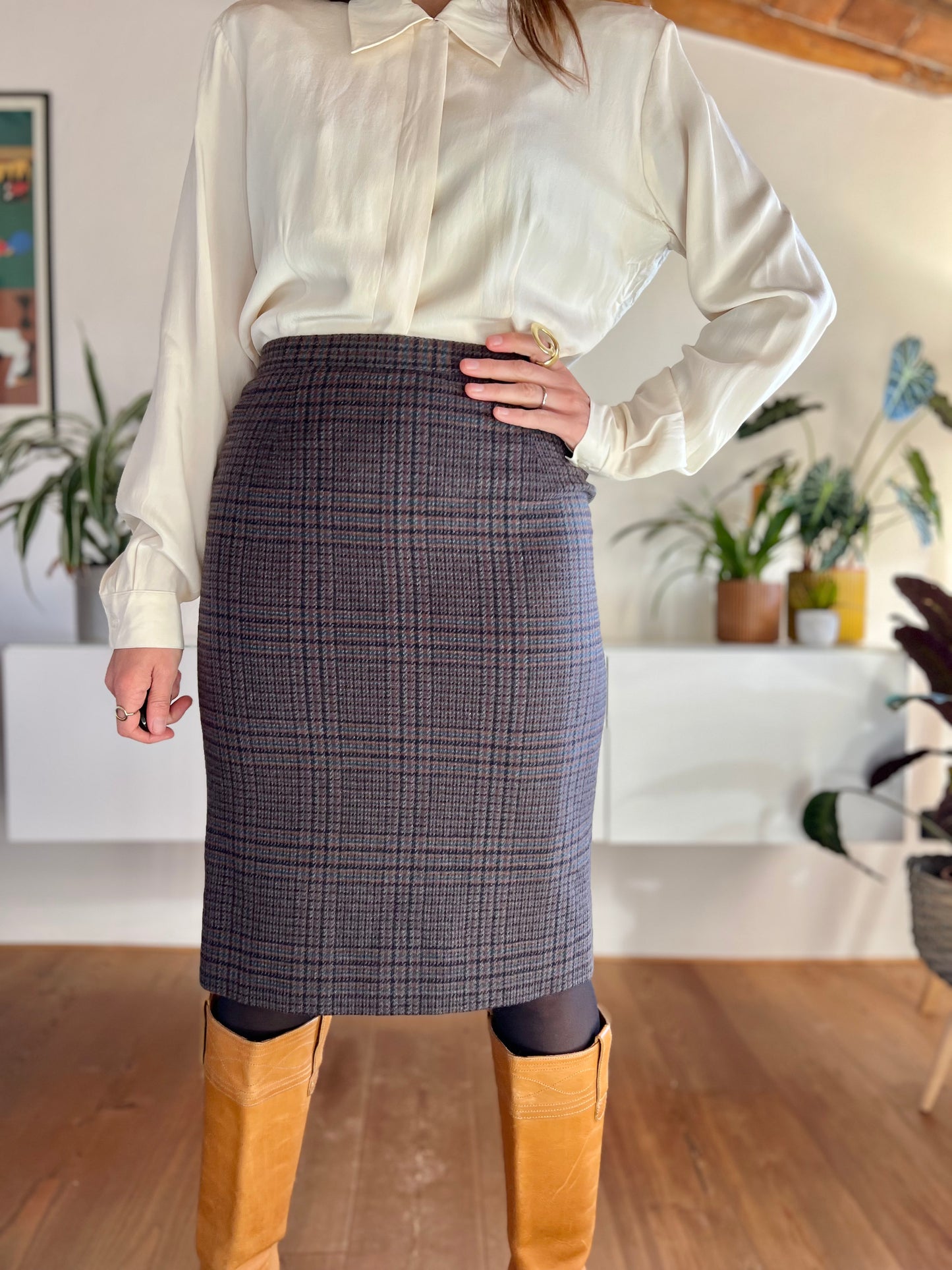 50% wool 50% alpaca. Grey, navy blue, tan and turquoise plaid. Navy blue satin lining. Darted waist. Made in Italy. Size M (waist 33cm, hips 46cm, total length 60cm) all measurements taken flat from seam to seam