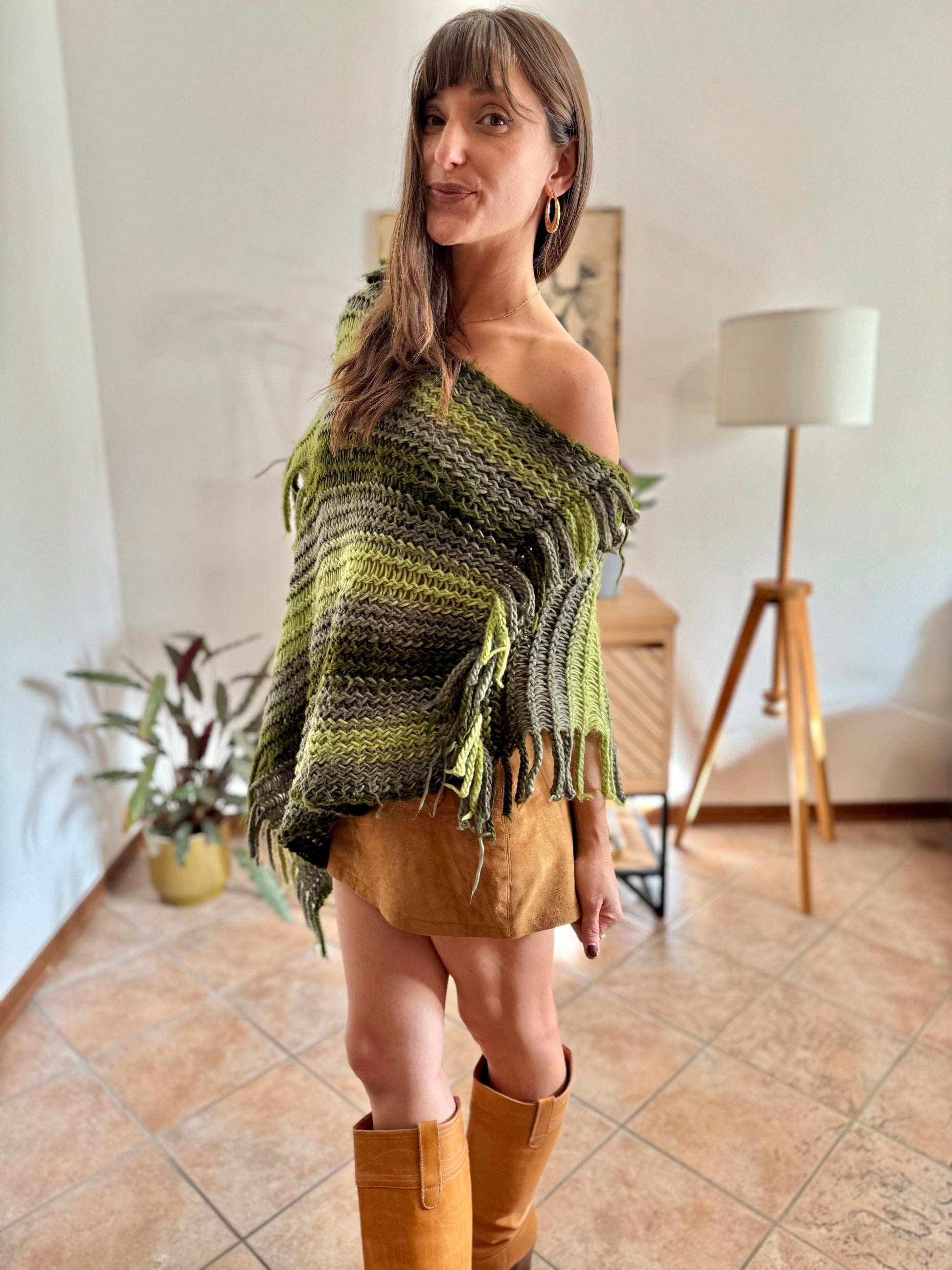 1970's vintage hand knit multi-tonal green stripe hand knit poncho with fringe detailing