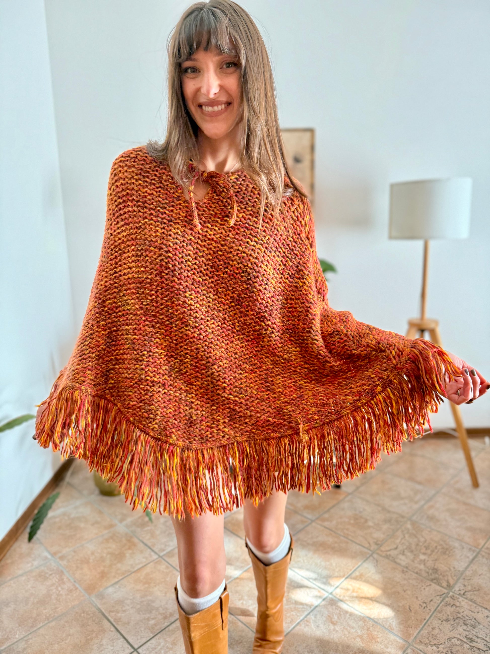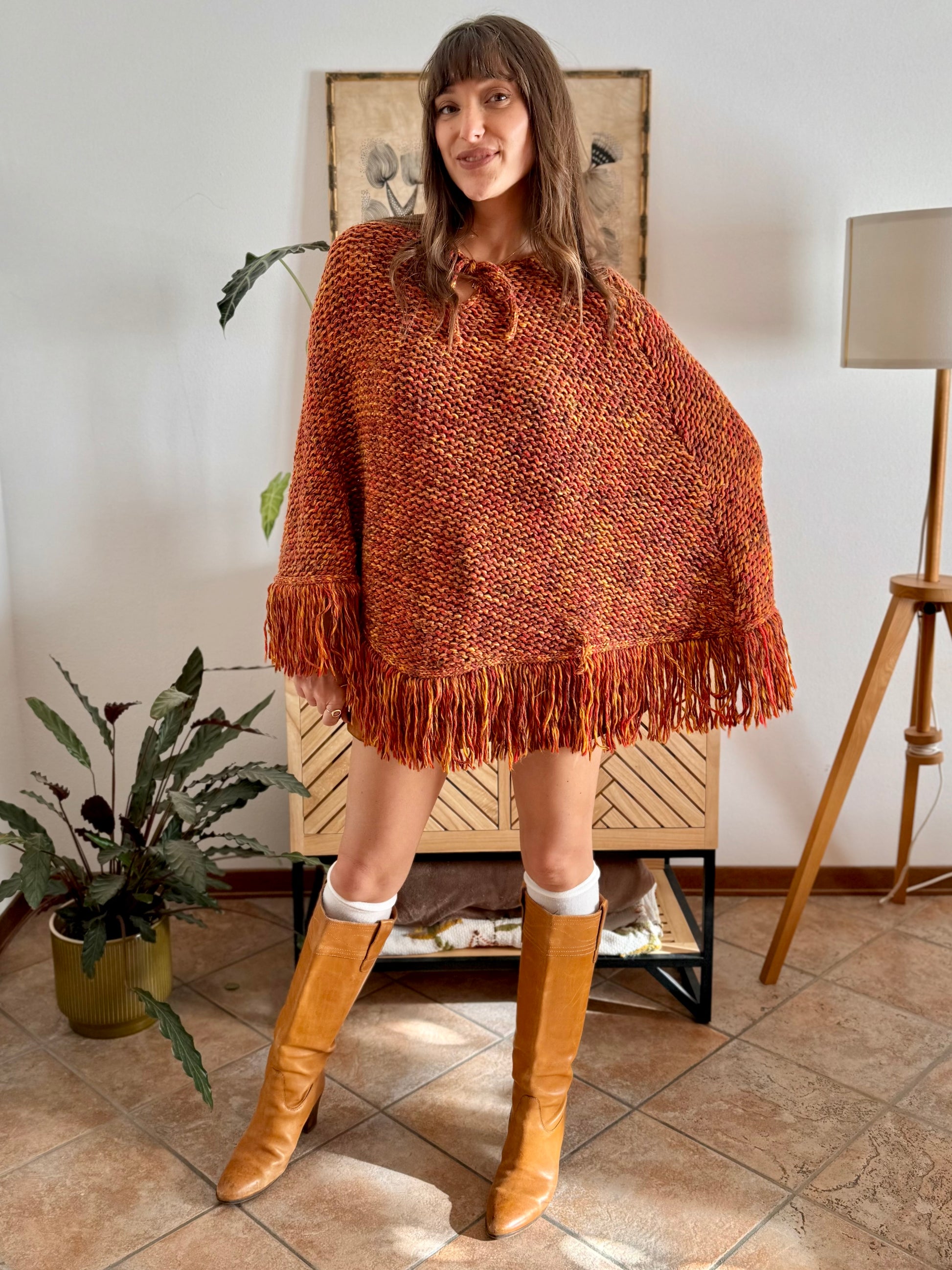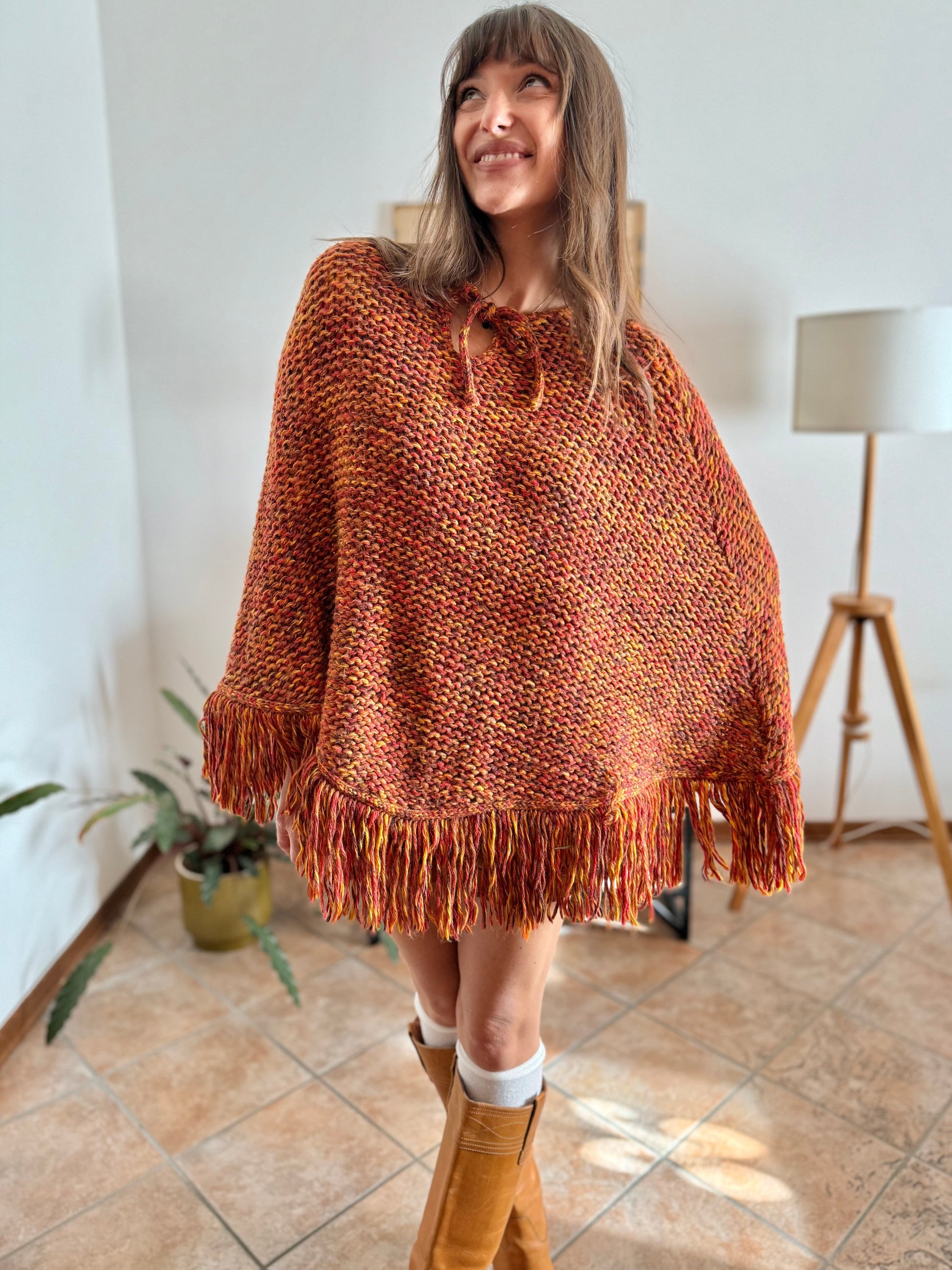 1970's vintage yellow and burgundy knit poncho with fringe details