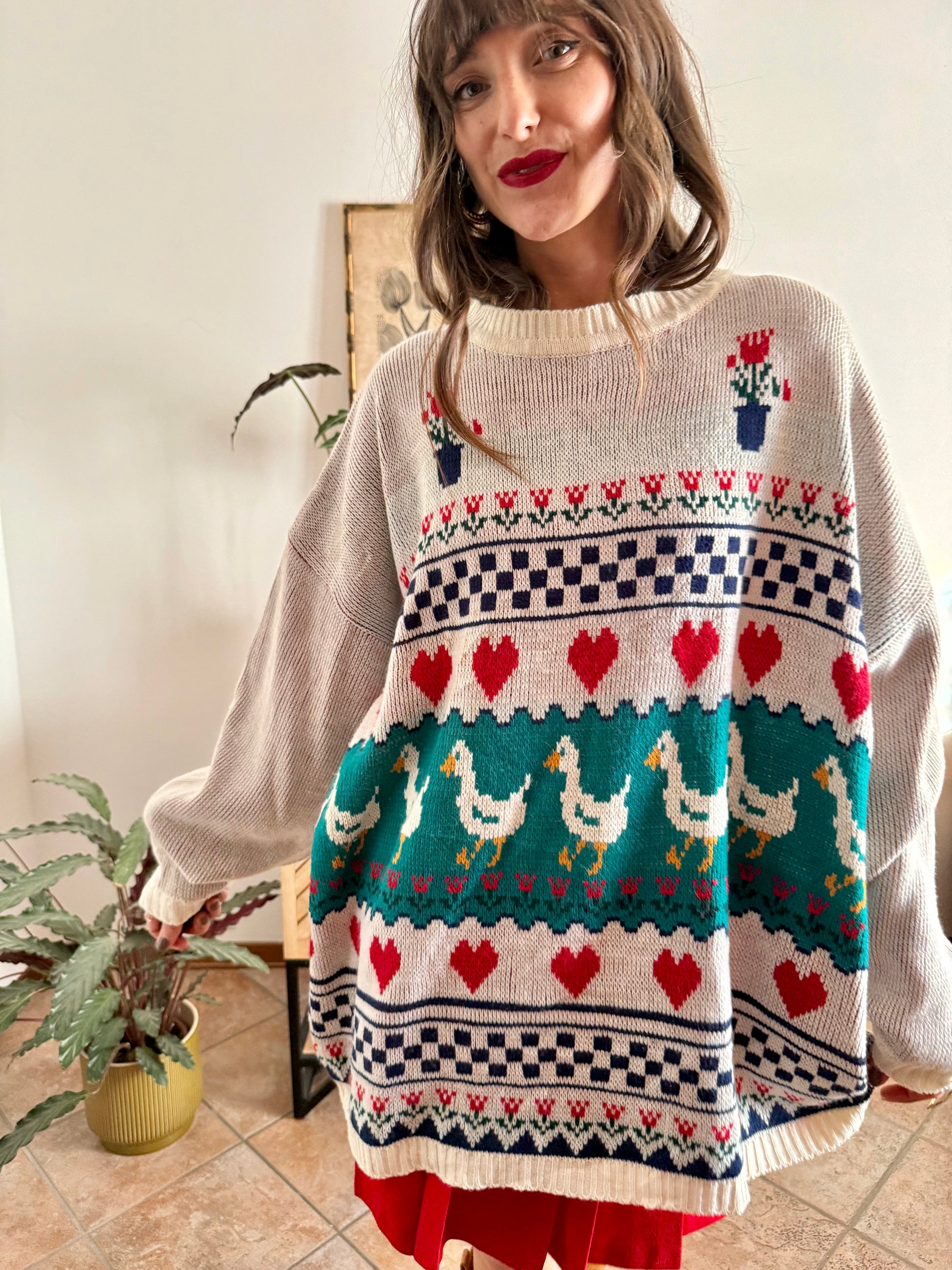 1980's vintage red, green and turquoise duck pattern knit pullover
