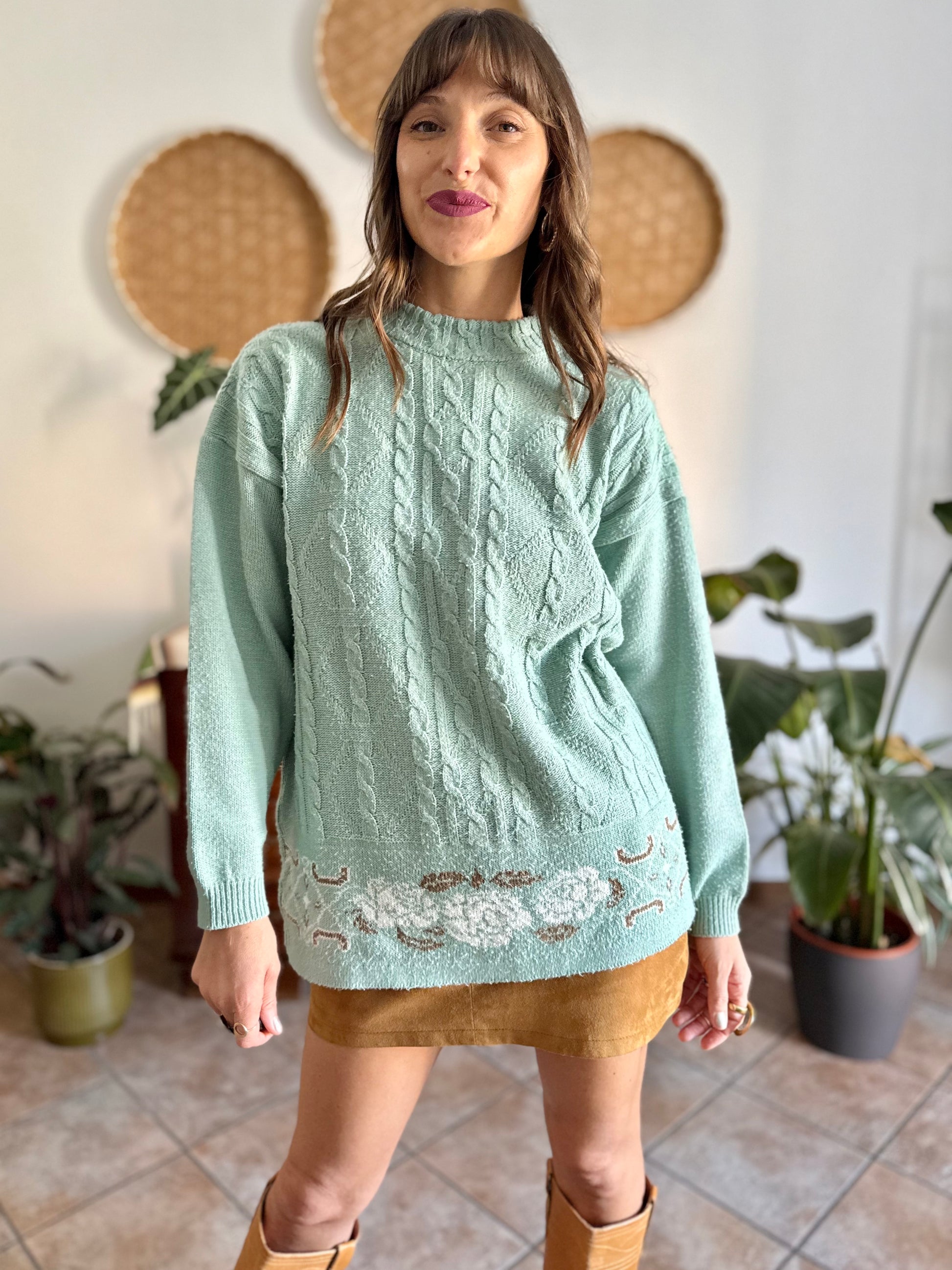 1980's vintage wool turquoise knit pullover with tan floral pattern