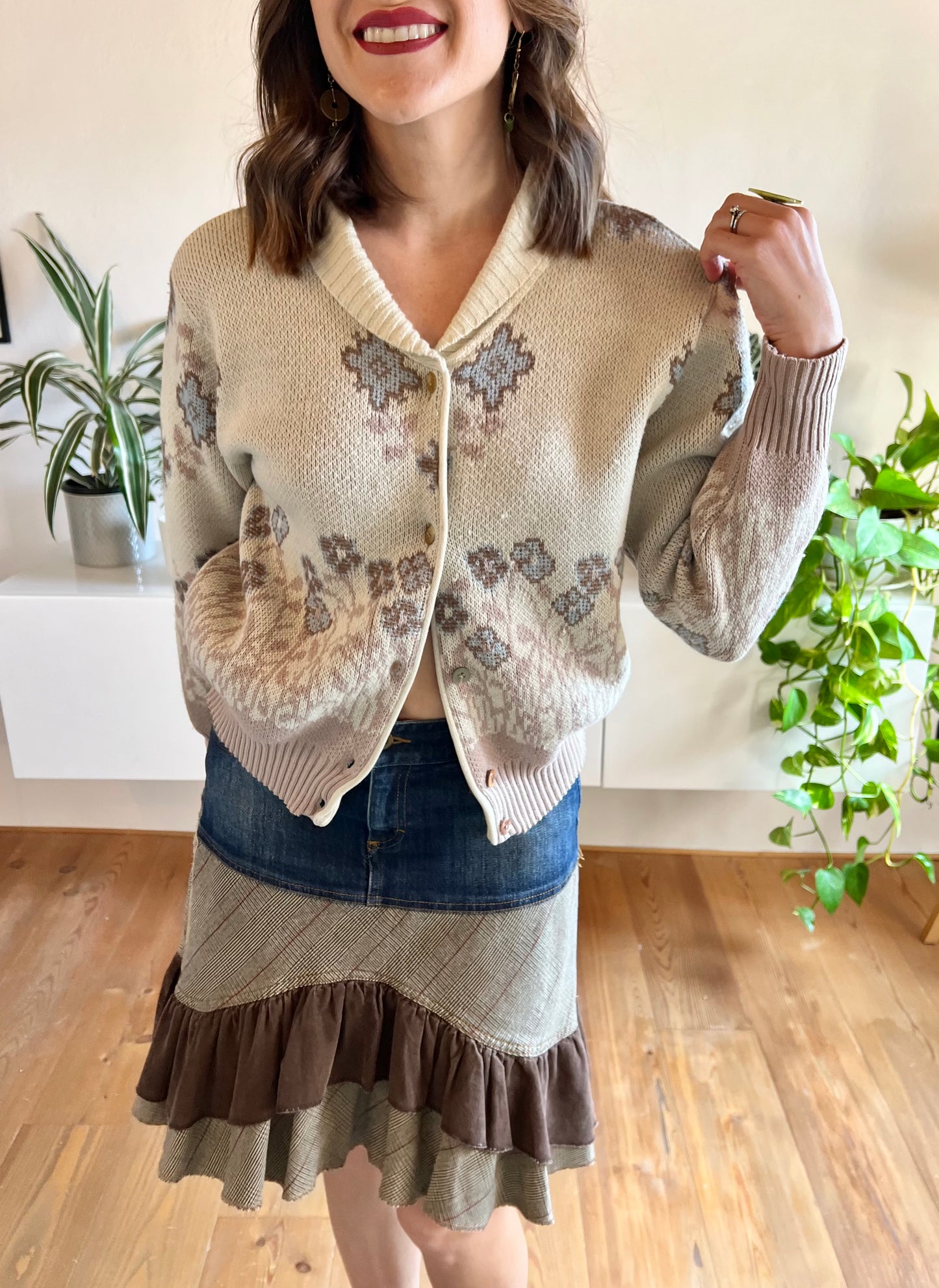 Cardigan primaverile vintage anni '80 con motivo floreale beige e blu