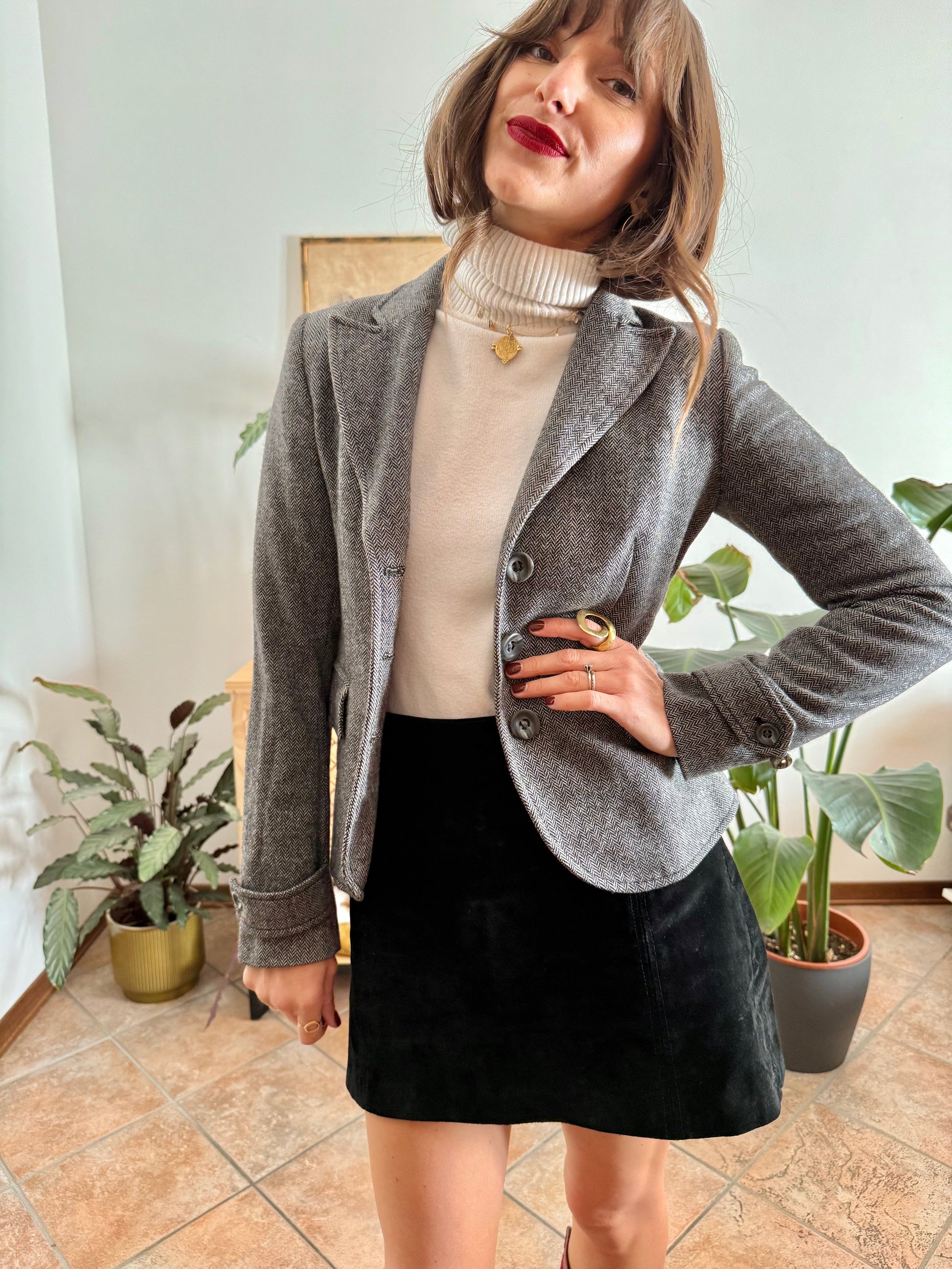 Y2k vintage wool blend black and grey tweed fitted blazer