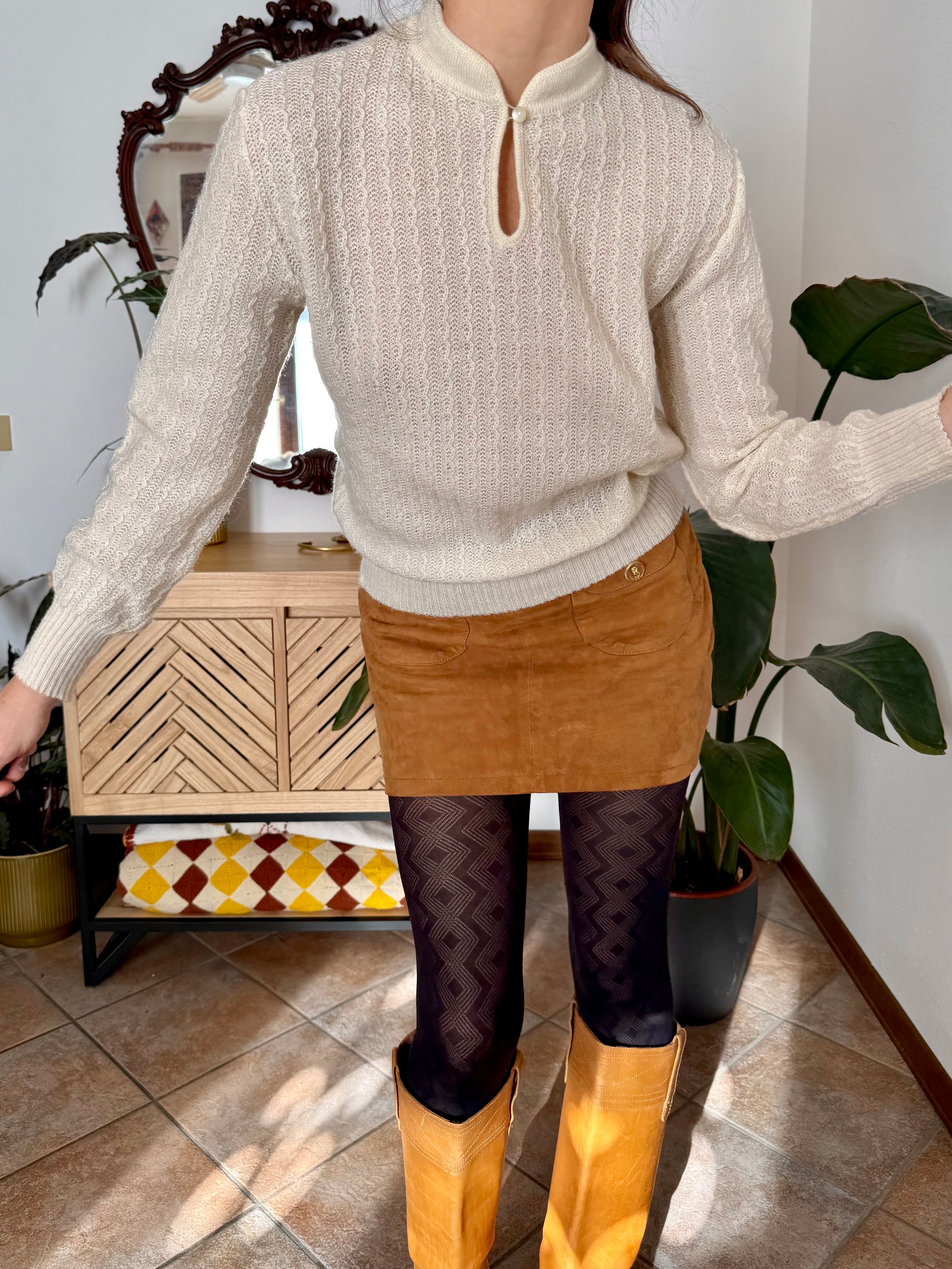 1960's vintage cream knit wool pullover with button collar detail
