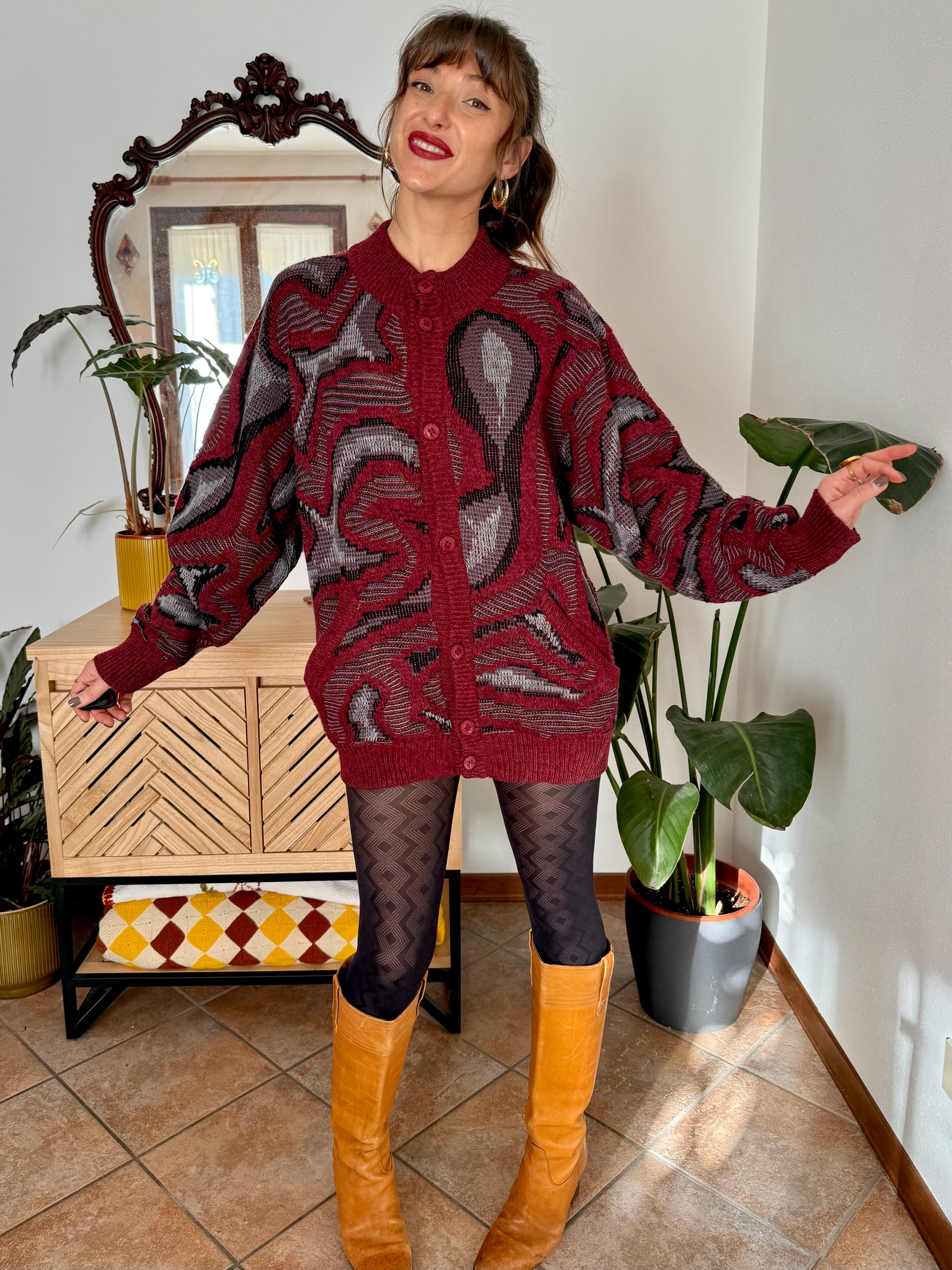50% wool 50% acrylic. Burgundy, grey, and black abstract pattern knit. Button down. Two pockets. Can be worn as a knit mini dress or an oversize cardigan. Made in Italy. size M (shoulders 58cm, bust 58cm, total length 75cm) all measurements taken flat from seam to seam