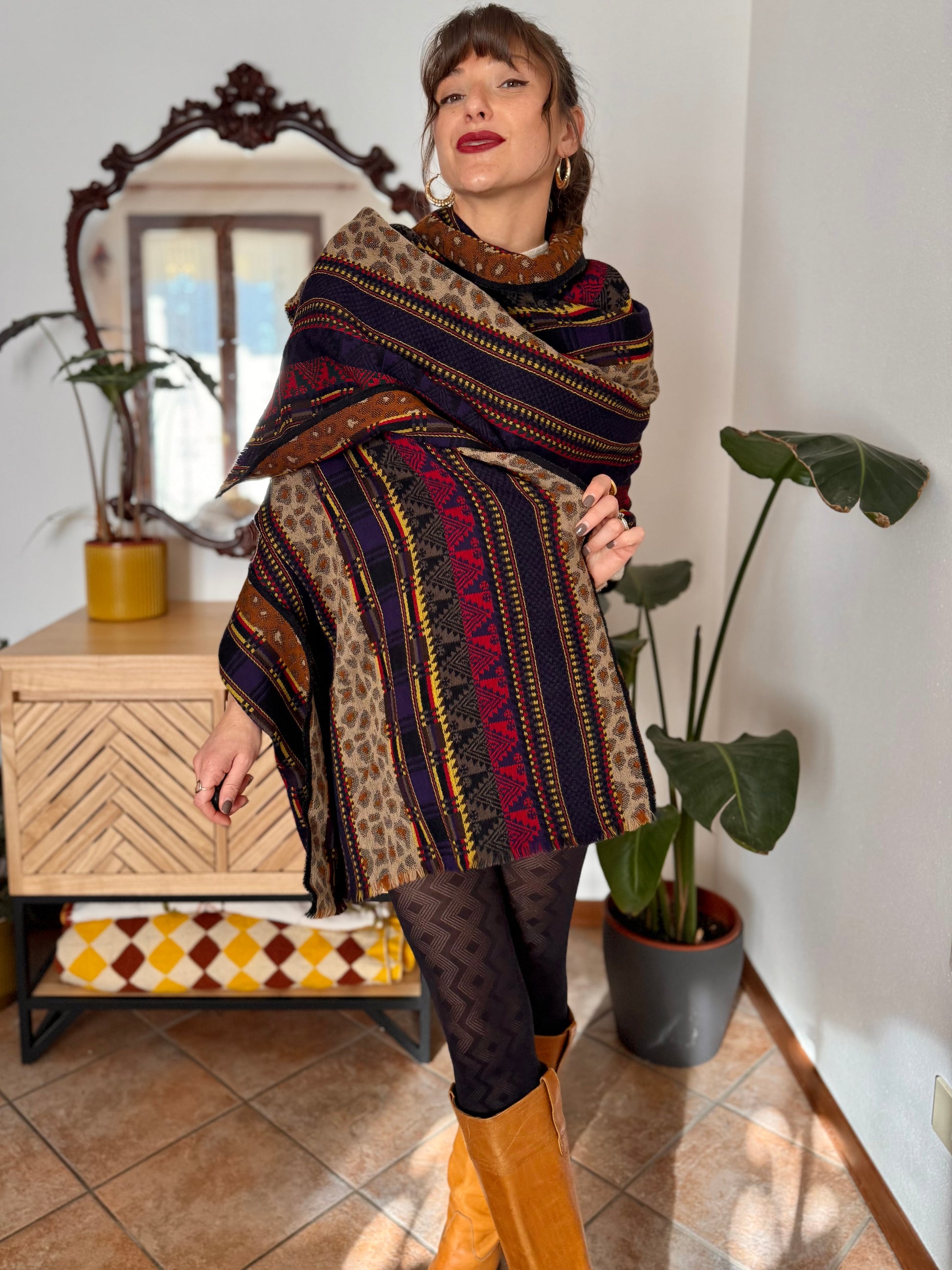 100% wol. Burgundy, chocolate brown, beige, black, purple and mustard yellow knit wool. Mixed animal, geometric and stripe patters. Can be worn as a scarf or a shawl. Made in Belgium. Size 184cm x 72cm) all measurements taken flat from seam to seam
