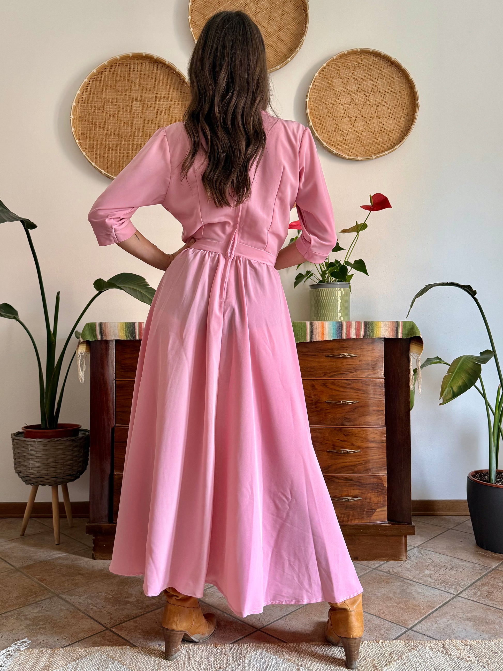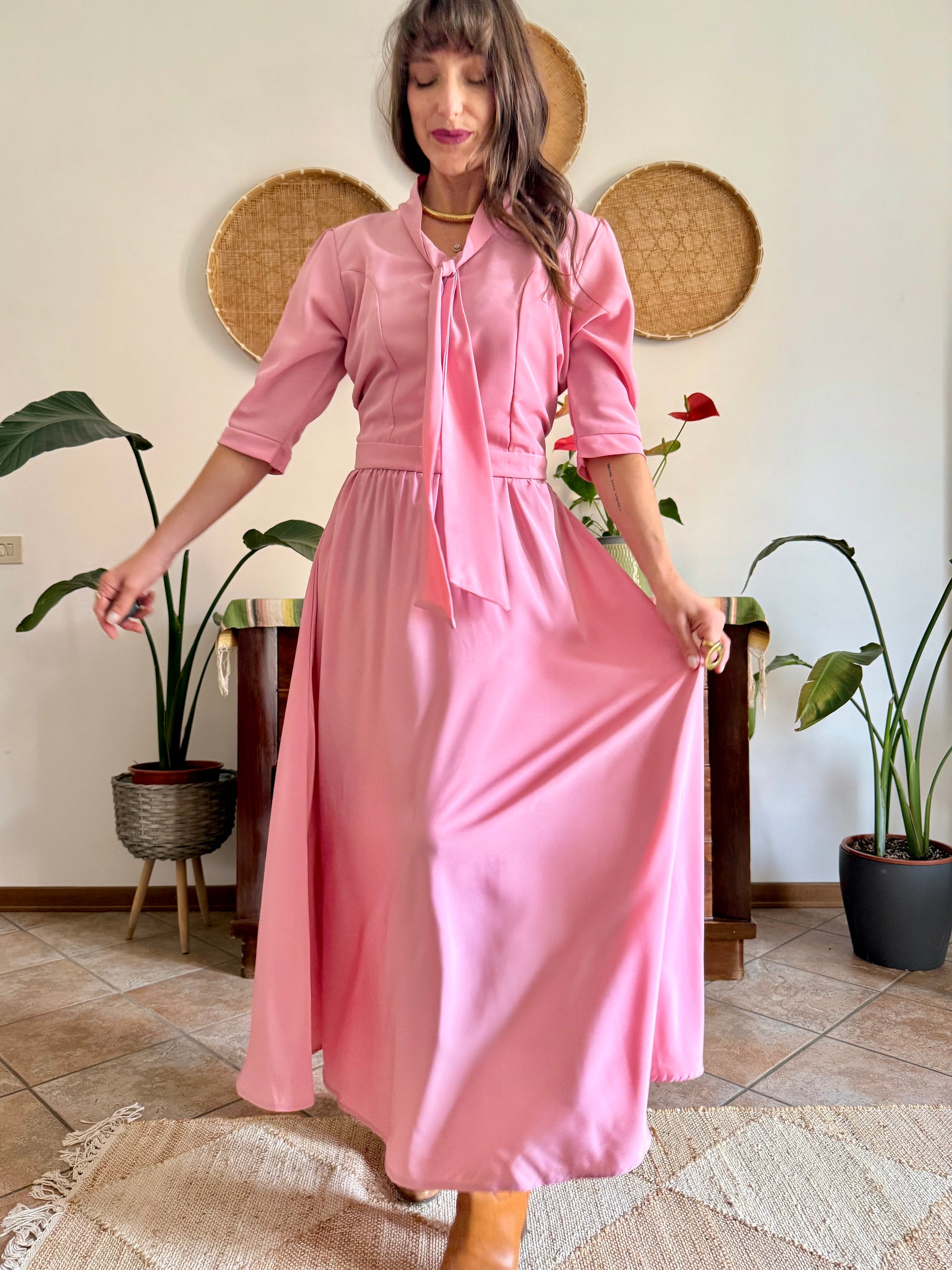 1970’s vintage pink maxi dress with bow tie collar