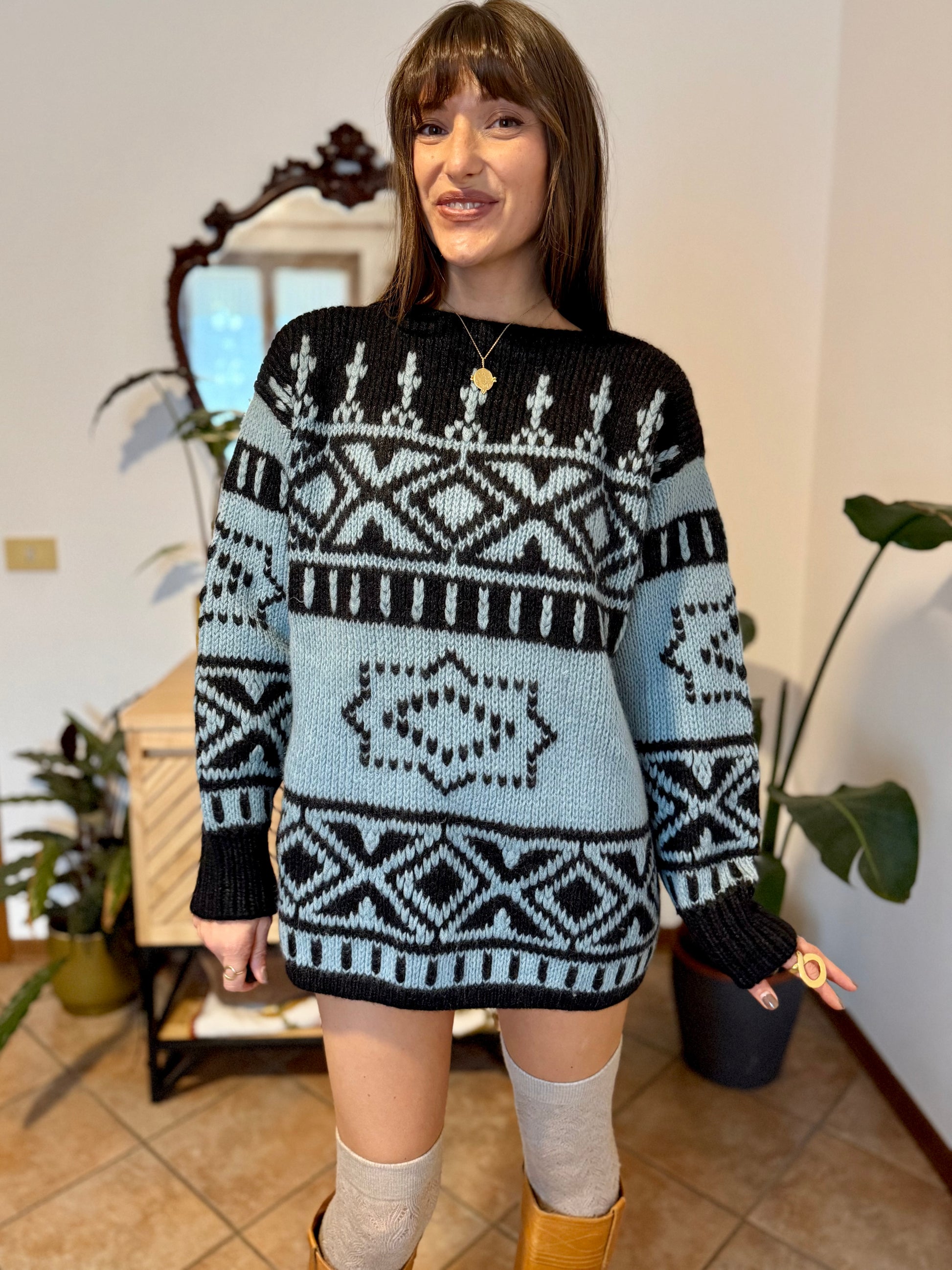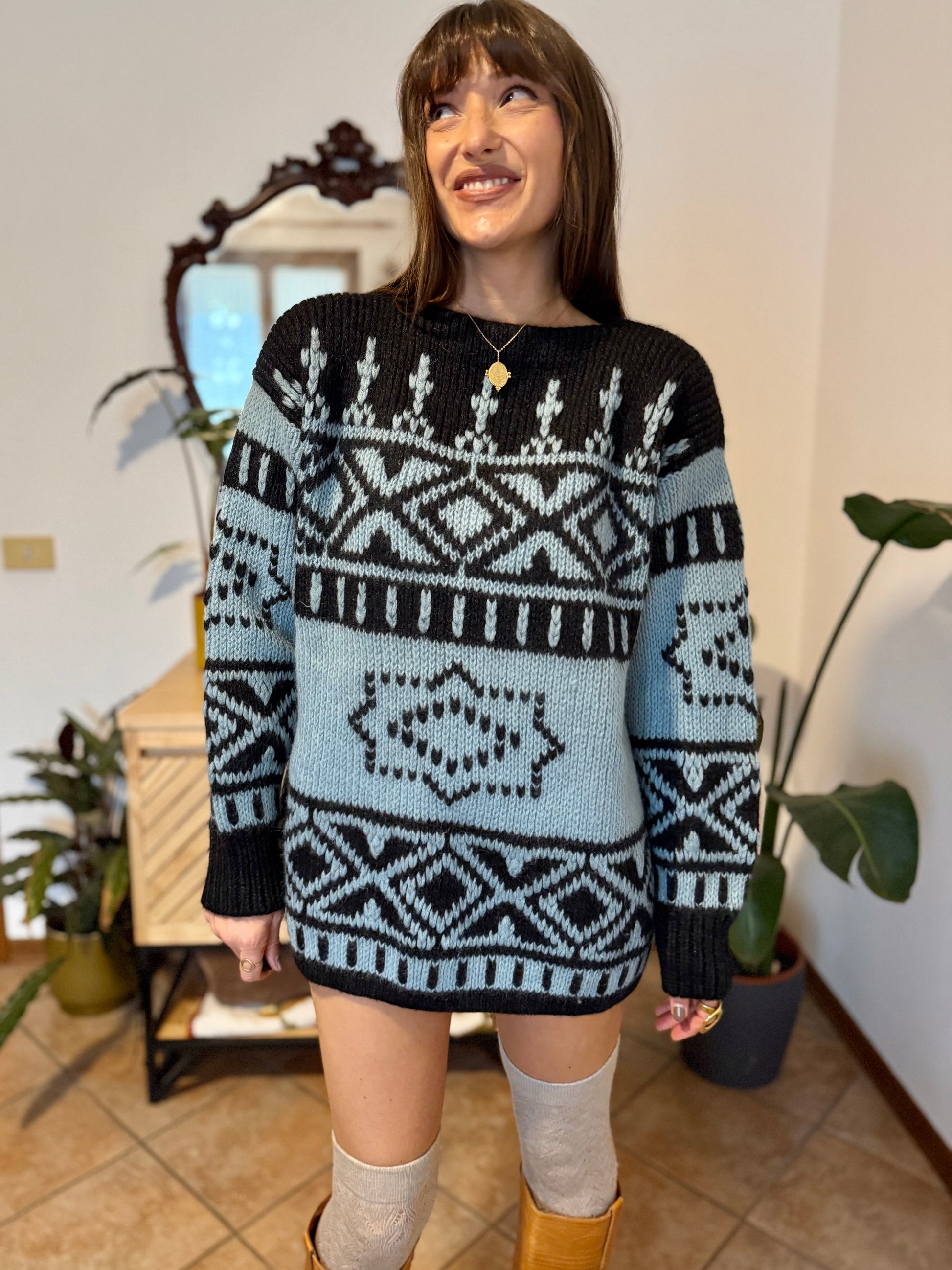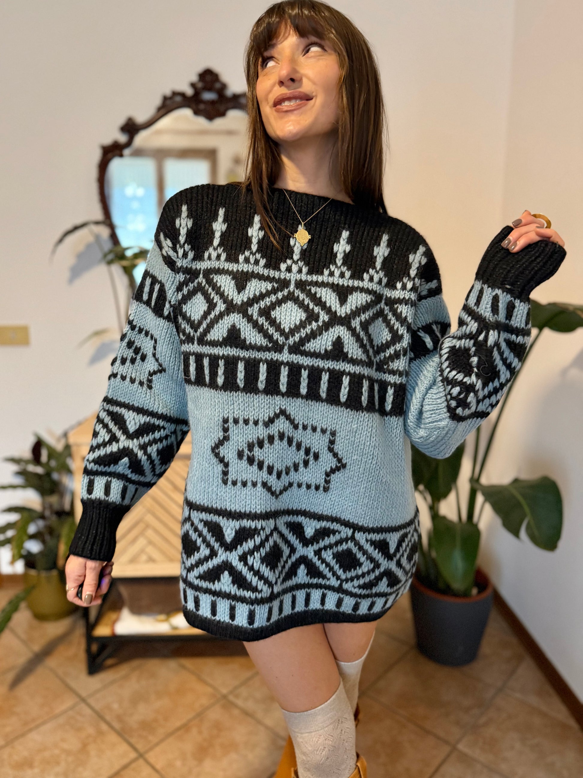 1970's vintage hand knit charcoal grey and light blue geometric pullover