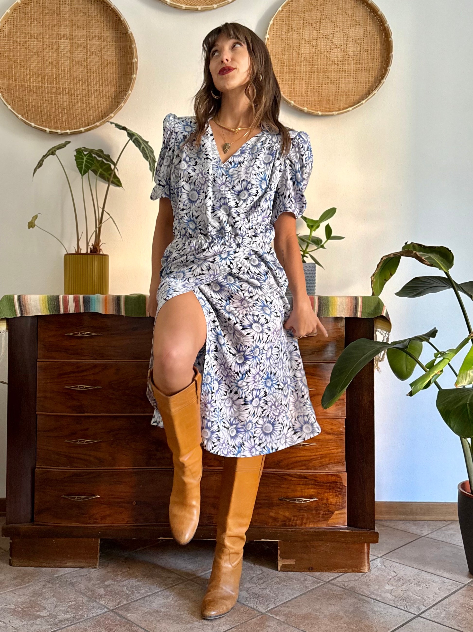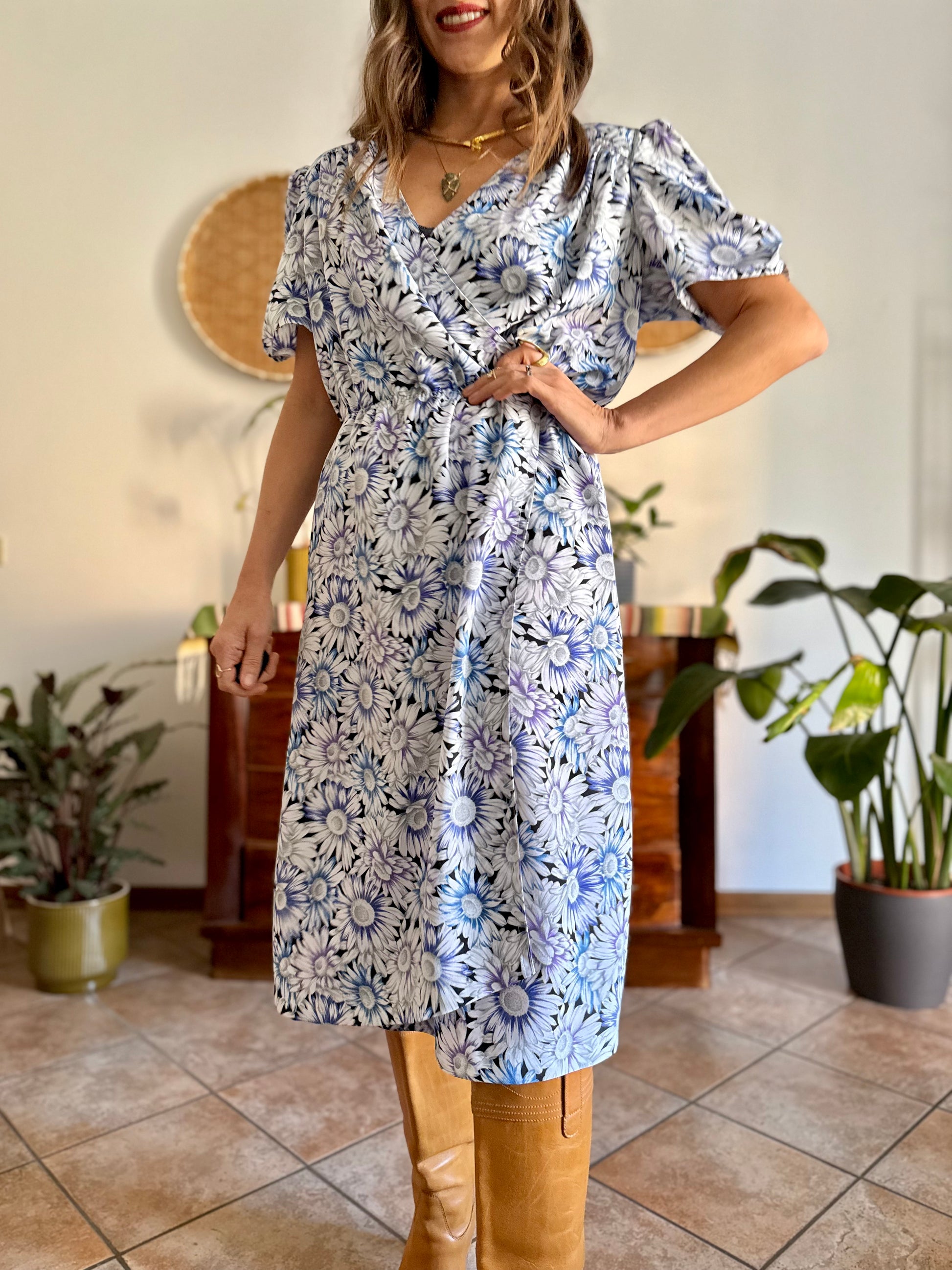 100% viscose. Black with grey and white daisy print with two tone blue and lilac accents. Structured shoulders. Made in Italy. Size L (shoulders 44cm, bust 58cm, elastic waist 32-44cm, hips 58cm, total length 110cm) all measurements taken flat from seam to seam