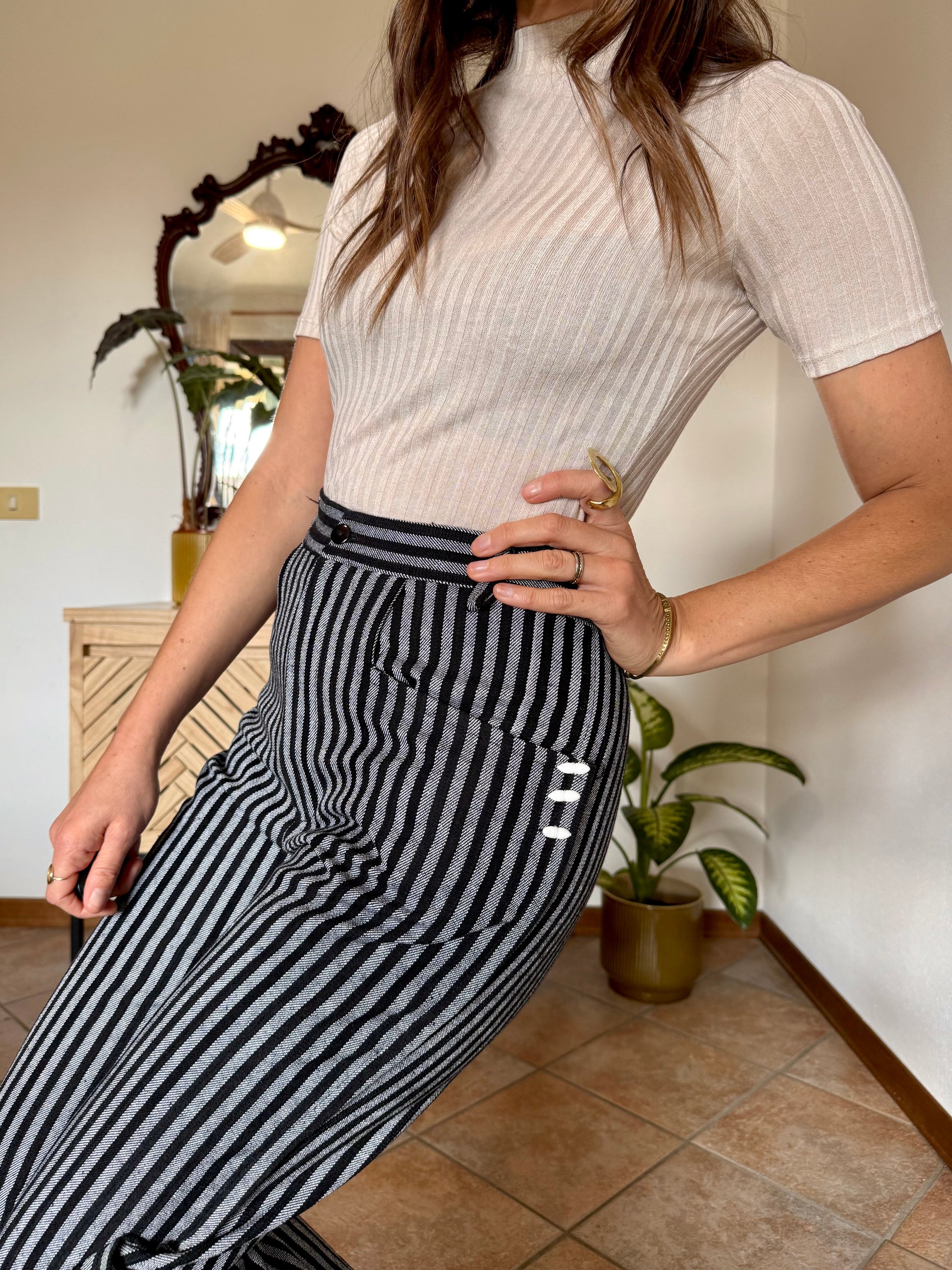 100% cotton. Black and white vertical stripe thick woven cotton. Wide leg. High waisted. Size M (waist 40cm, hips 50cm, waist height 31cm, leg inseam 76cm) all measurements taken flat from seam to seam