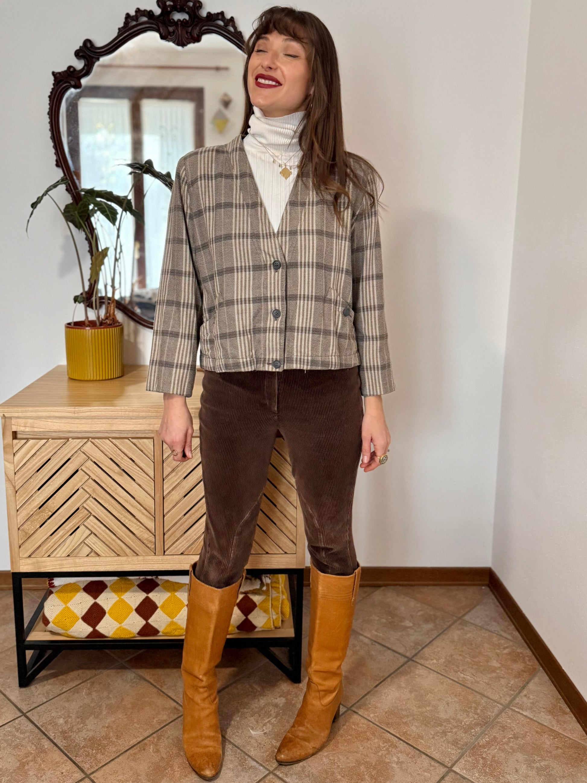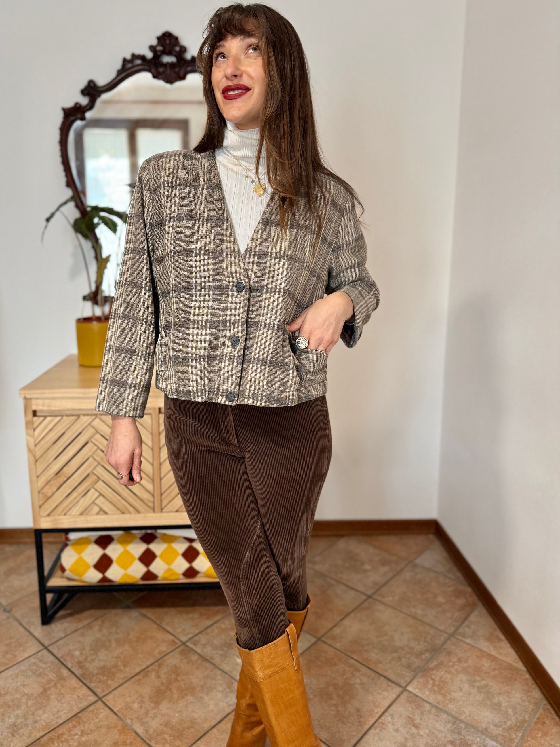 100% cotton. Brown, khaki and cream textured plaid. Brand: Emporio Armani. Made in Italy. Size M (shoulders 44cm, bust 58cm, total length 53cm) all measurements are taken flat from seam to seam