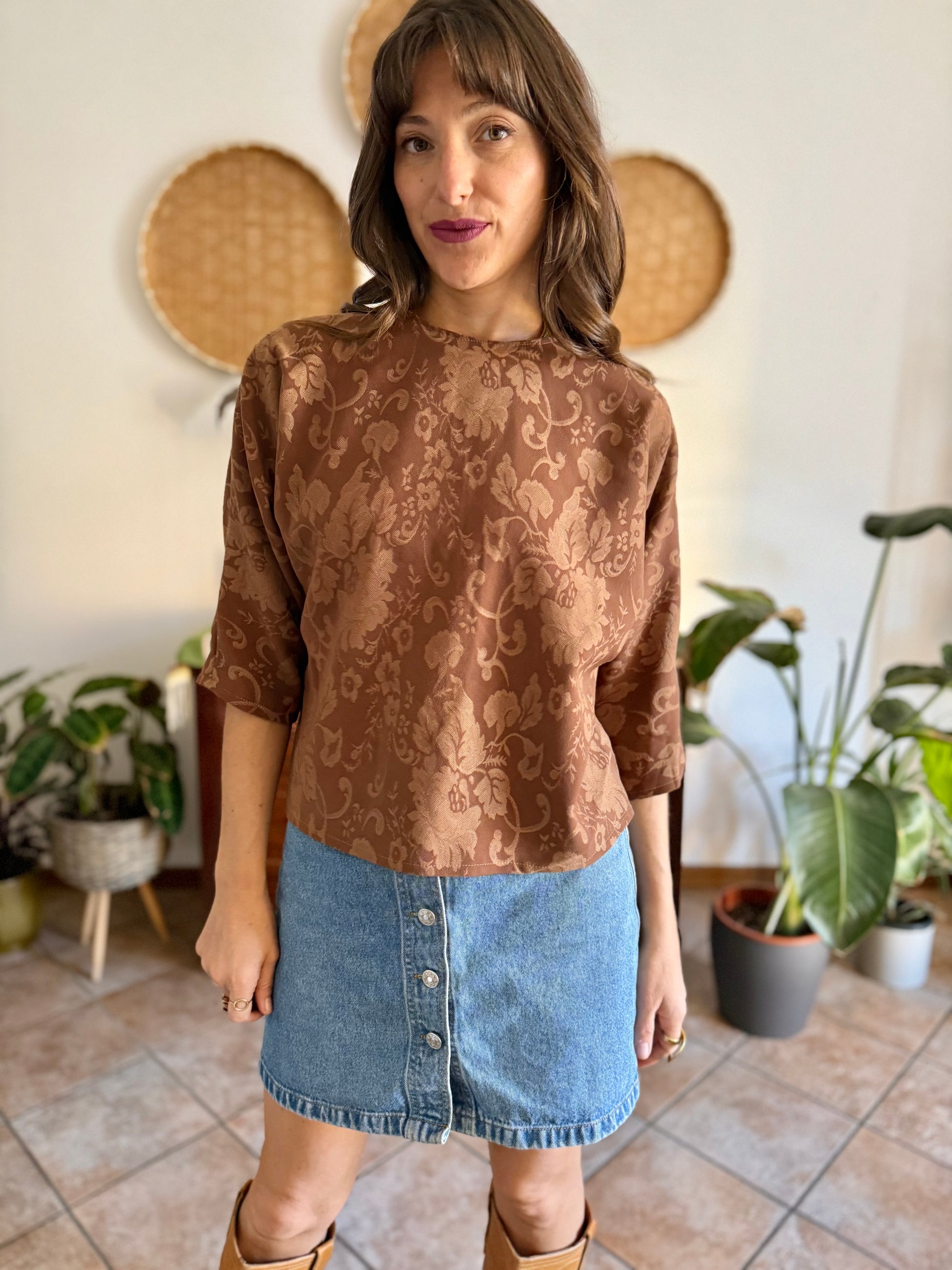 100% cotton. Brown woven floral Hand sewn. Size M (shoulders 42cm, bust 53cm, total length 54cm) all measurements taken flat from seam to seam