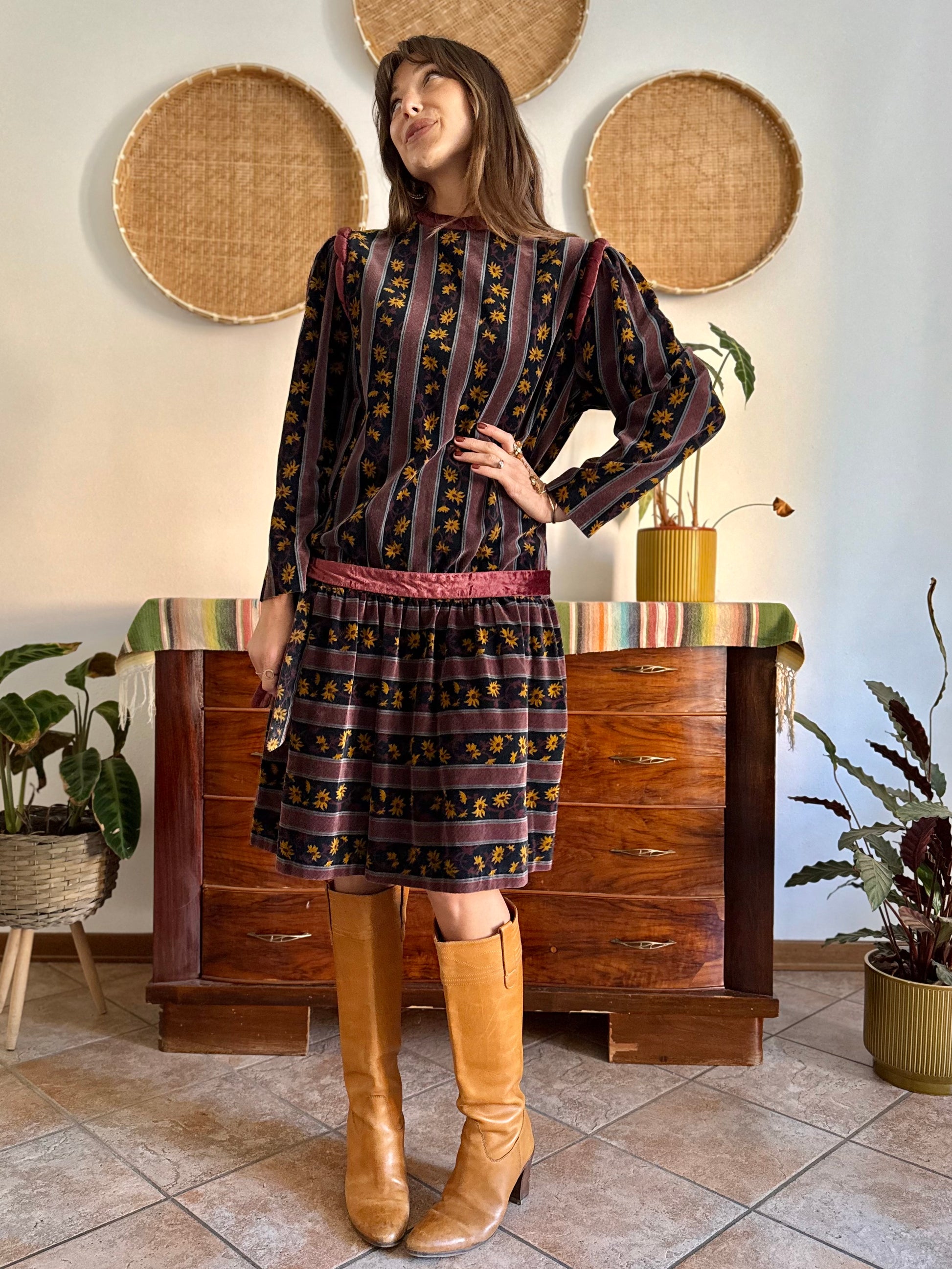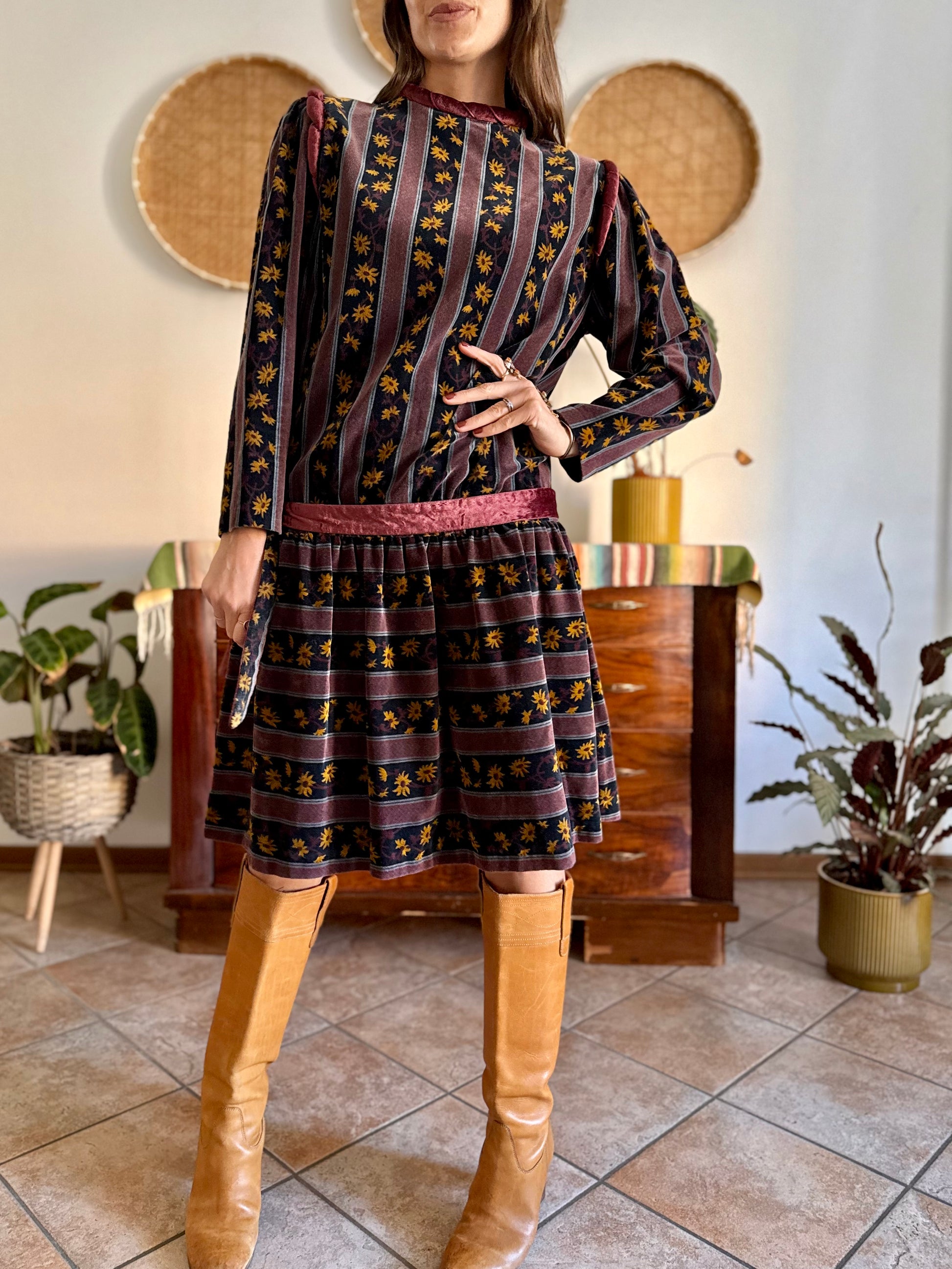1970's vintage burgundy and black velvet drop waist dress with grey and mustard floral print