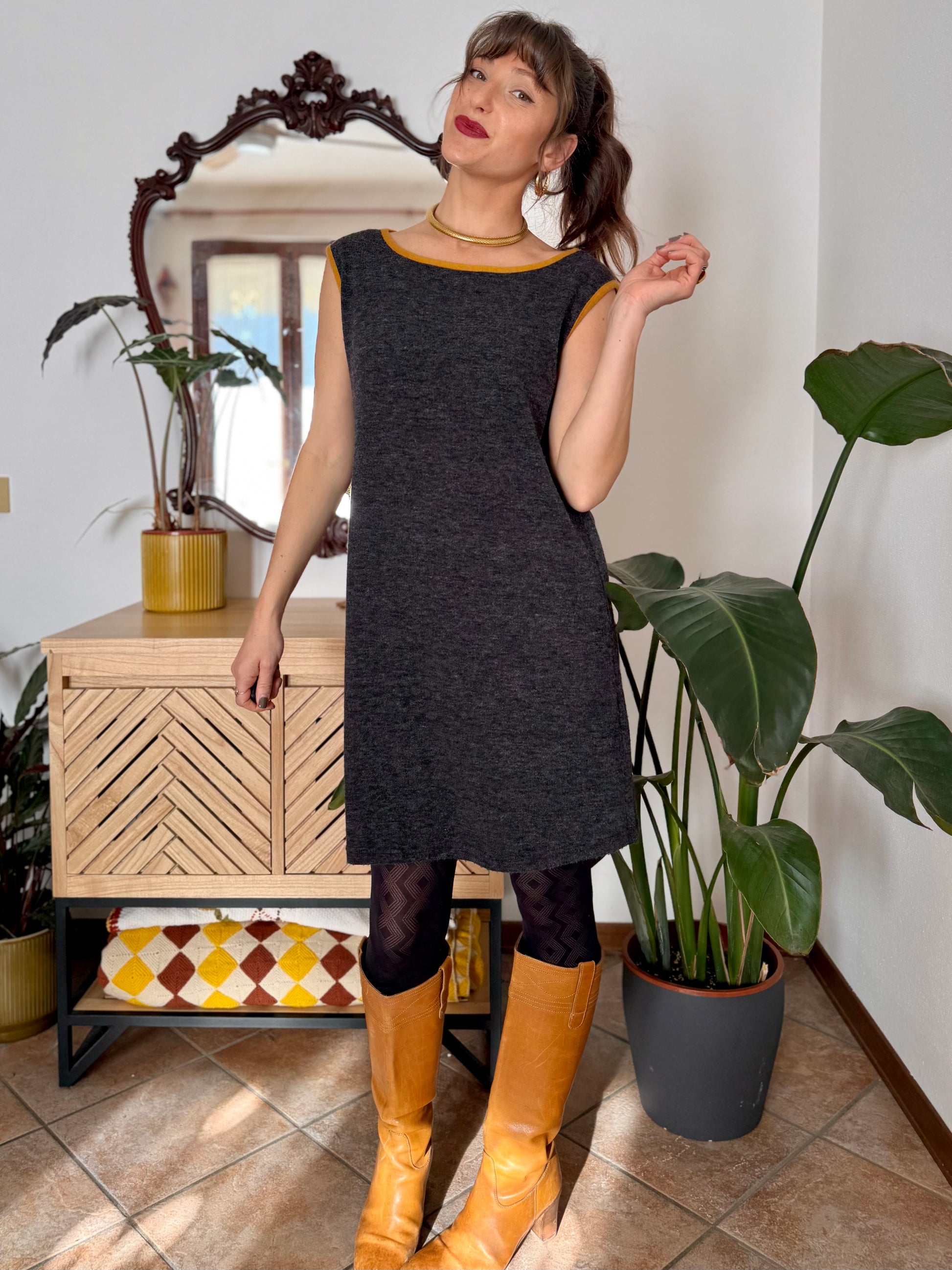 100% wool. Heathered charcoal grey fine knit with mustard yellow trimming. Wide neck. Made in Italy. Size M (shoulders 42cm, bust 52cm, waist 50cm, hips 54cm, total length 89cm) all measurements taken flat from seam to seam