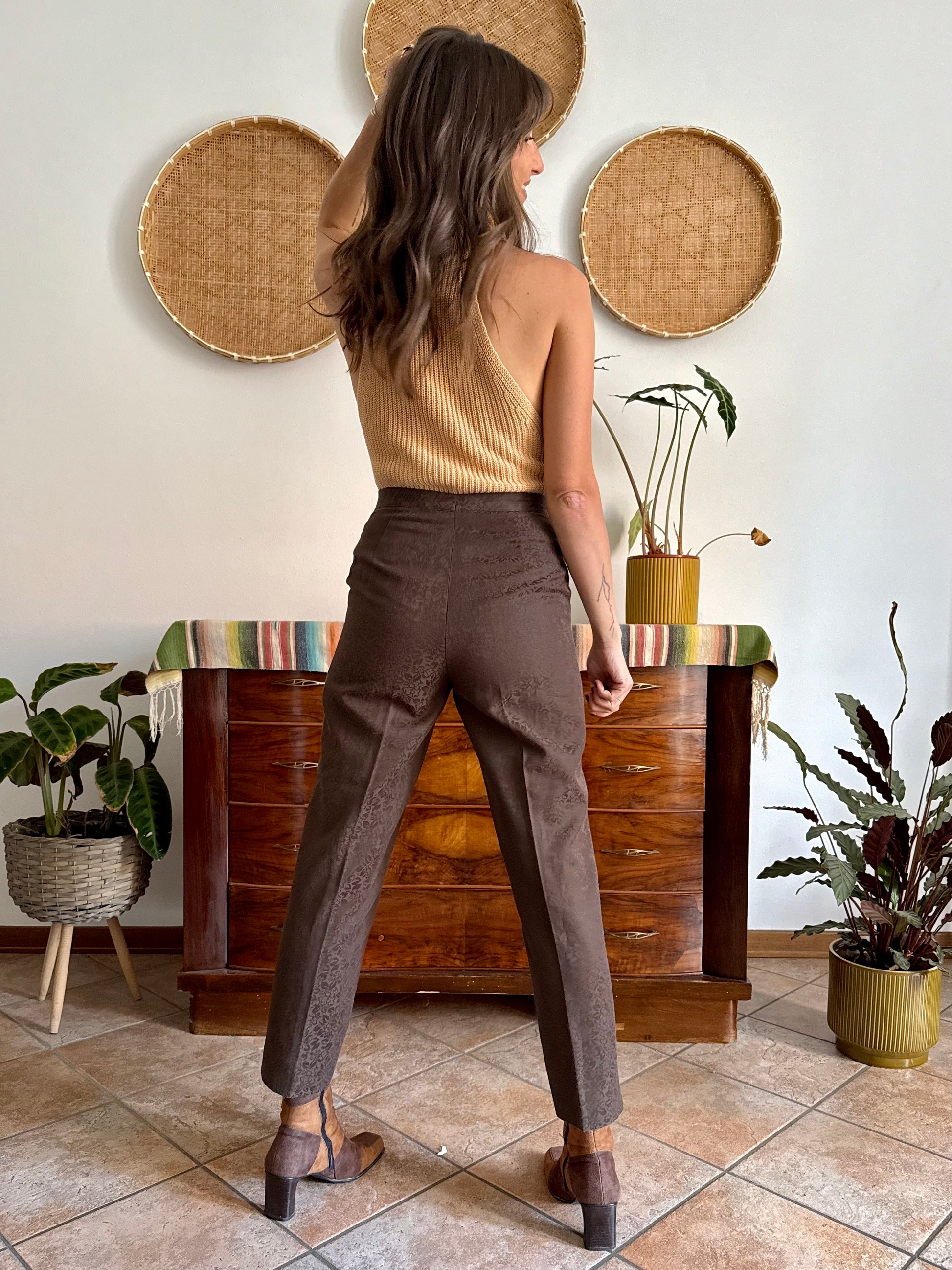 52% cotton 48% acetate. Chocolate brown with woven floral print. Zip and button closure. Tailored fit. Made in Italy. Size EU38 IT42 UK10 (waist 35cm, hips 50cm, waist height 30cm, leg length 66cm) all measurements taken flat from seam to seam