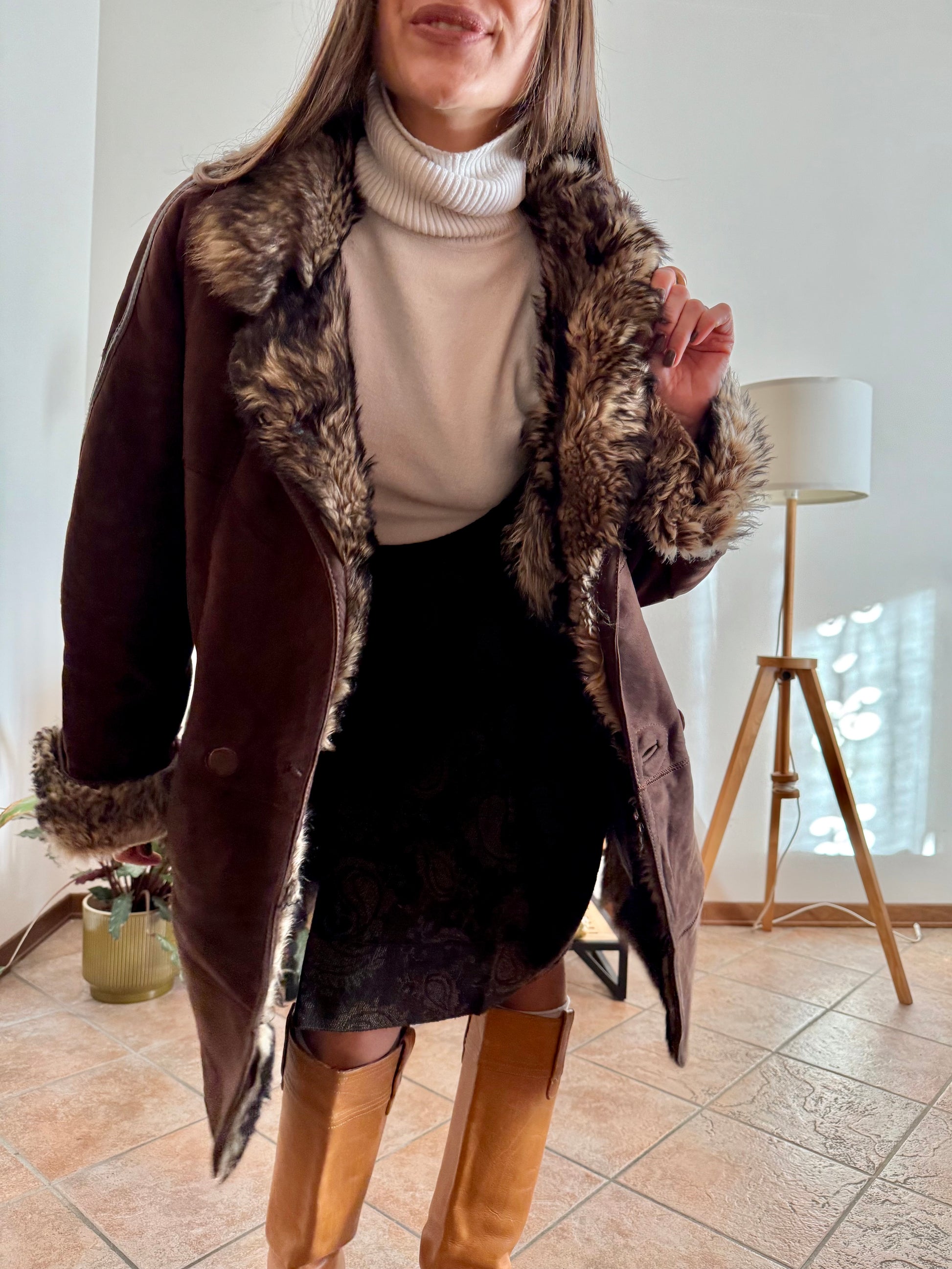 100% genuine shearling. Chocolate brown suede quilted style exterior. Beige and chocolate brown wool interior. Chocolate brown leather details. Made in Spain. Size M (shoulders 48cm, bust 62cm, total length 92cm) all measurements taken flat from seam to seam