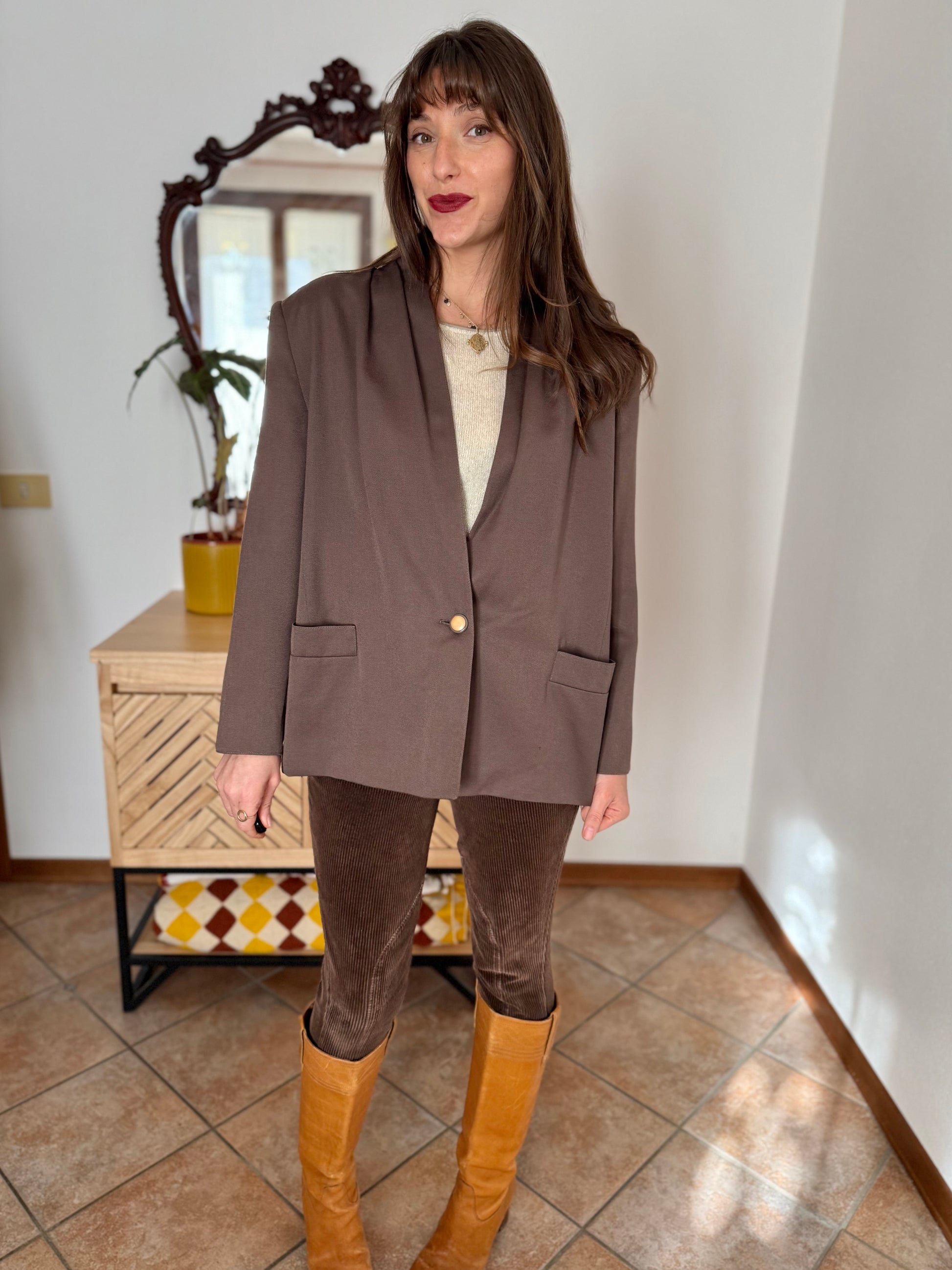 1970's vintage dark khaki brown oversize blazer with pleated shoulder details