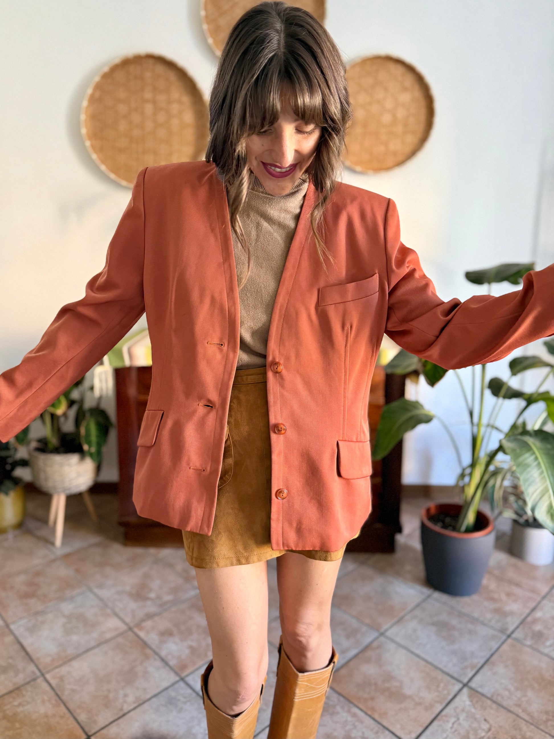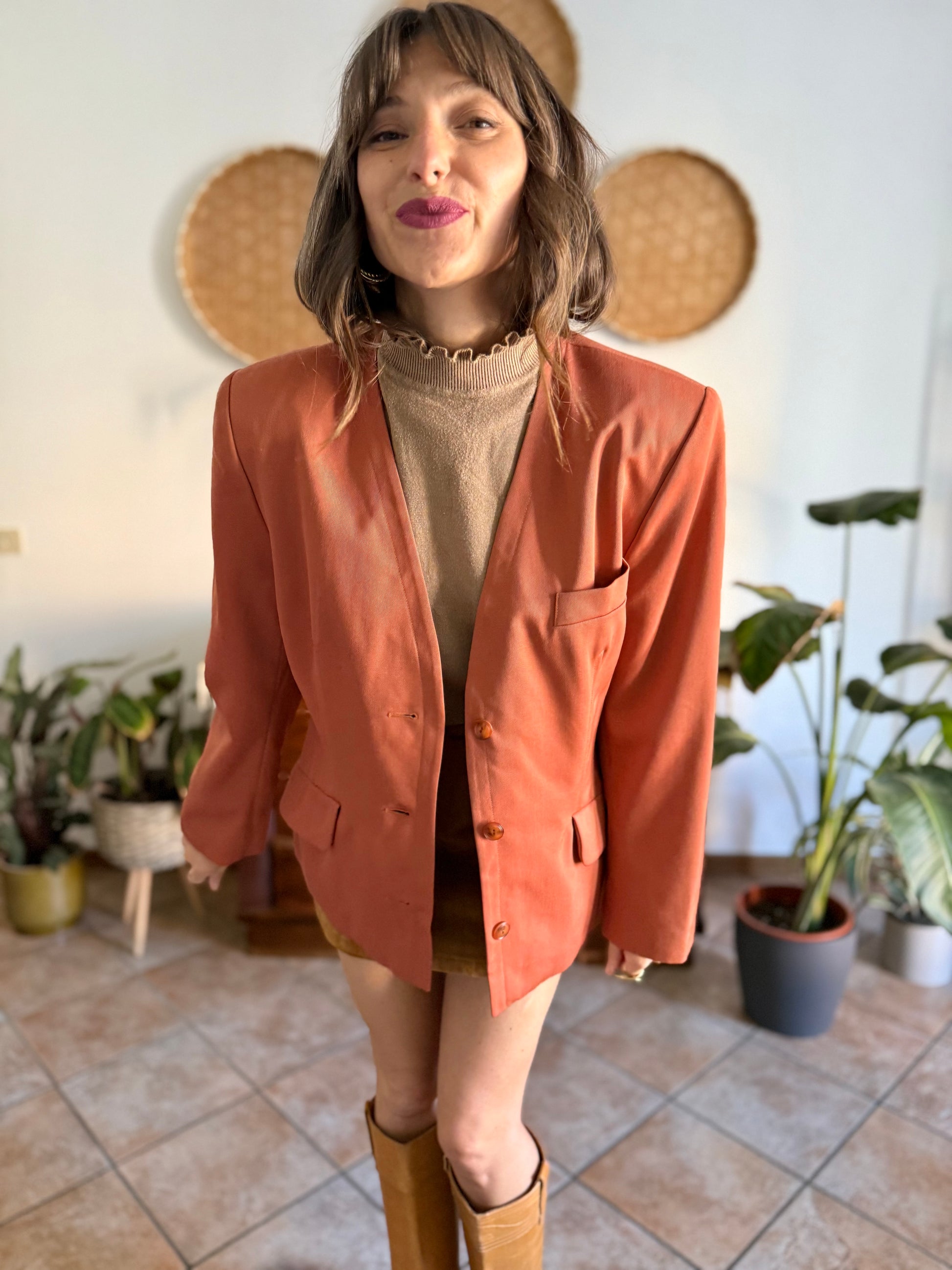 100% wool. Dark orange wool outer with dark orange satin lining. Tailored fit. Darting in front. Made in Italy. Size M (shoulders 44cm, bust 53cm, total length 69cm) all measurements taken flat from seam to seam