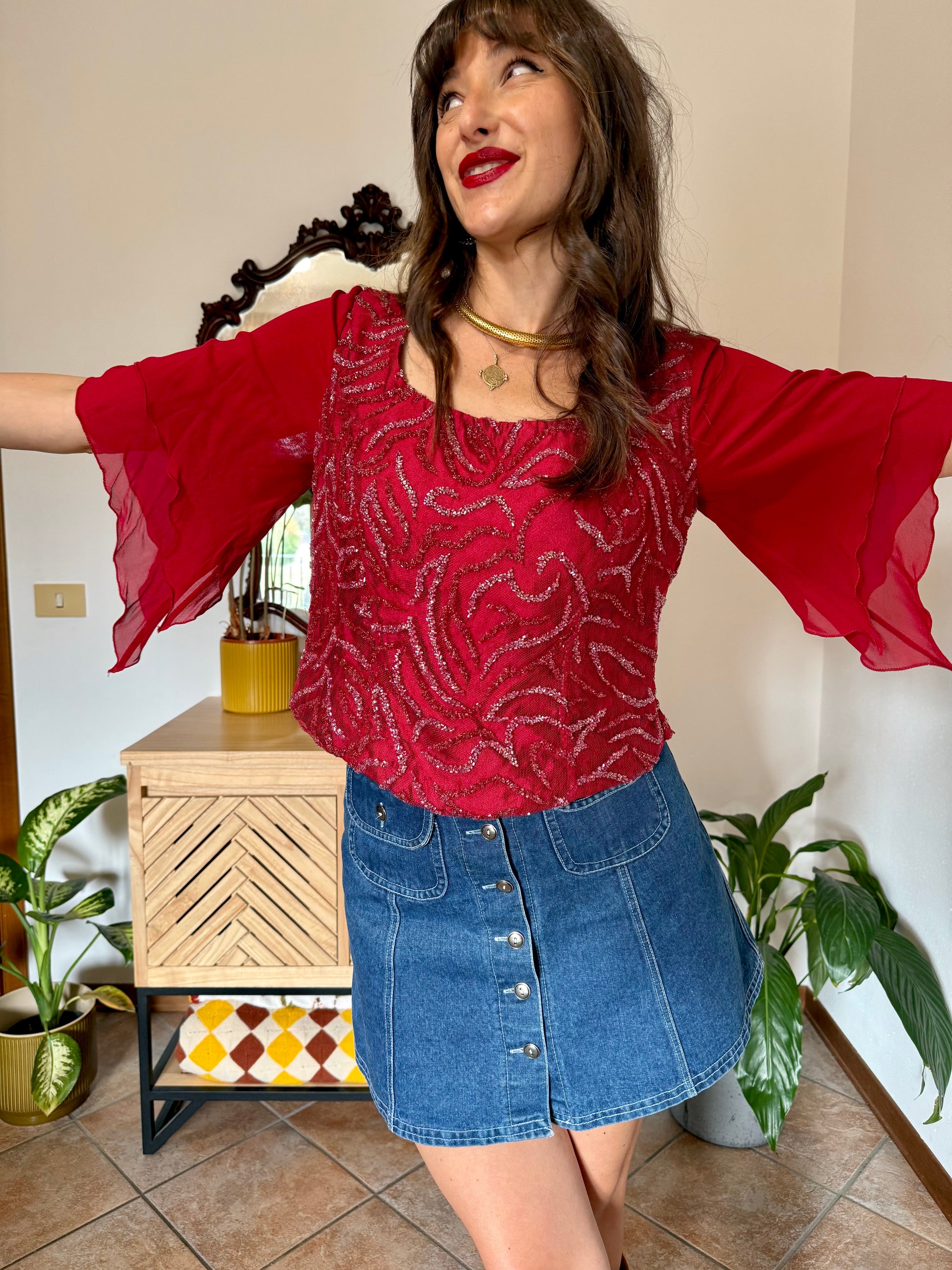 1970's vintage dark redvsilk bustier top with bell sleeves and intricate glass beading