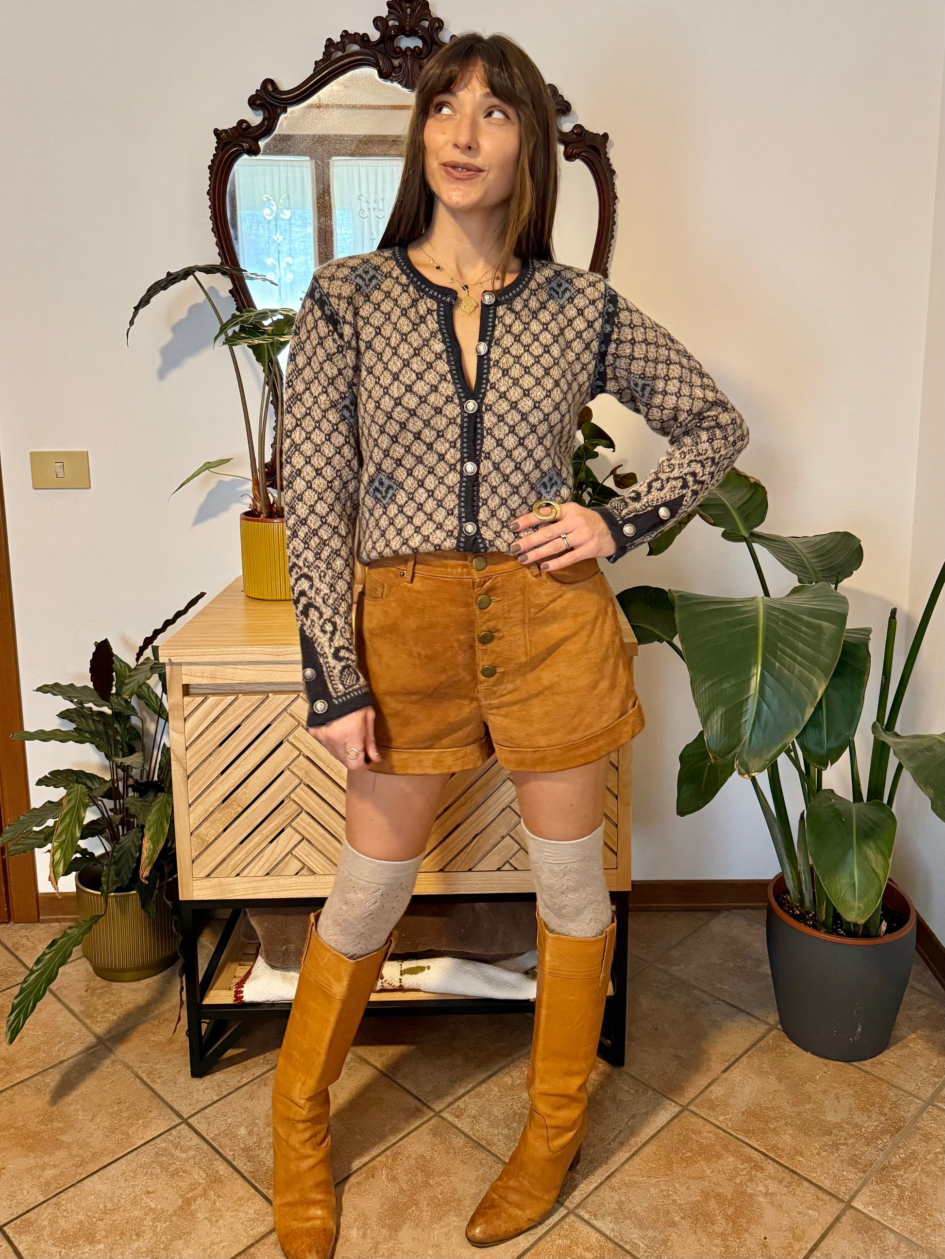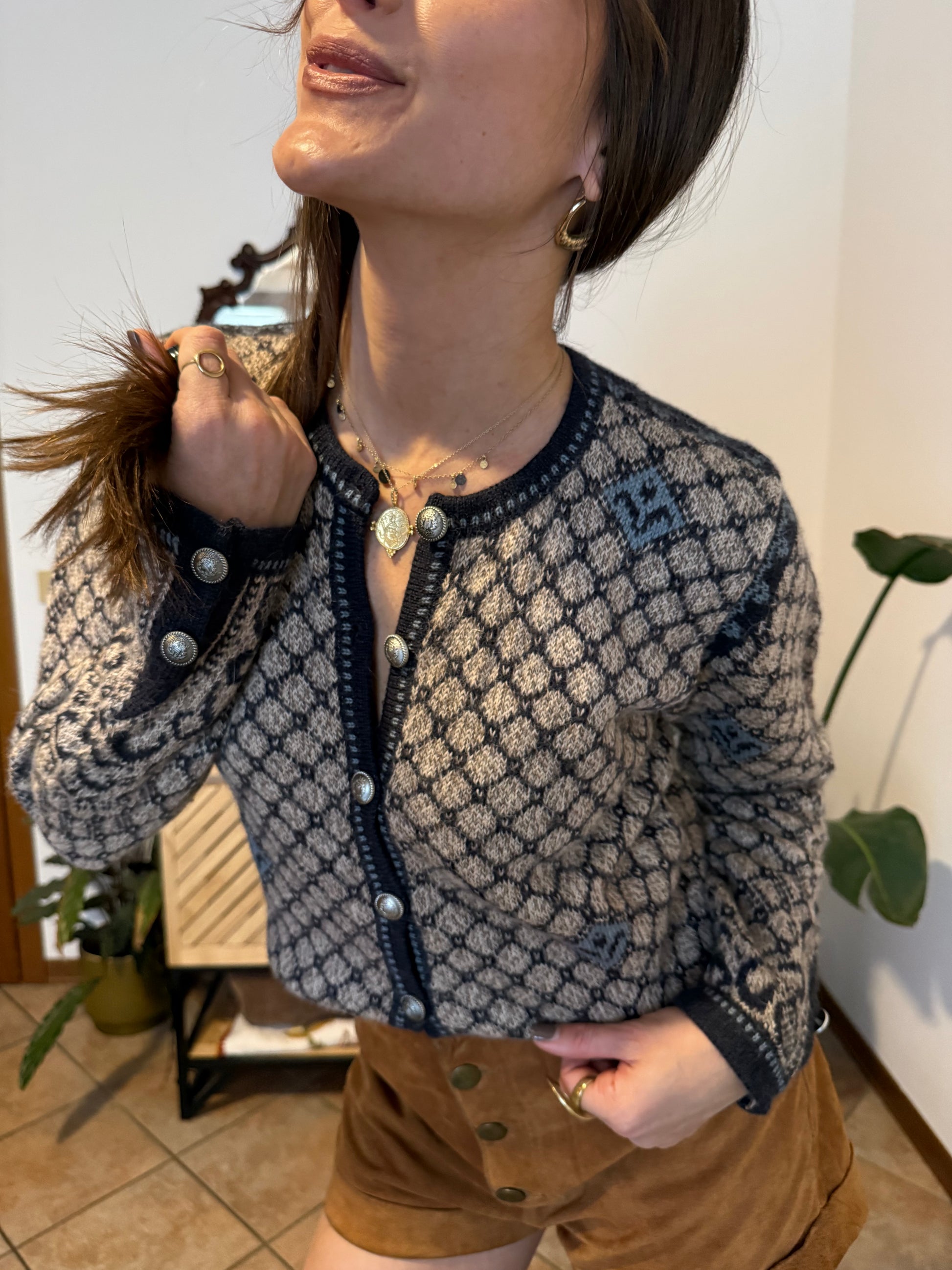 1990's vintage grey and beige alpaca knit cardigan with turquoise geometric pattern