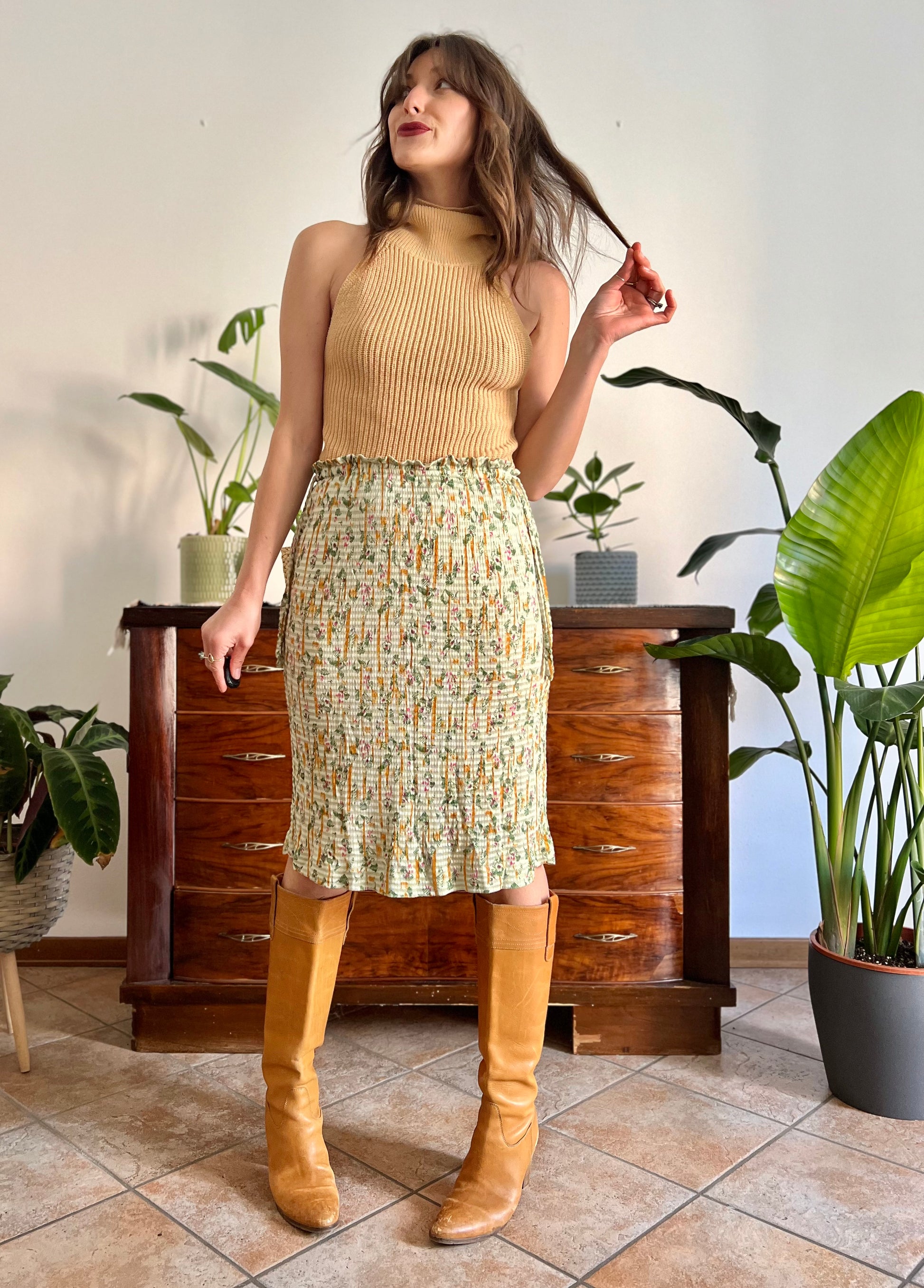 1970's vintage mint green knit floral midi skirt with pink and yellow floral pattern