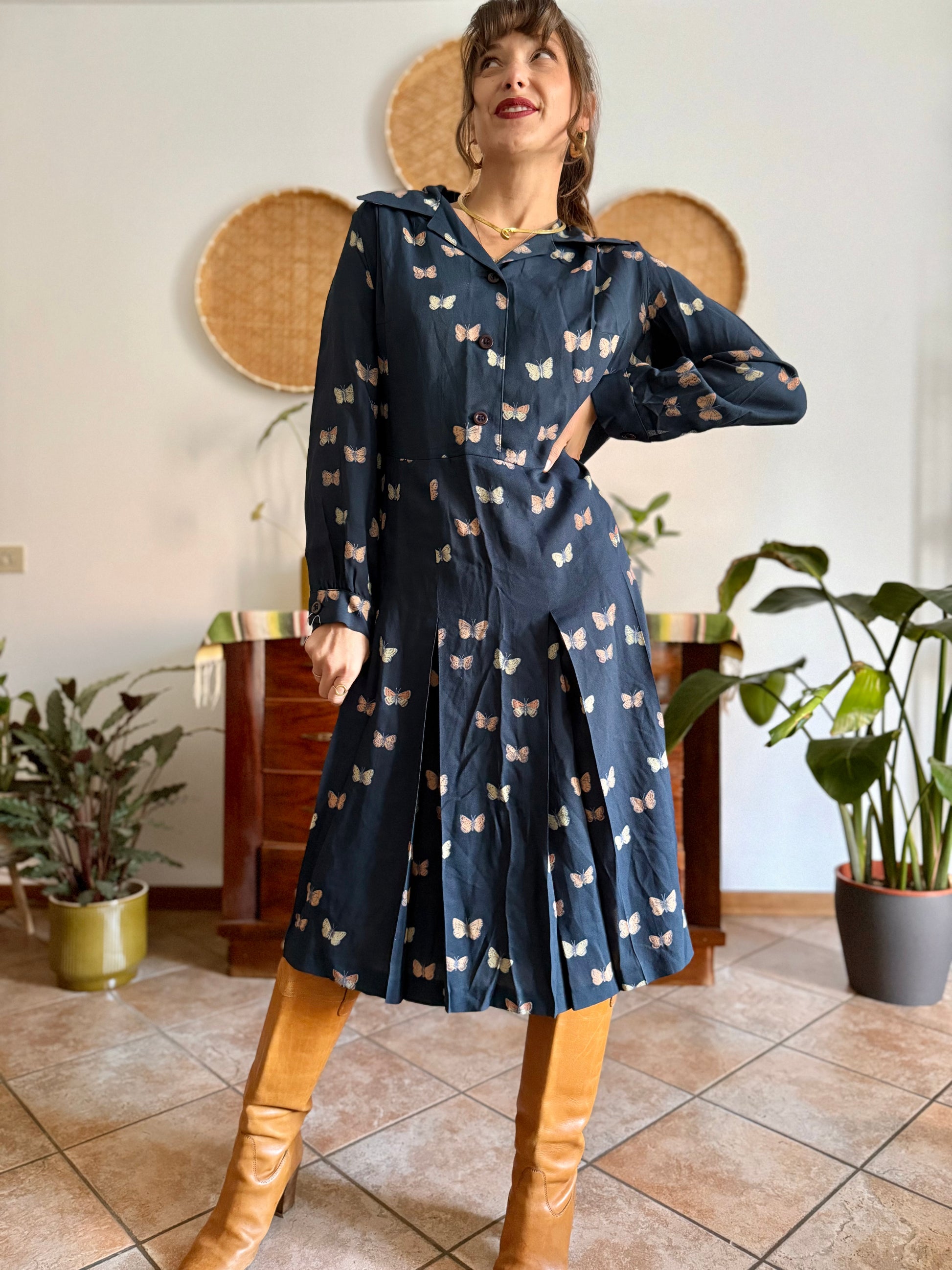 45% viscose 55% acetate. Navy blue with orange and beige butter fly print. Pleated skirt. Made in Italy. Size L (shoulders 46cm, bust 55 cm, waist 46cm, hips 78cm, total length 110cm) all measurements taken flat from seam to seam