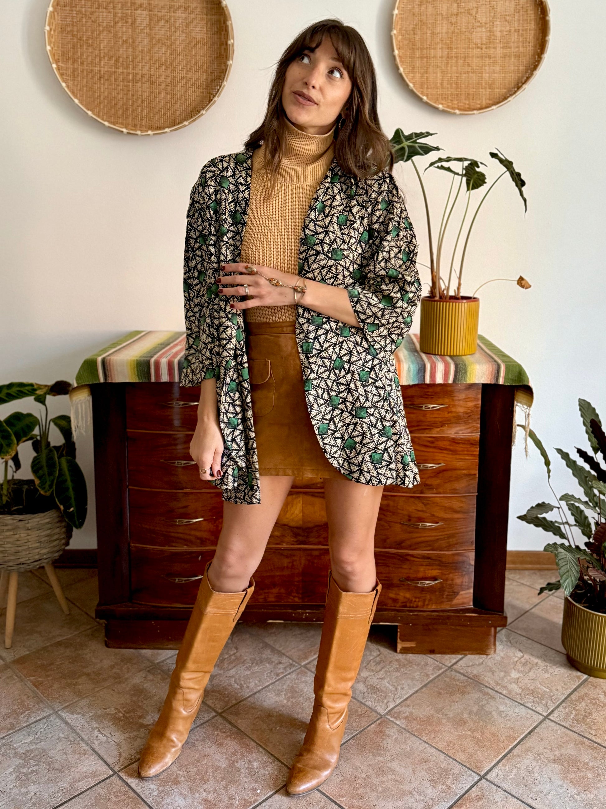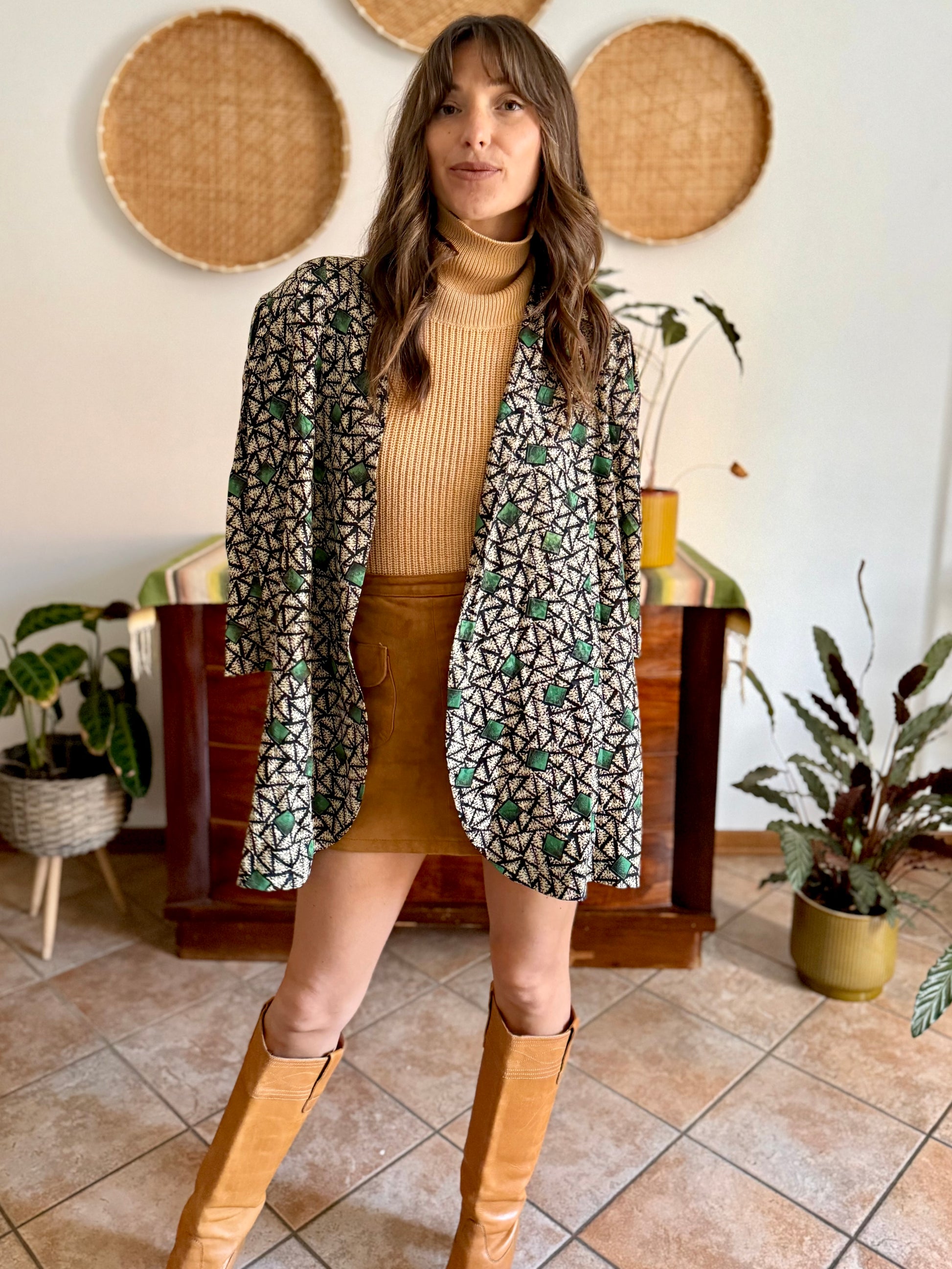 1970's vintage tan, black and green geometric print satin jacket