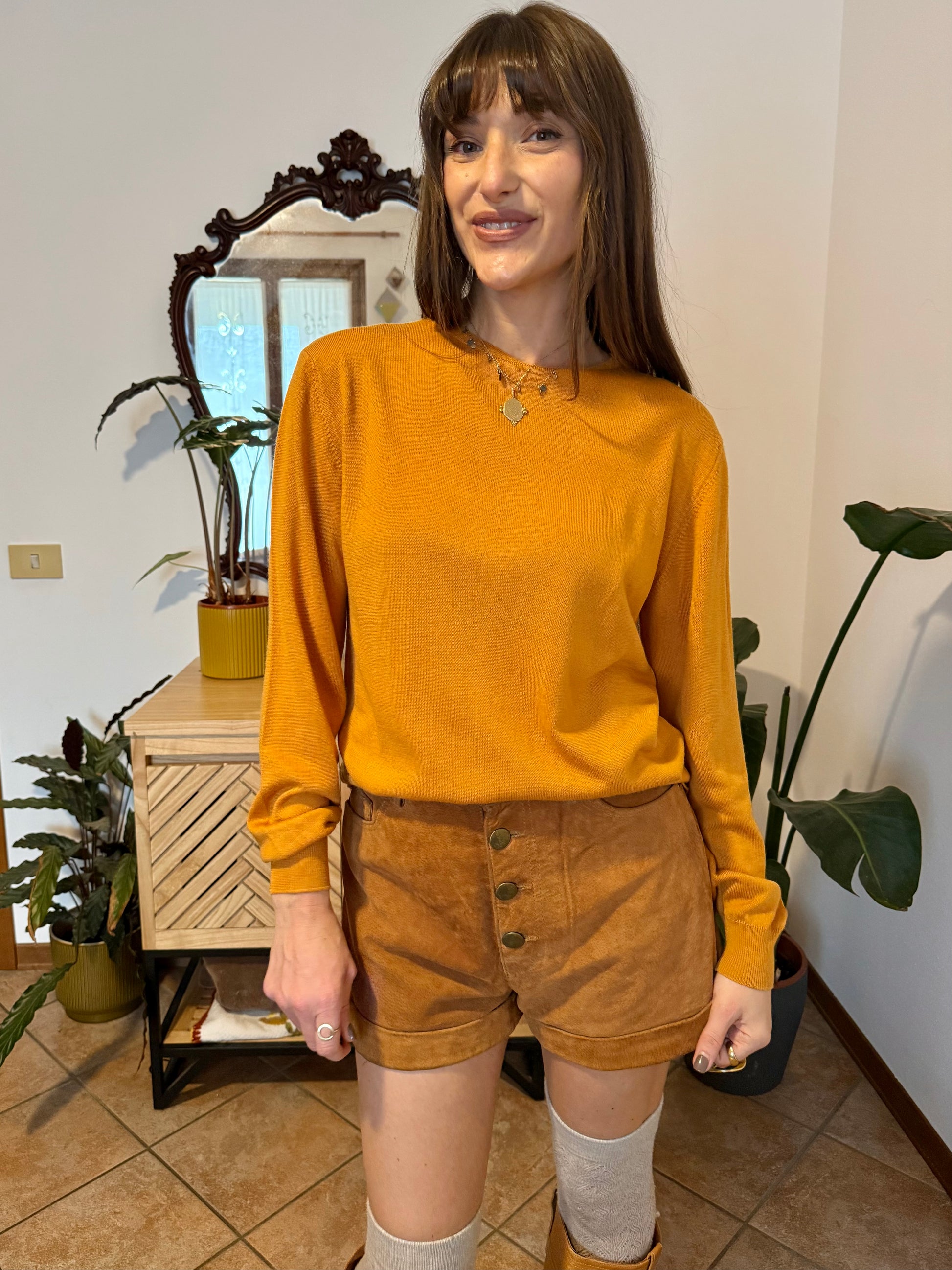 100% wool. Mustard yellow fine knit pullover. Made in Italy. Size L (shoulders 46cm, bust 56cm, total length 66cm) all measurements taken flat from seam to seam