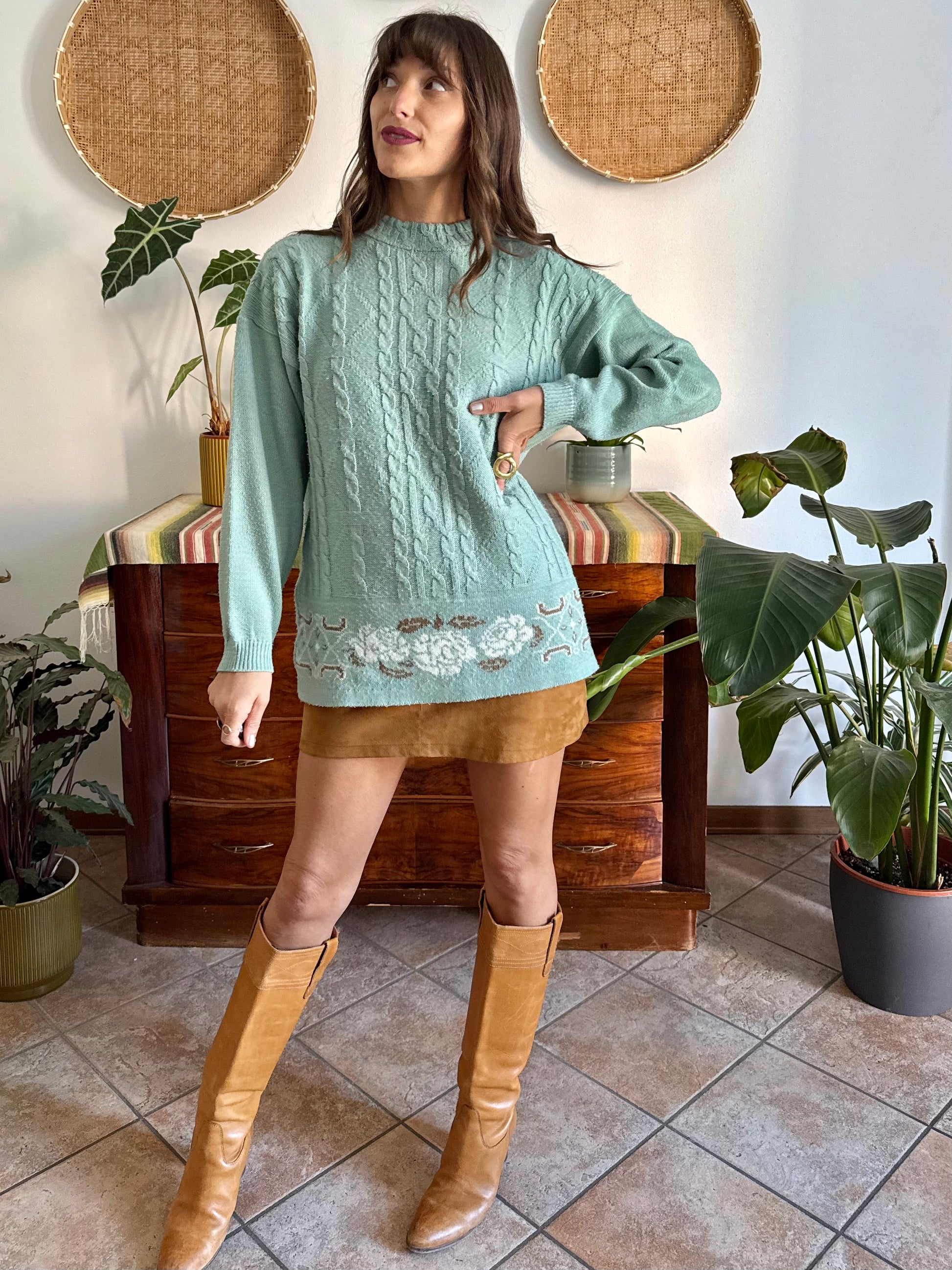 1980's vintage wool turquoise knit pullover with tan floral pattern