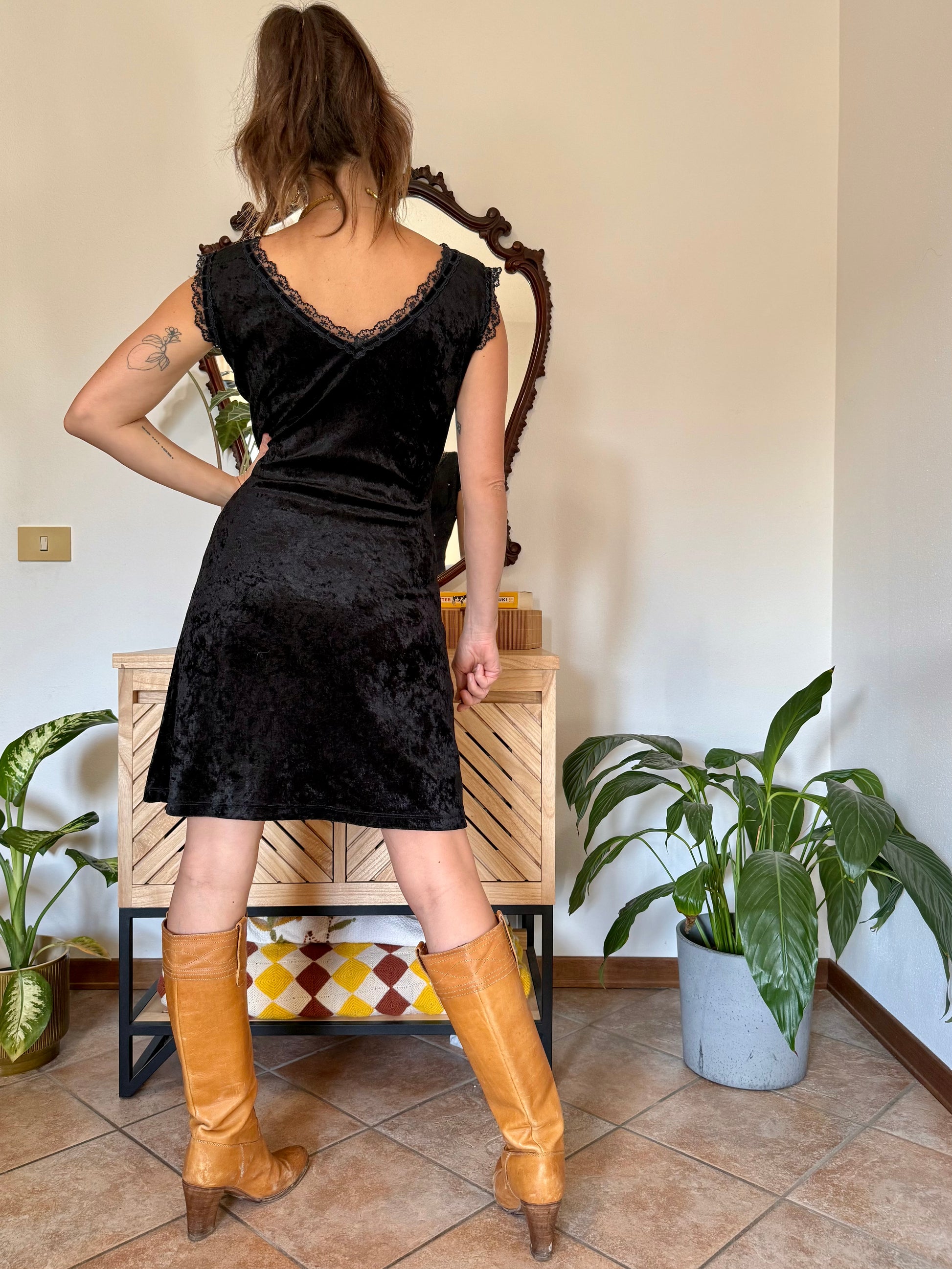 1990’s black velvet midi dress with lace trim
