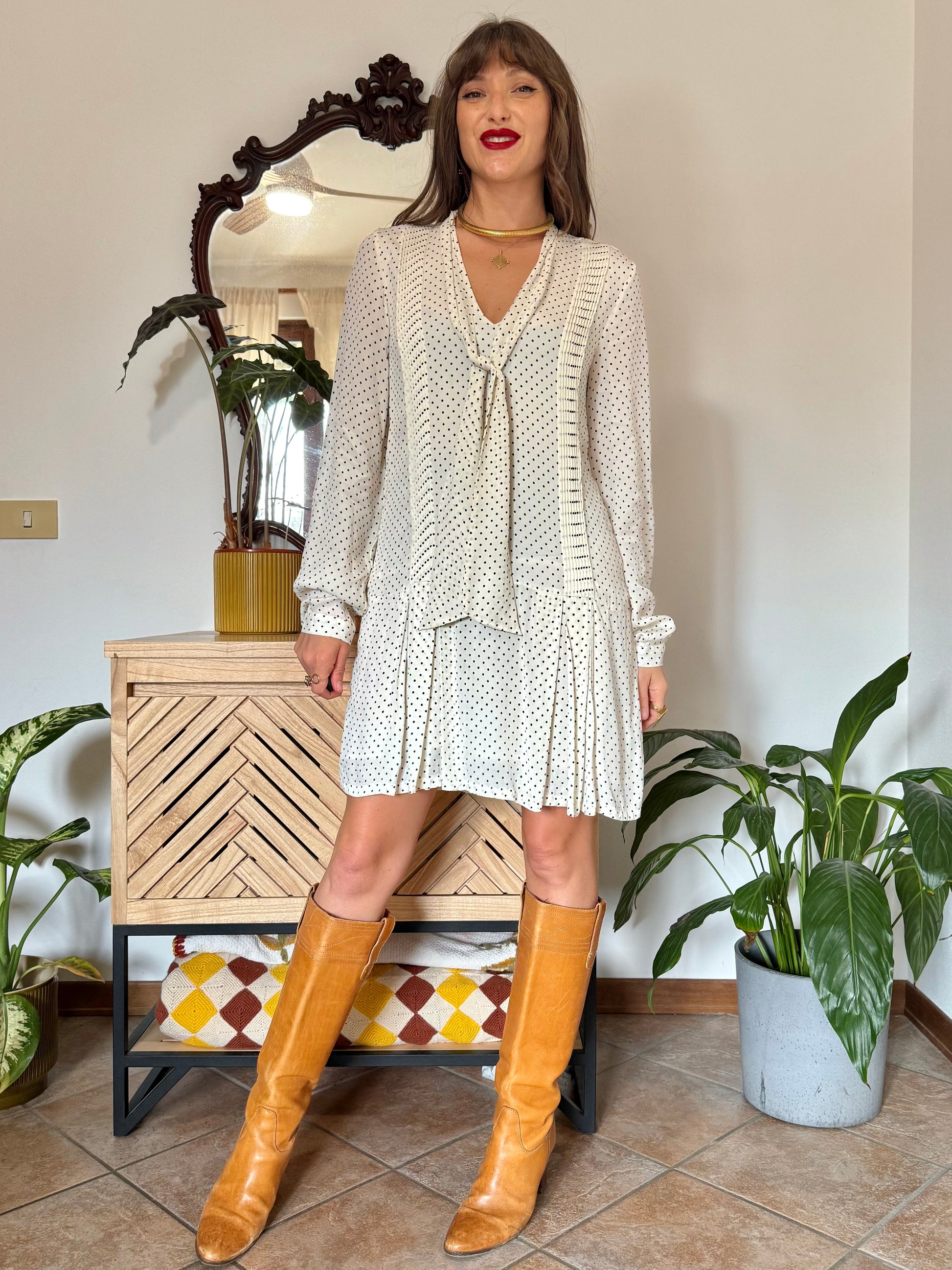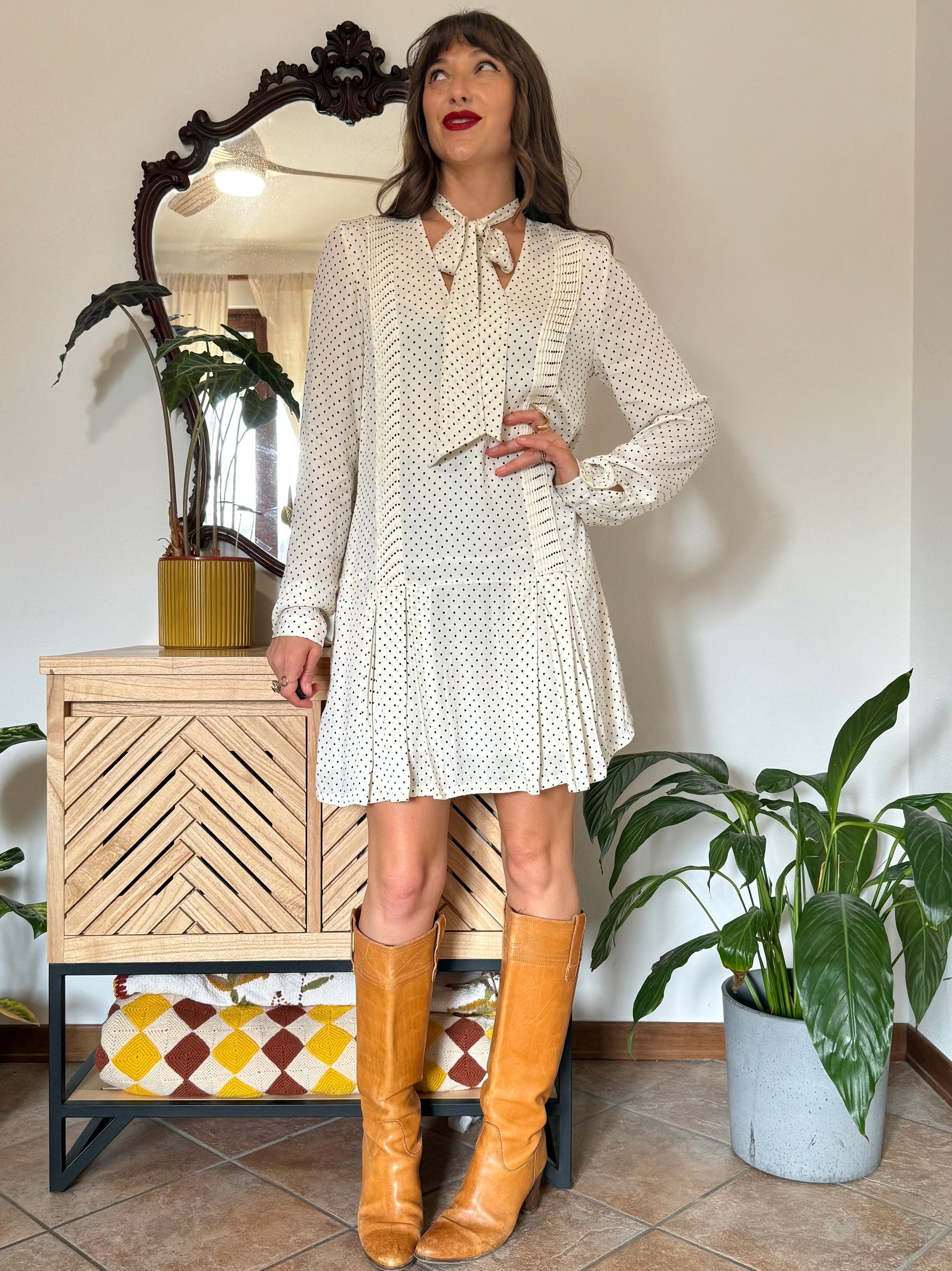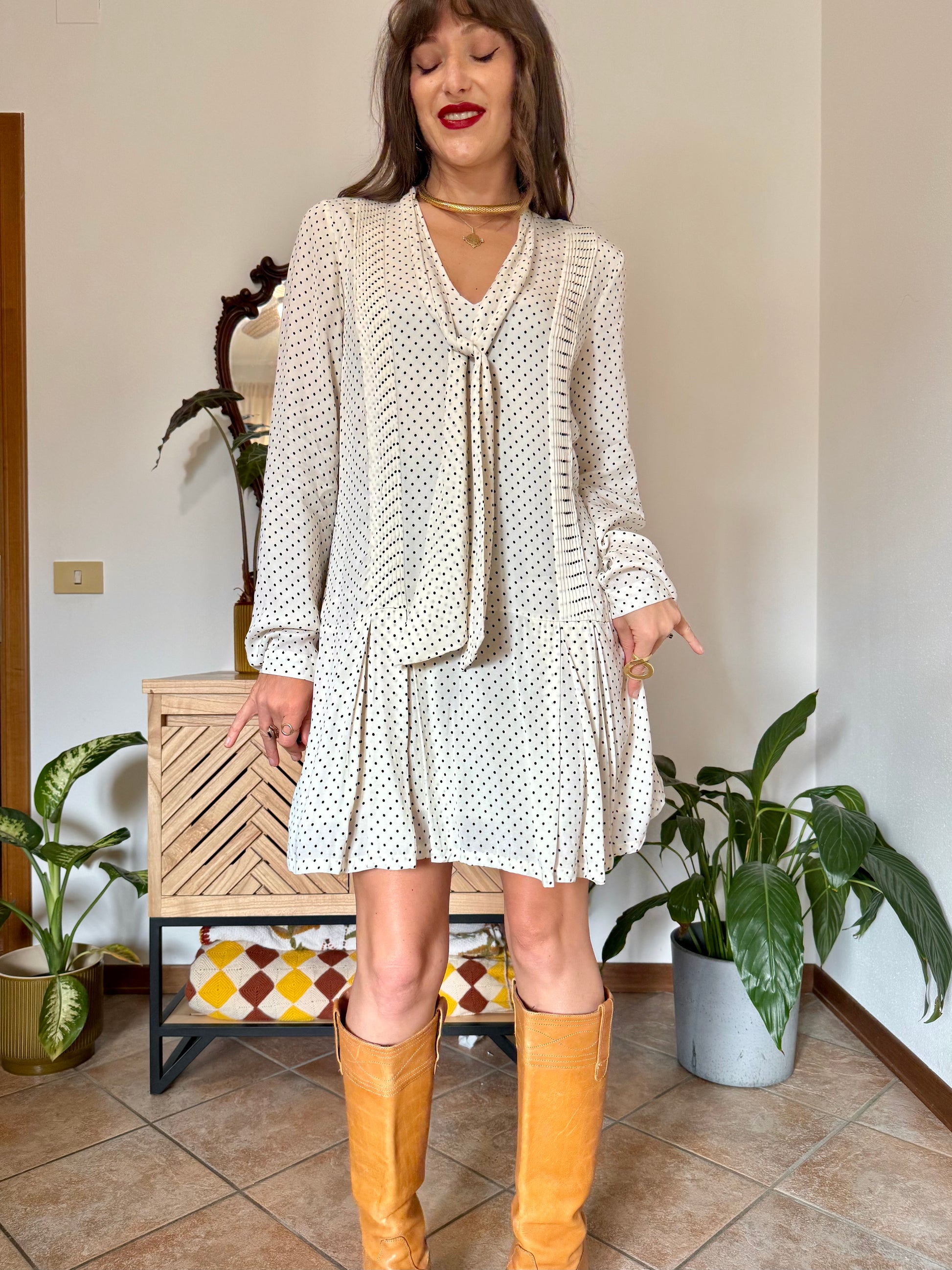 1990’s vintage cream pleated mini dress with black polkadots and bow tie neck