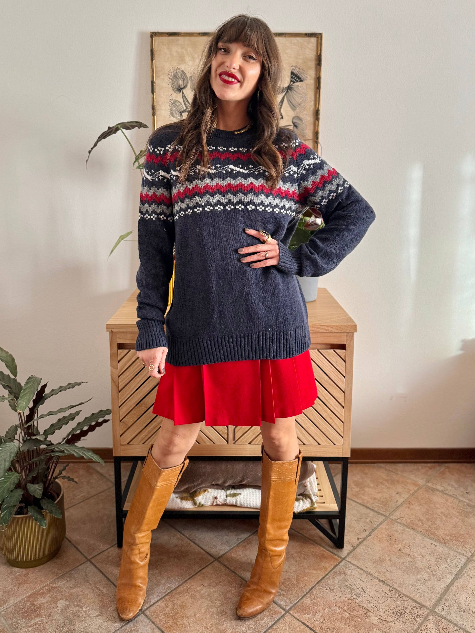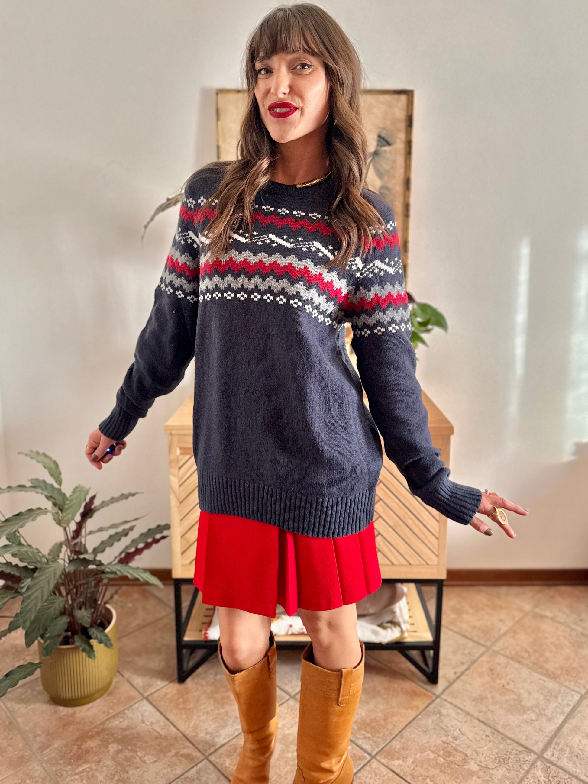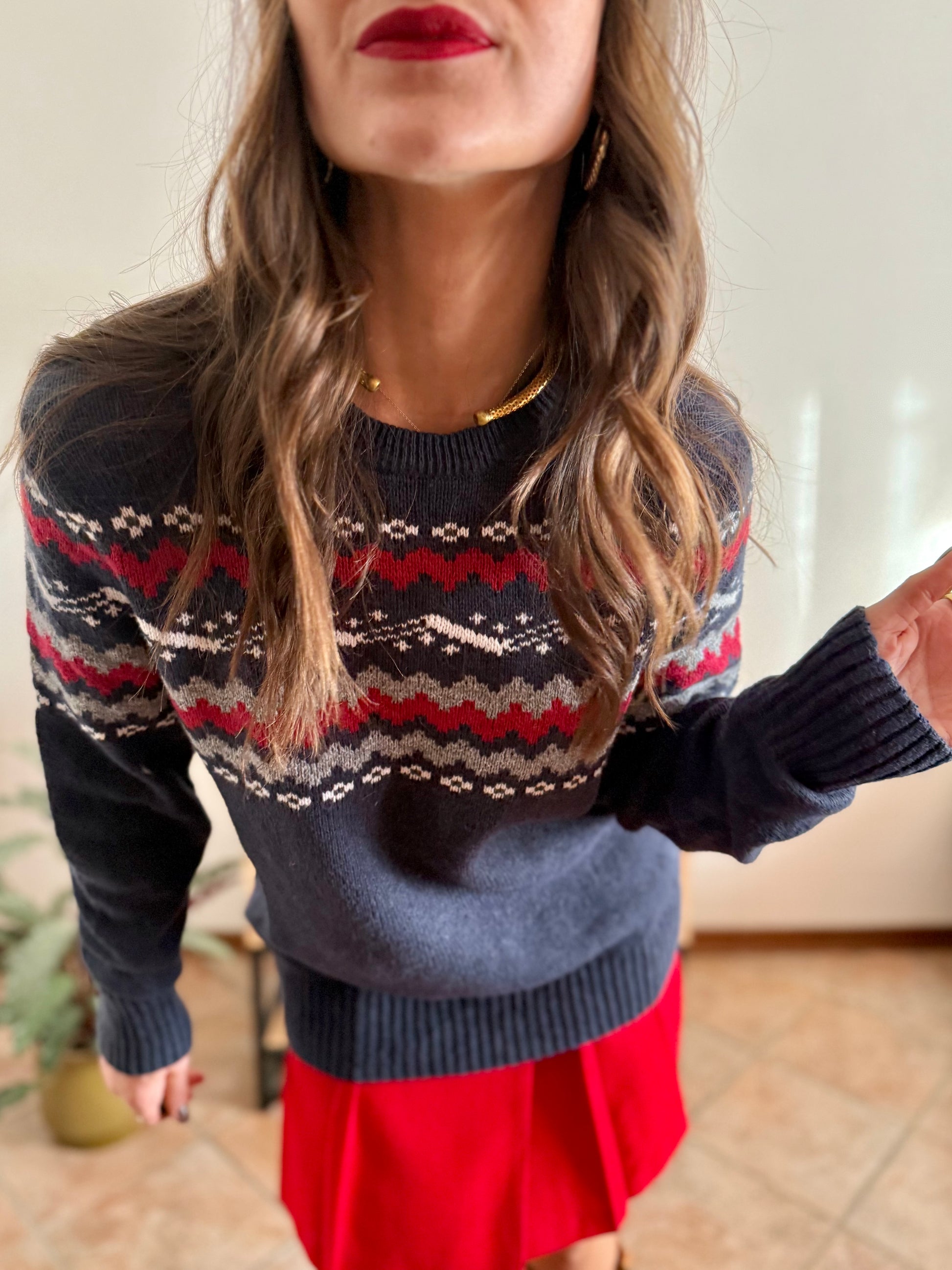 1990’s vintage navy blue knit pullover with red and cream geometric pattern