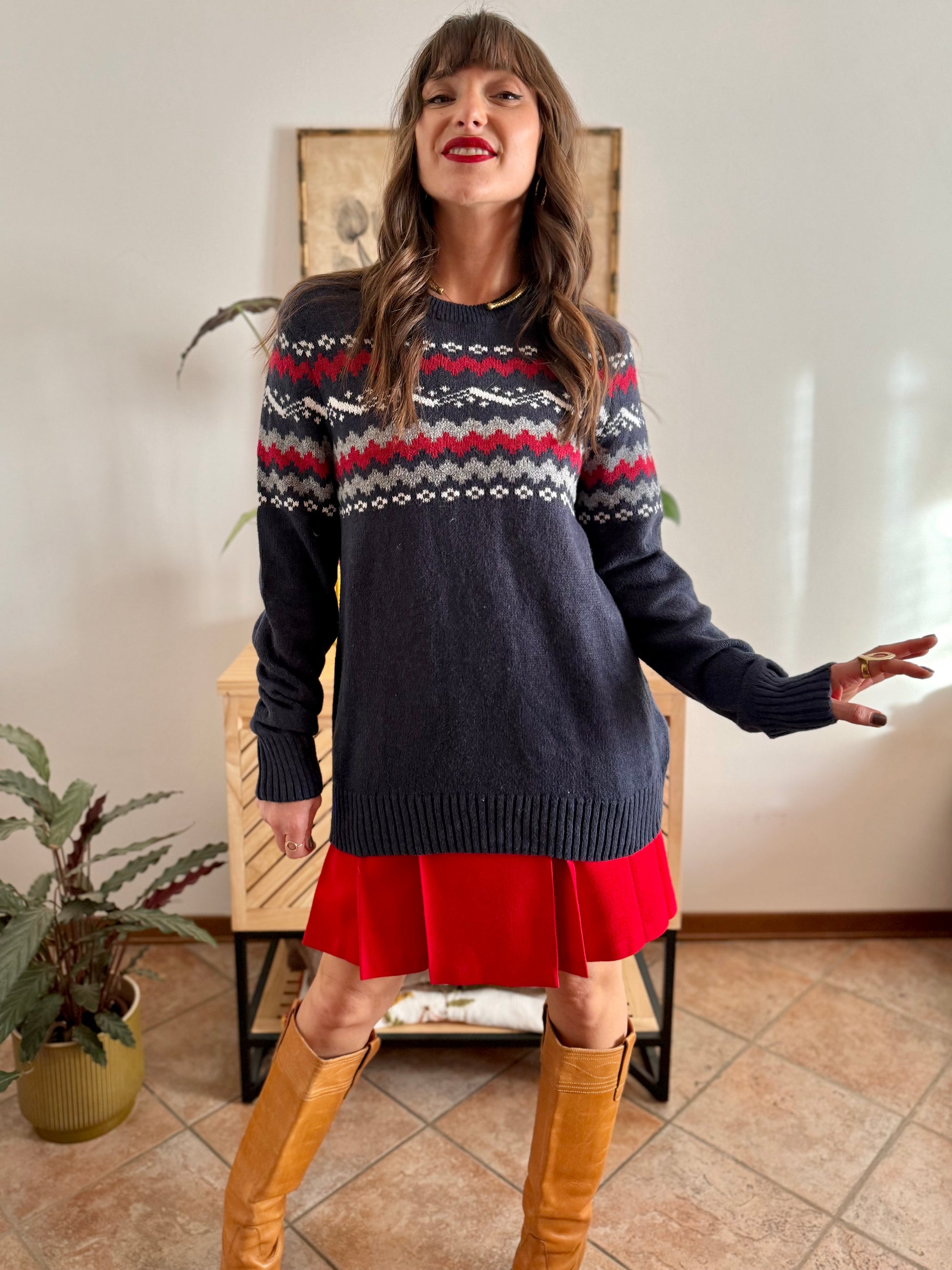 60% cotton 5% wool 28% polyester 7% nylon. Navy blue with red and cream geometric knit. Oversize fit. Size L (shoulders 44cm, bust 50cm, total length 75cm) all measurements taken flat from seam to seam