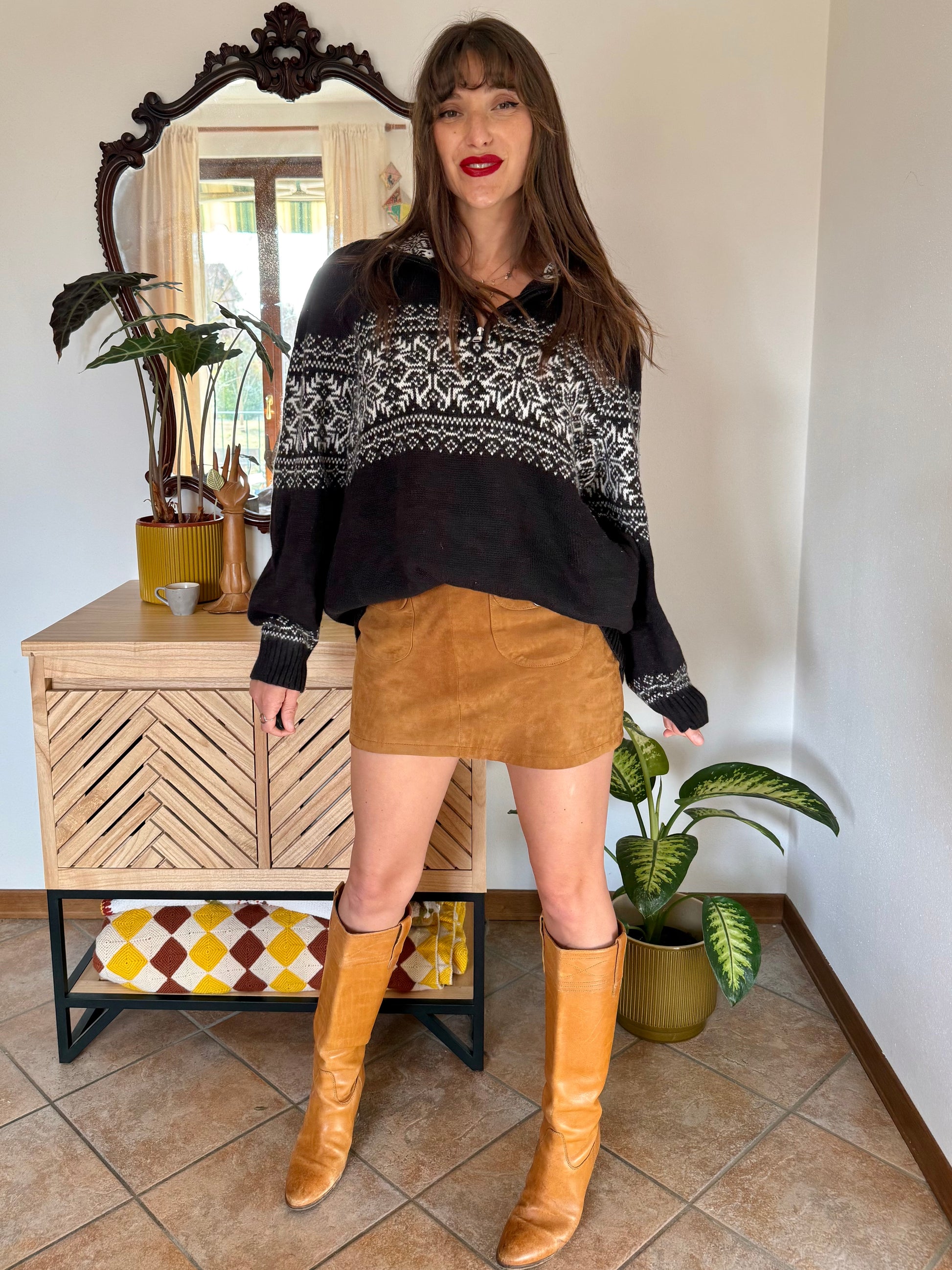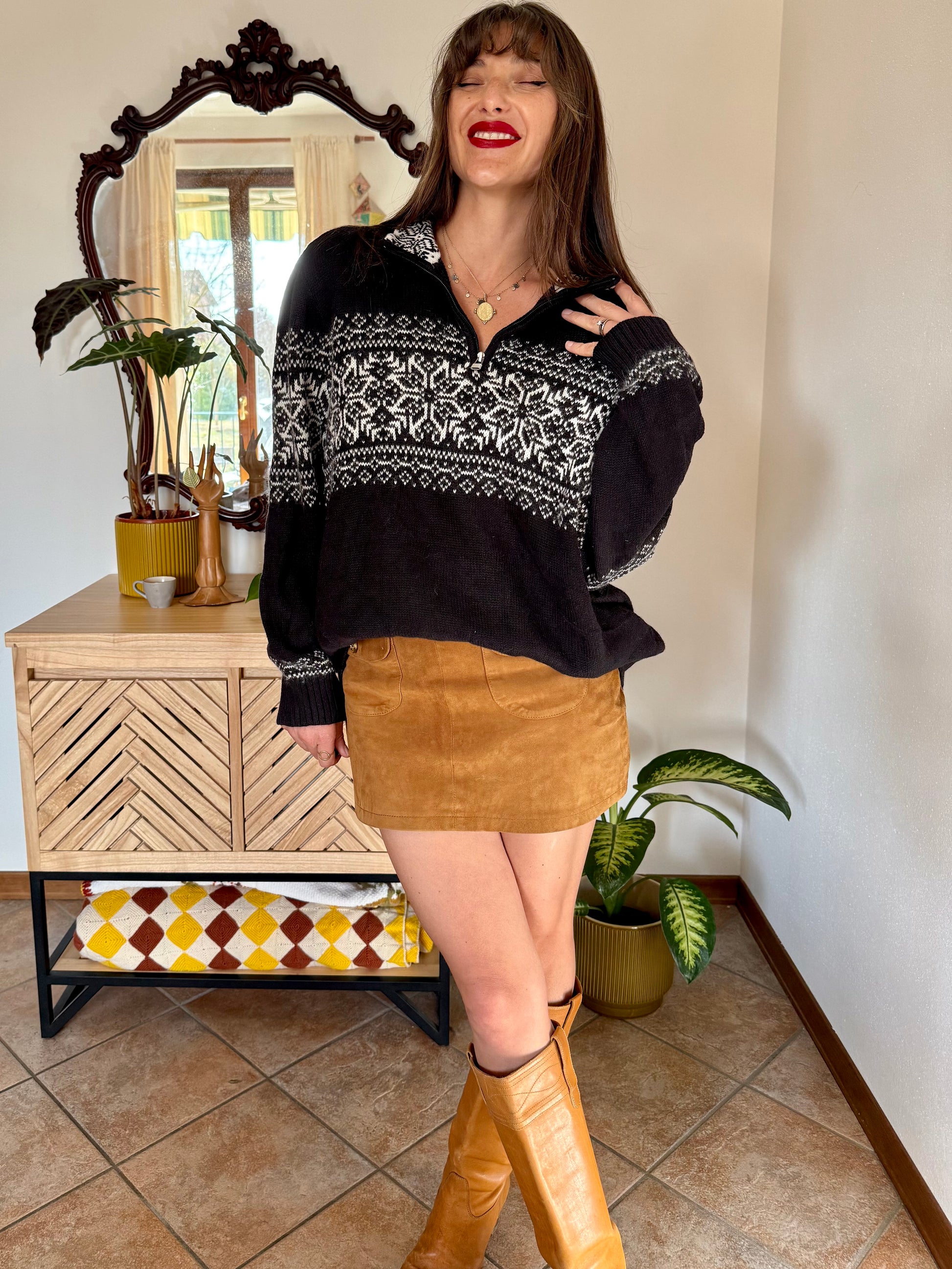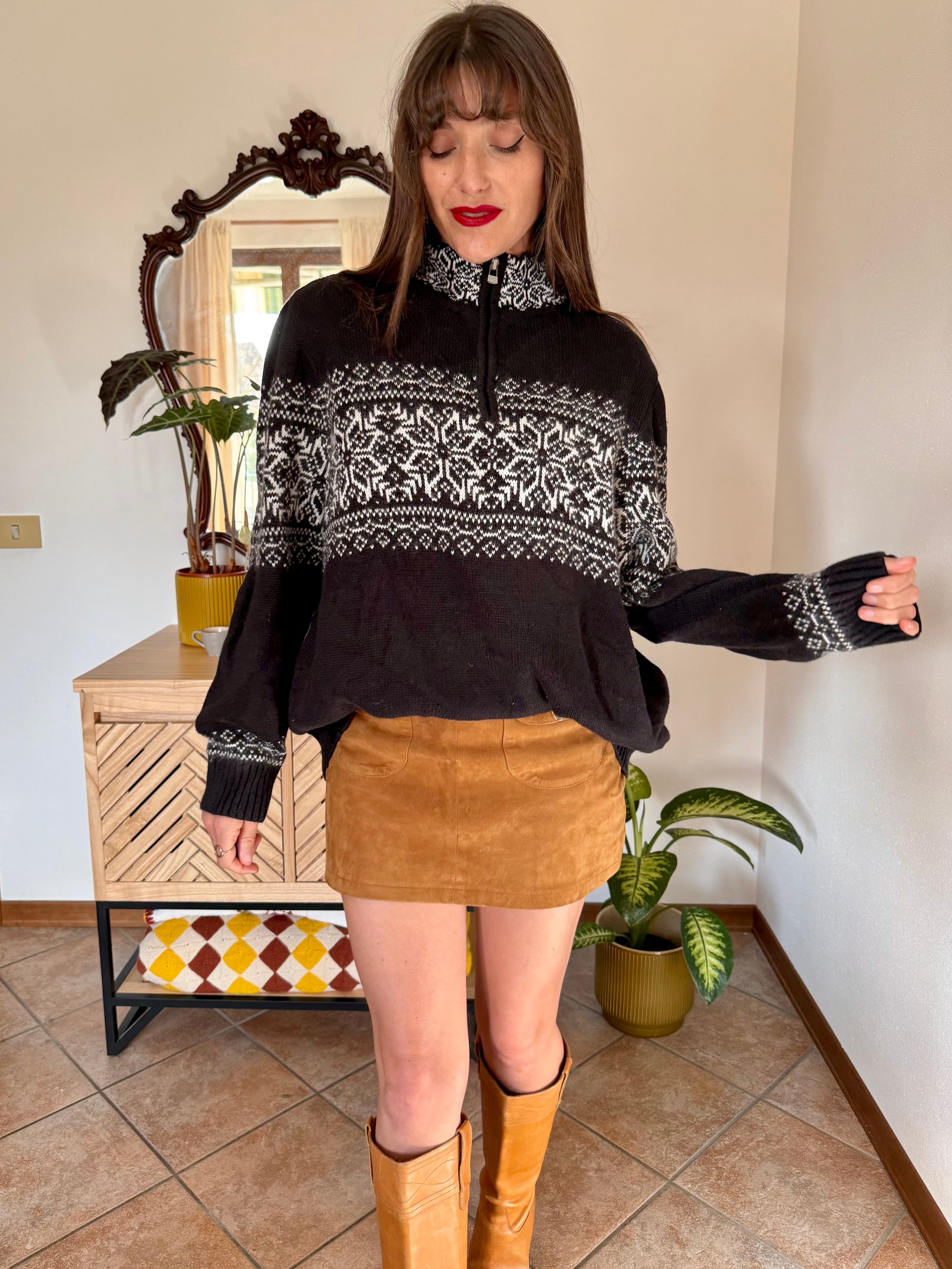 52% Ramie 38% cotton 9% nylon 1% other fiber. Super soft black and white oversize knit pullover. Zip up mock neck. Oversize fit. Size L (shoulders 46cm, bust 60cm, total length 72cm) all measurements taken flat from seam to seam