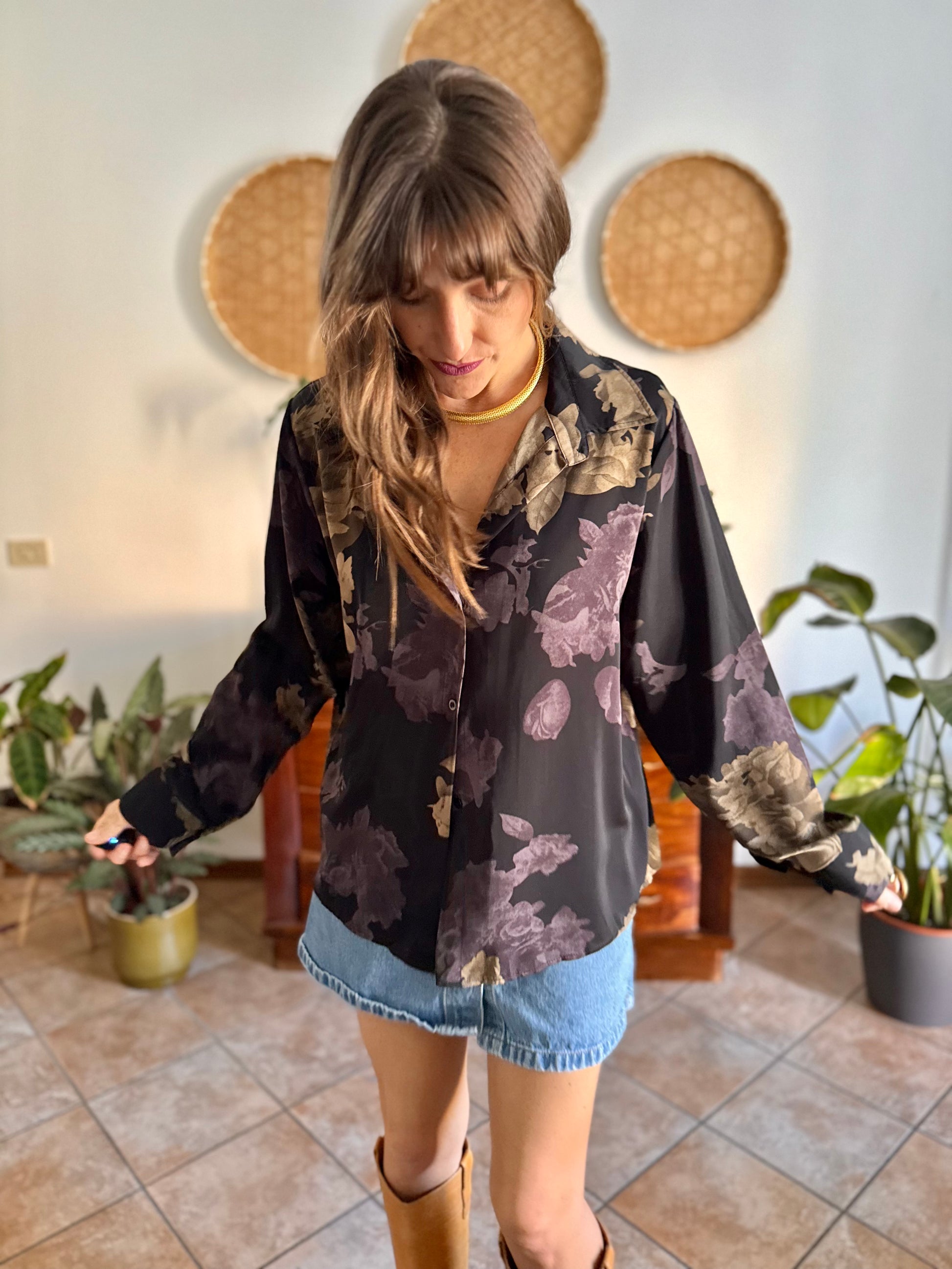 95% polyester 5% spandex. Black with purple and beige floral print. Button down. Oversize fit. Size XL (shoulders 46cm, bust 58cm, total length 70cm) all measurements taken flat from seam to seam