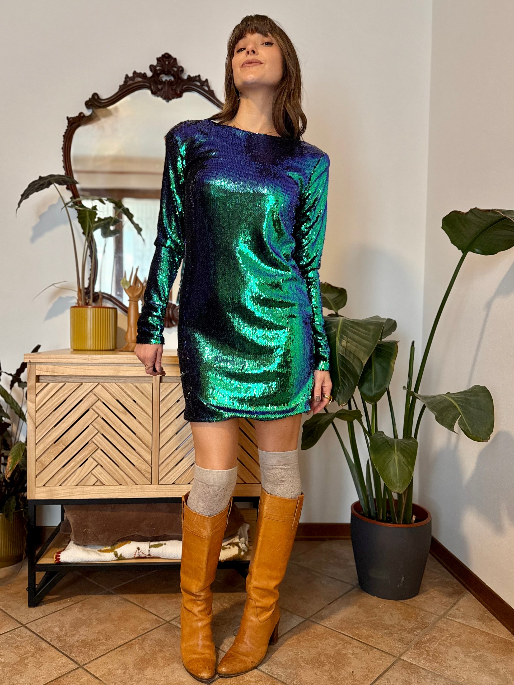 100% viscose lining. Blue, green and turquoise sequins that change color effect based on lighting. Open back. Black lining. Size M. (shoulders 44cm, bust 52cm, waist 44cm, hips 51cm, total length 88cm) all measurements taken flat from seam to seam