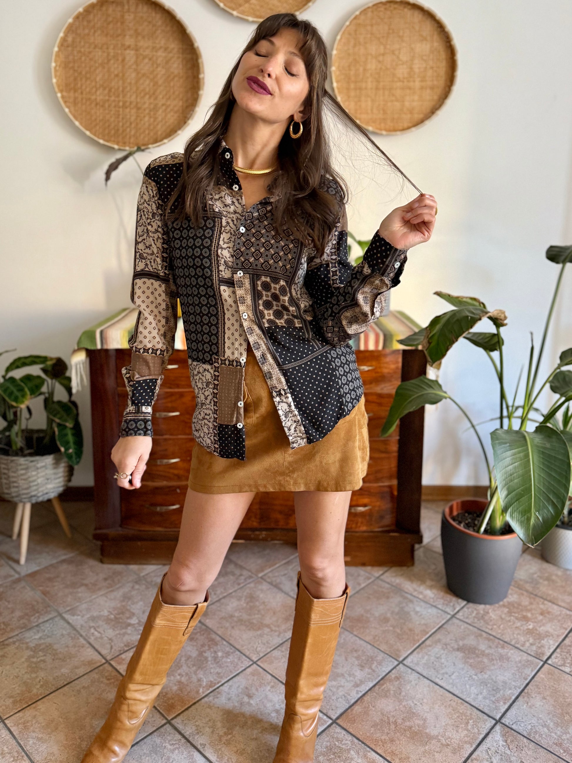 1990's vintage brown, black and grey patchwork floral and geometric print blouse