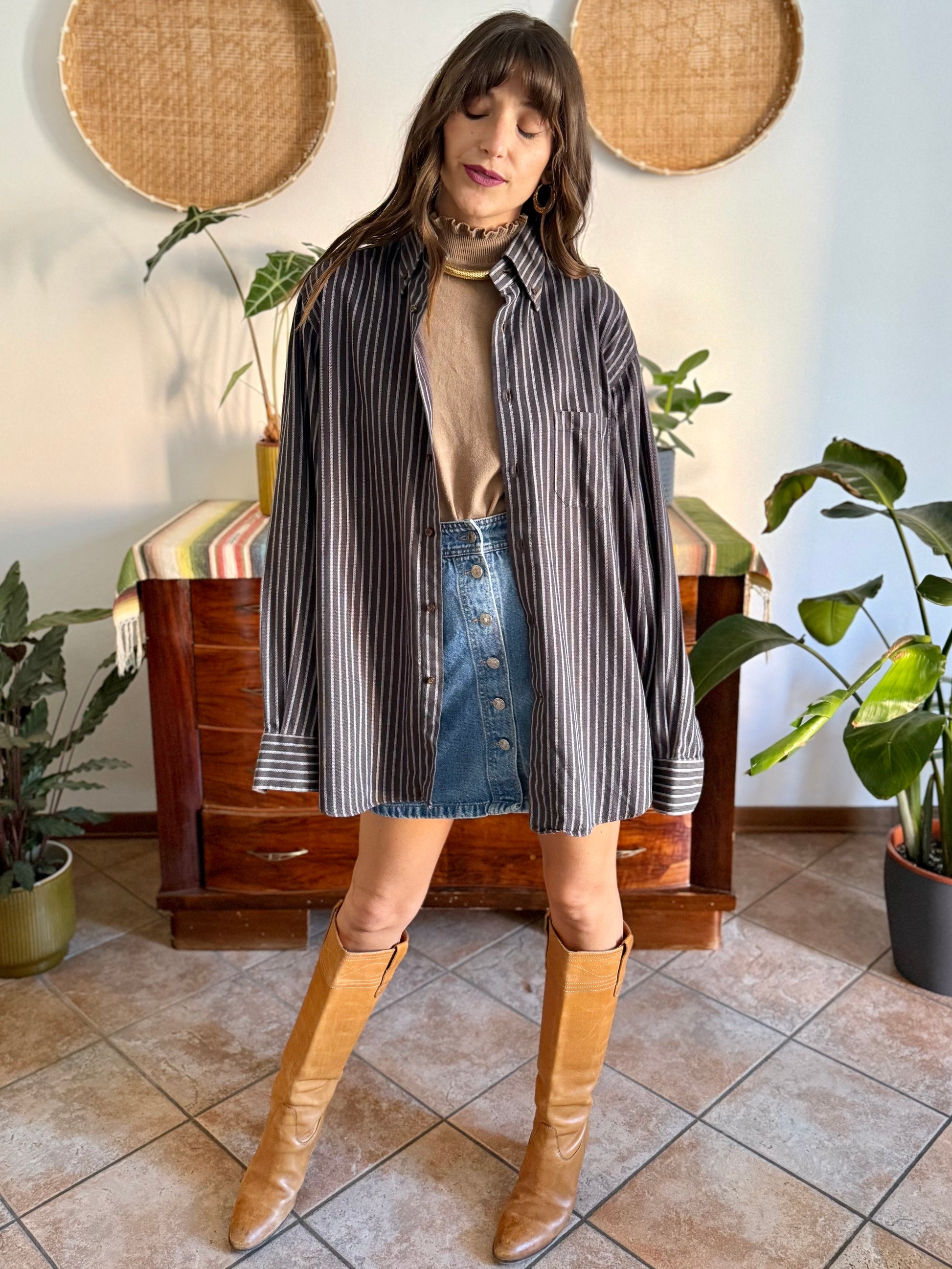 100% cotton. Chocolate brown with blue and tan vertical pin striping. Oversize fit. Unisex. Made in Italy. Size L (shoulders 48cm, bust 62cm, total length 77cm) all measurements taken flat from seam to seam