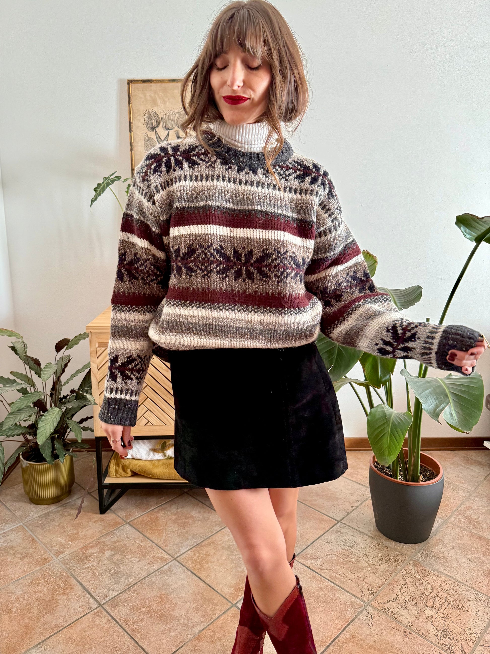 1990's vintage burgundy, grey and black geodetic stripe knit wool pullover