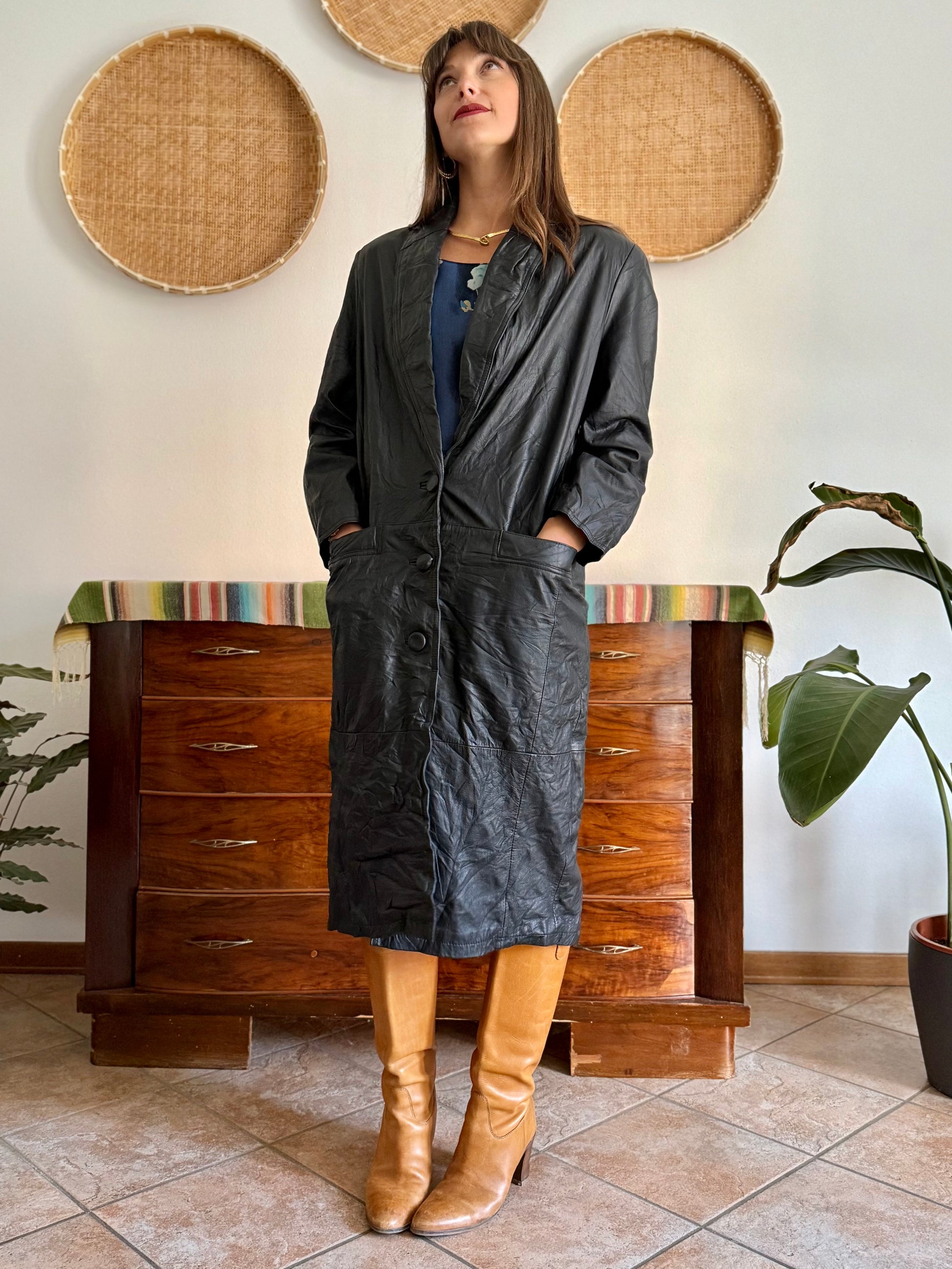 100% genuine leather. Butter soft black leather. Black satin lining. Leather buttons. Two pockets. Made in Korea. Size S (shoulders 46cm, bust 59cm, total length 114cm) all measurements taken flat from seam to seam