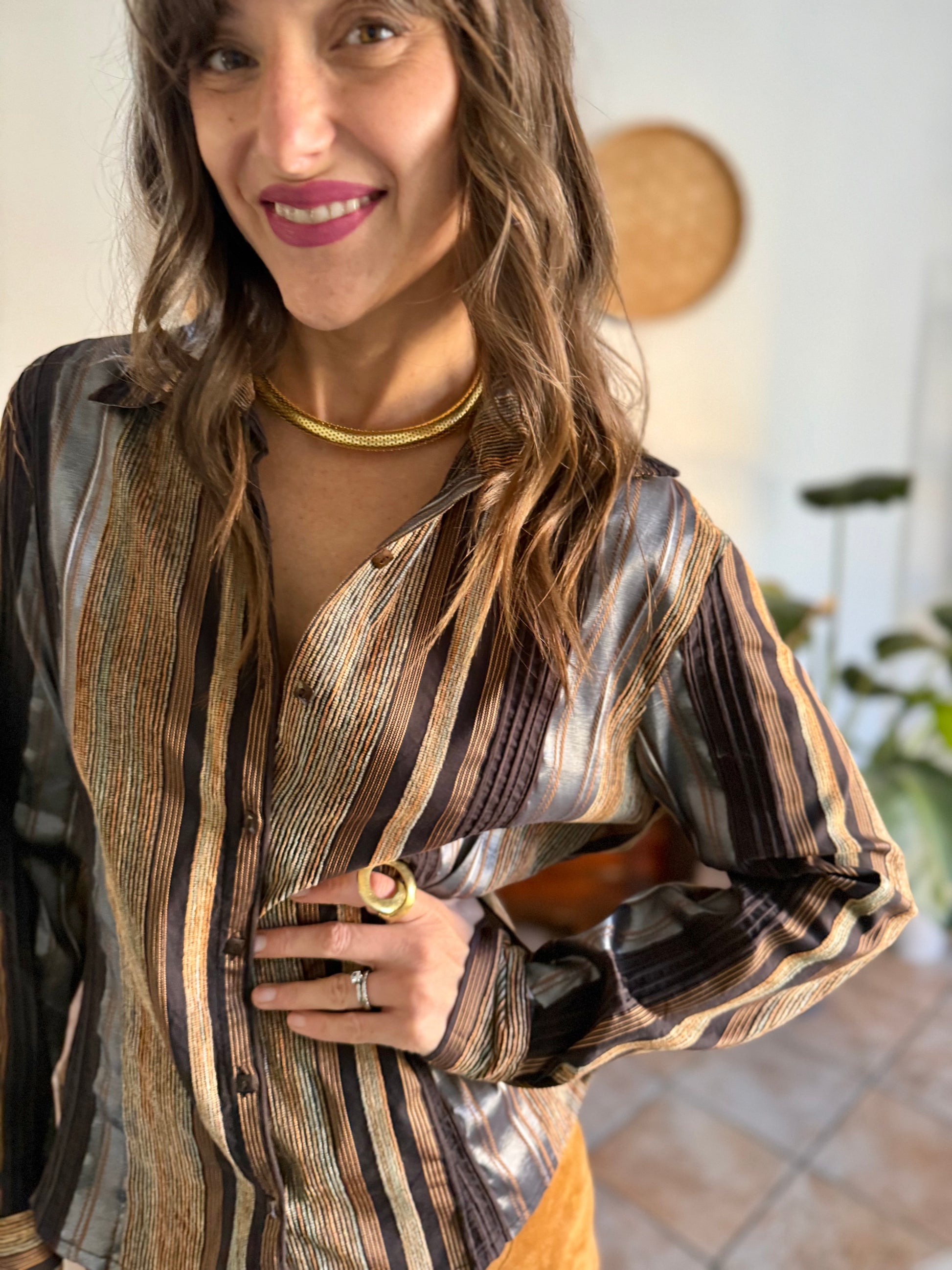 1990's vintage chocolate brown brown shirt with orange and grey velvet textured stripes